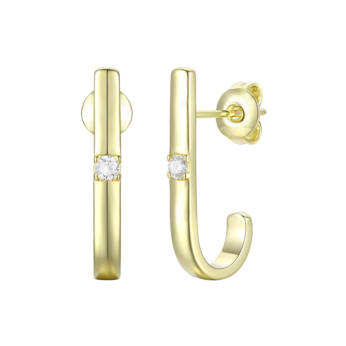 Sophisticated 14K Gold Plated Cubic Zirconia Open Hoop Earrings. These earrings feature interesting "J" design that is made out of curved bar, accented with clear round cubic zirconia stone. Crafted with 14K Gold Plating and it is secured with butterfly closure. Perfect piece of jewelry for stylish combinations. This item also makes a great gift as well.