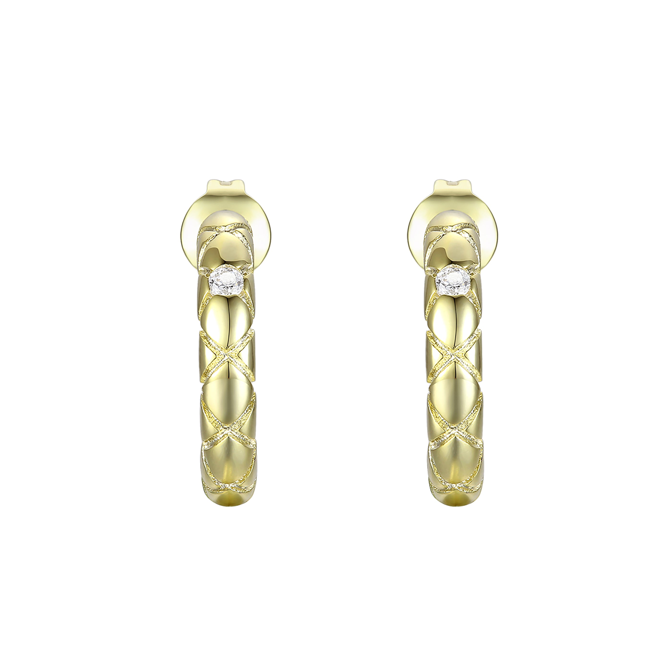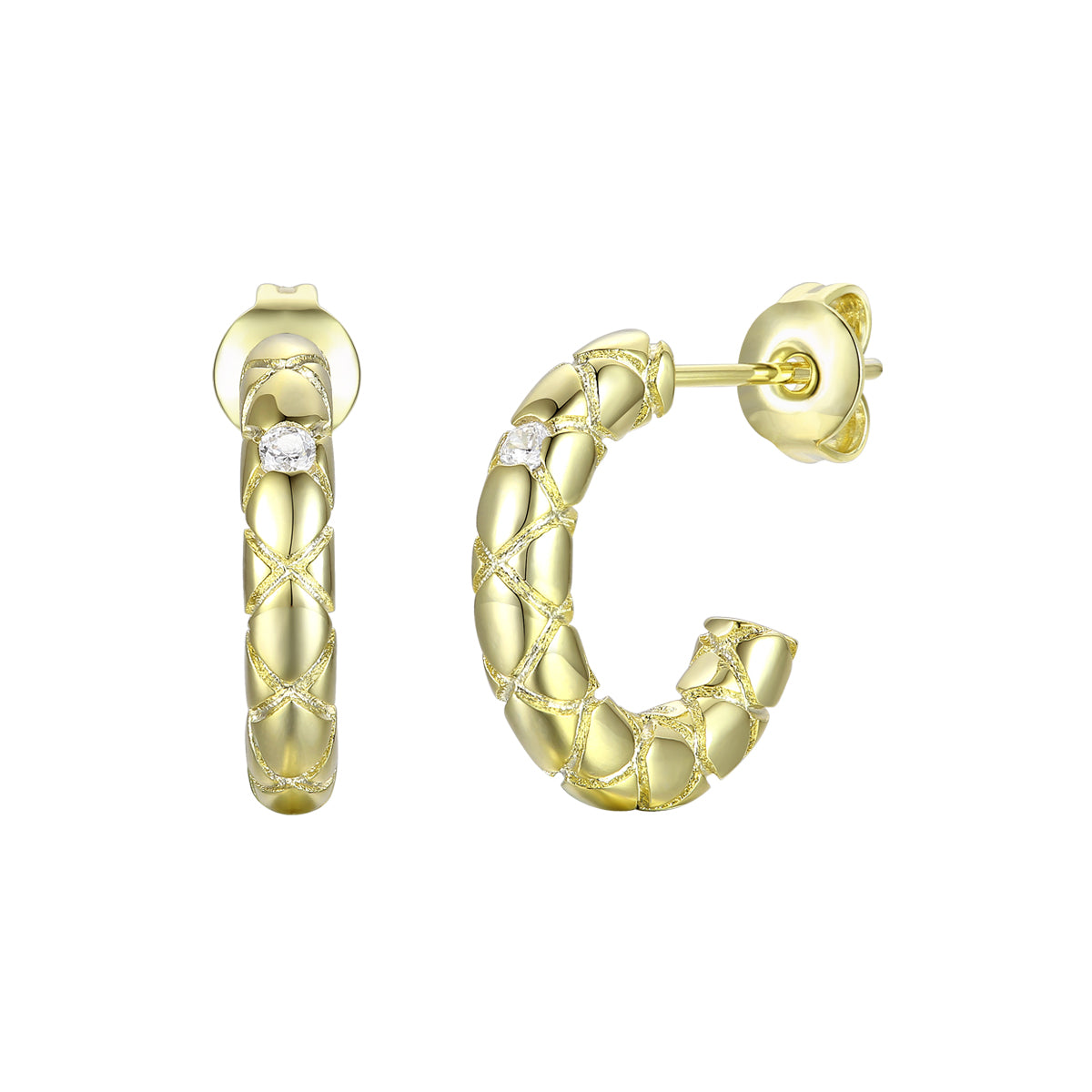 Stylish 14K Gold Plated Open Hoop Earrings. These Hoop earrings feature interesting hoop design, that is made out of small hoops with engraved structure, accented with clear round cubic zirconia stones, artfully crafted, making the perfect hoop. Crafted with 14K Gold Plating and secure with a butterfly closure. Perfect piece of jewelry for all combinations. These also make a sensational gift for a special birthday or occasion.