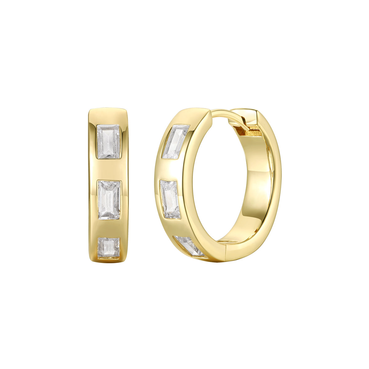 These fashionable hoops are classic yet right on-trend, perfect for day or night. These shiny earrings feature baguette cut cubic zirconias sparkling in bezel settings around the exterior, all finely crafted in brightly polished 14k yellow gold plated. Hinge backs and click-top posts keep these glam hoops secure.