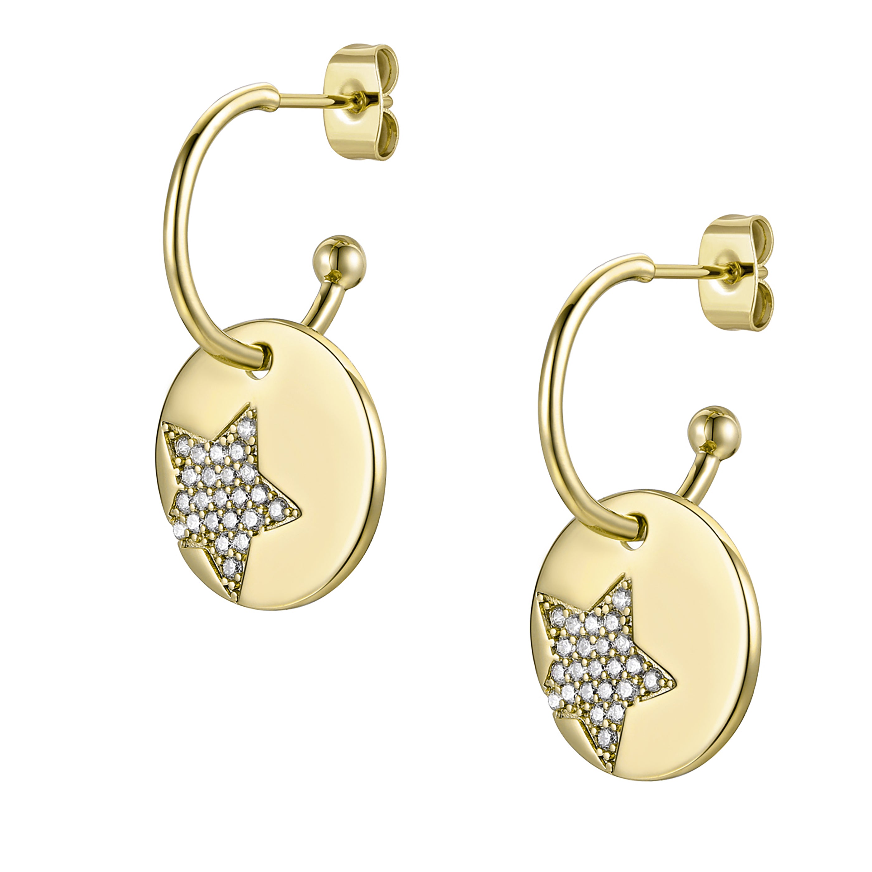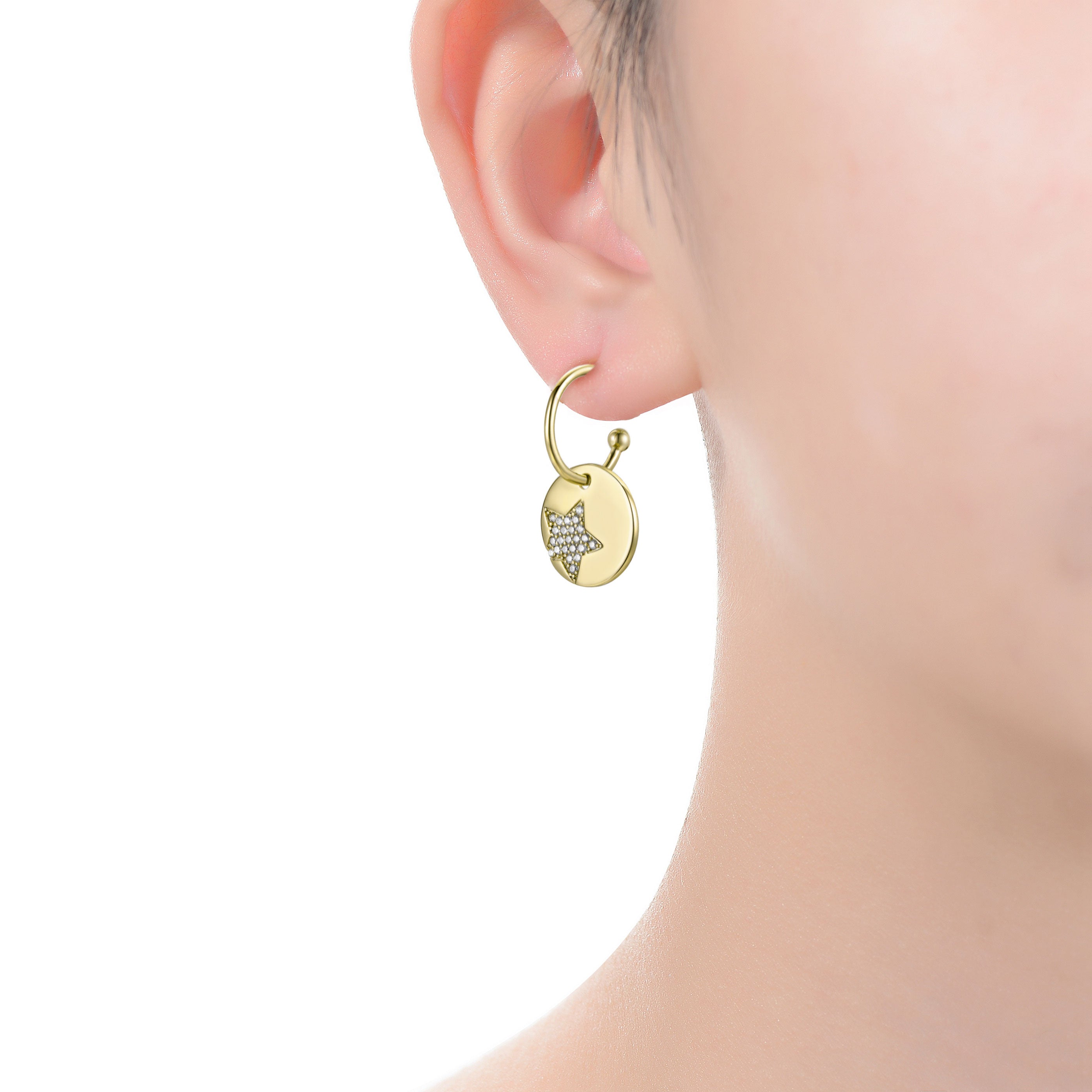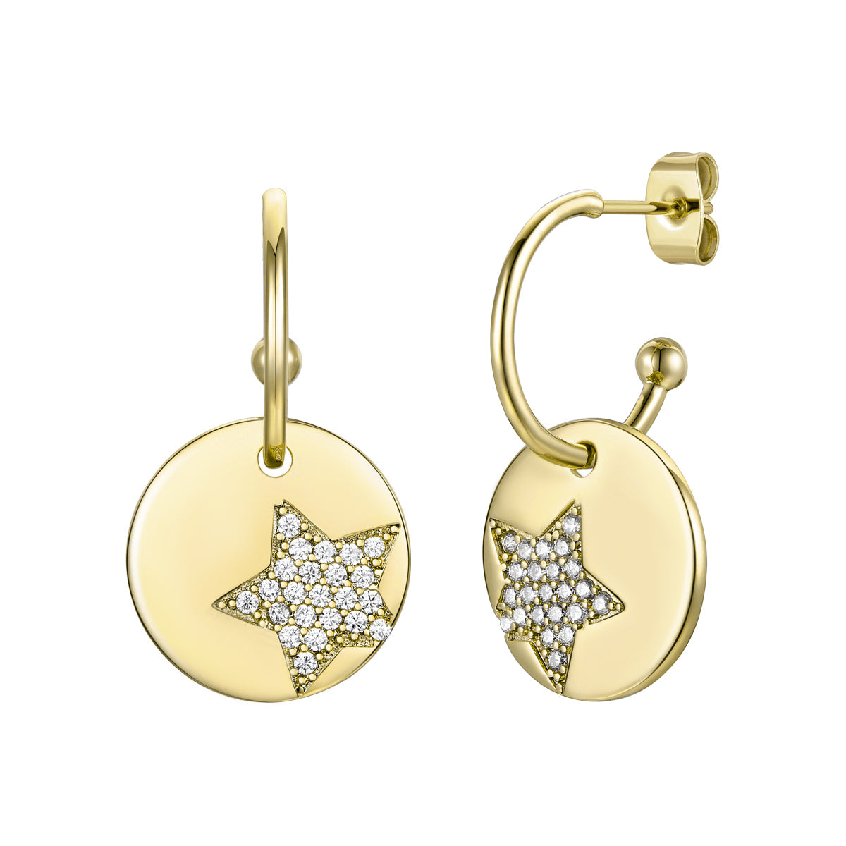 Shoot for the stars in trendy style wearing these super-cute hoop dangles. Glittering round brilliant cut cubic zirconias sprinkle the front in medallion drop stars. C-hoops give these pretty earrings extra movement, all finely crafted in 14k gold plating. Butterfly backs keep these pretty hoops secure.