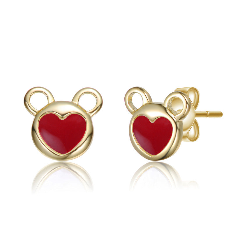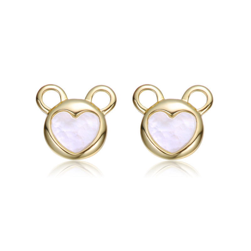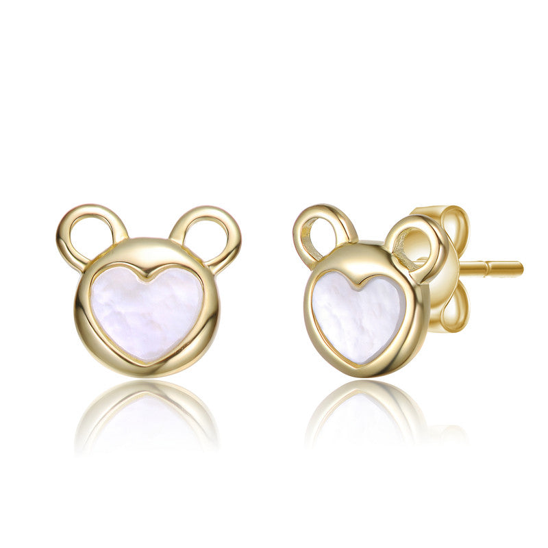 14K Gold Plated with White Mother Of Pearl Bear-Eared Heart Stud Earrings For Kids
