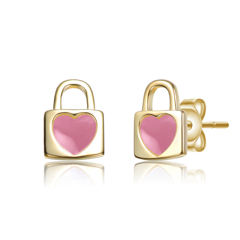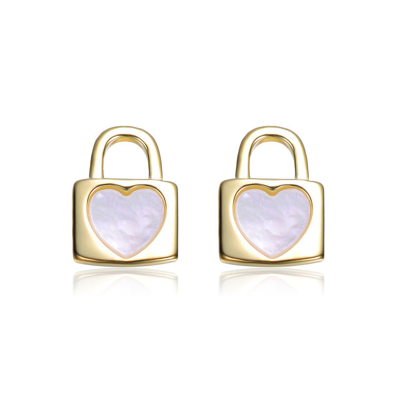 These elegant stud earrings blend romance and sophistication with their unique padlock and heart design. Crafted from radiant gold, each earring features a lustrous mother-of-pearl inlay, creating a soft, iridescent glow. The padlock symbolizes security, while the heart represents love, making this pair both meaningful and stylish. Perfect for daily wear or special occasions, these earrings offer a timeless charm with a modern twist.