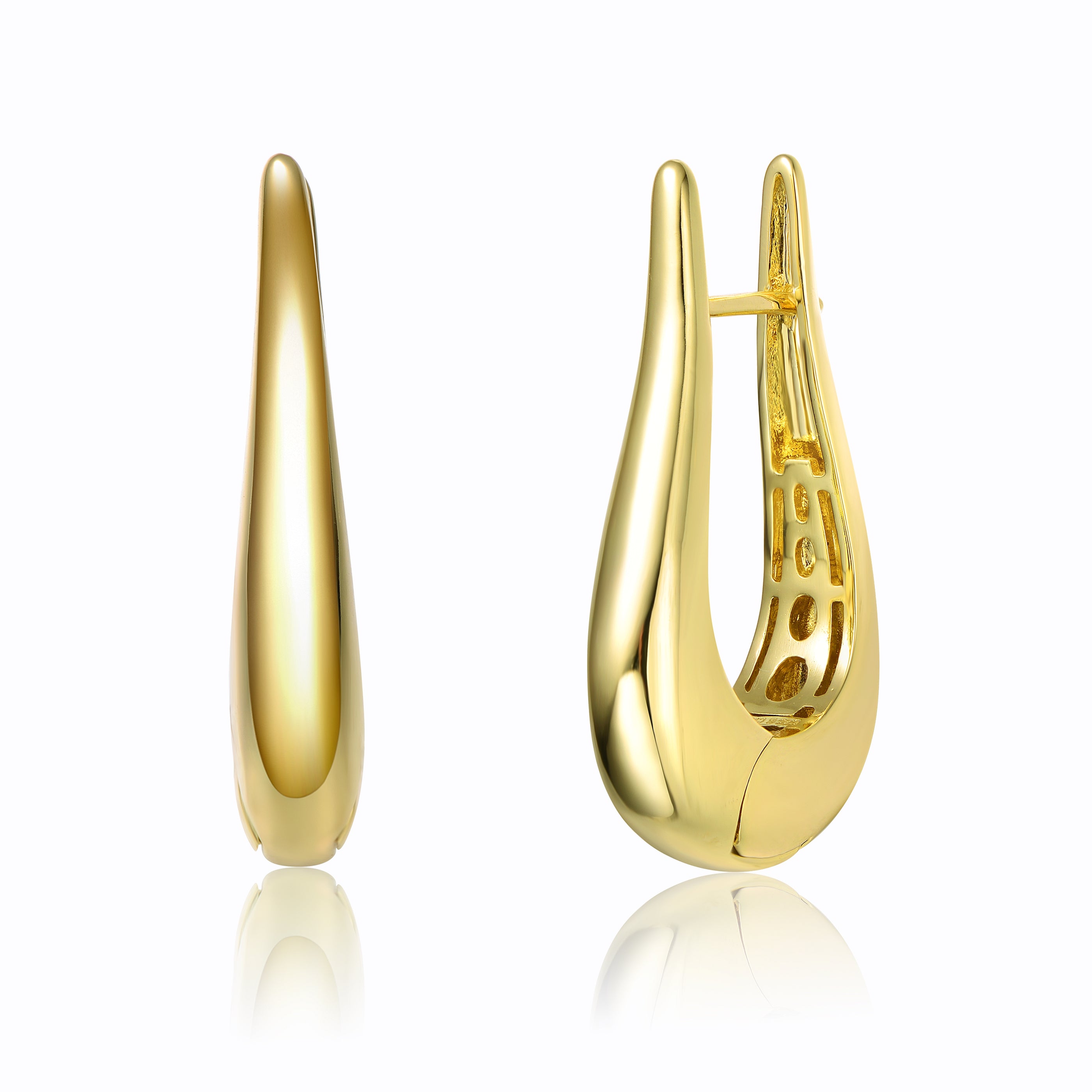 14k Yellow Gold Plated Oblong Oval Raindrop Hoop Earrings. These contemporary 14k yellow gold plated dangle earrings have a smooth tubular oblong oval shape hoop fashioned into a sleek raindrop, giving them a stunning sleekness, effortless and refined. Hinge backs and straight posts allow these earrings to sit securely on the earlobes when worn, offering an infinity fit sitting close to the earlobes.