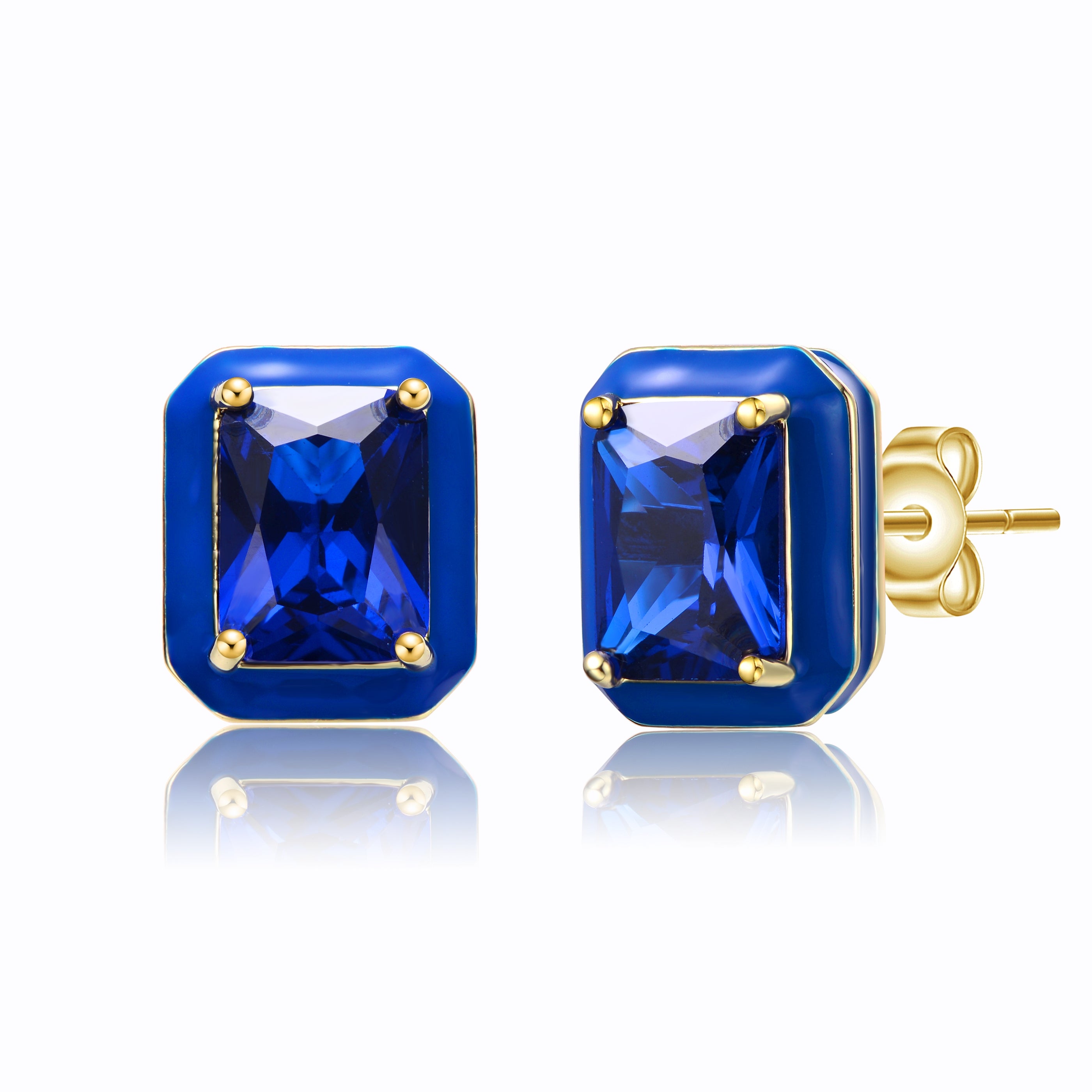 14k Yellow Gold Plated with Blue Sapphire Cubic Zirconia Radiant Blue Enamel Halo Stud Earrings.Celebrate your next holiday, anniversary, or birthday by gifting these stunning 14k yellow gold plated stud earrings to a loved one. Radiant cut deep blue sapphirecubic zirconias (September Birthstone) secured in four-prong settings offset the blue enamel frame halo. Butterfly backs keep these vibrant studs secure, perfect for adding a colorful, shiny touch to your casual, work, or nightwear.