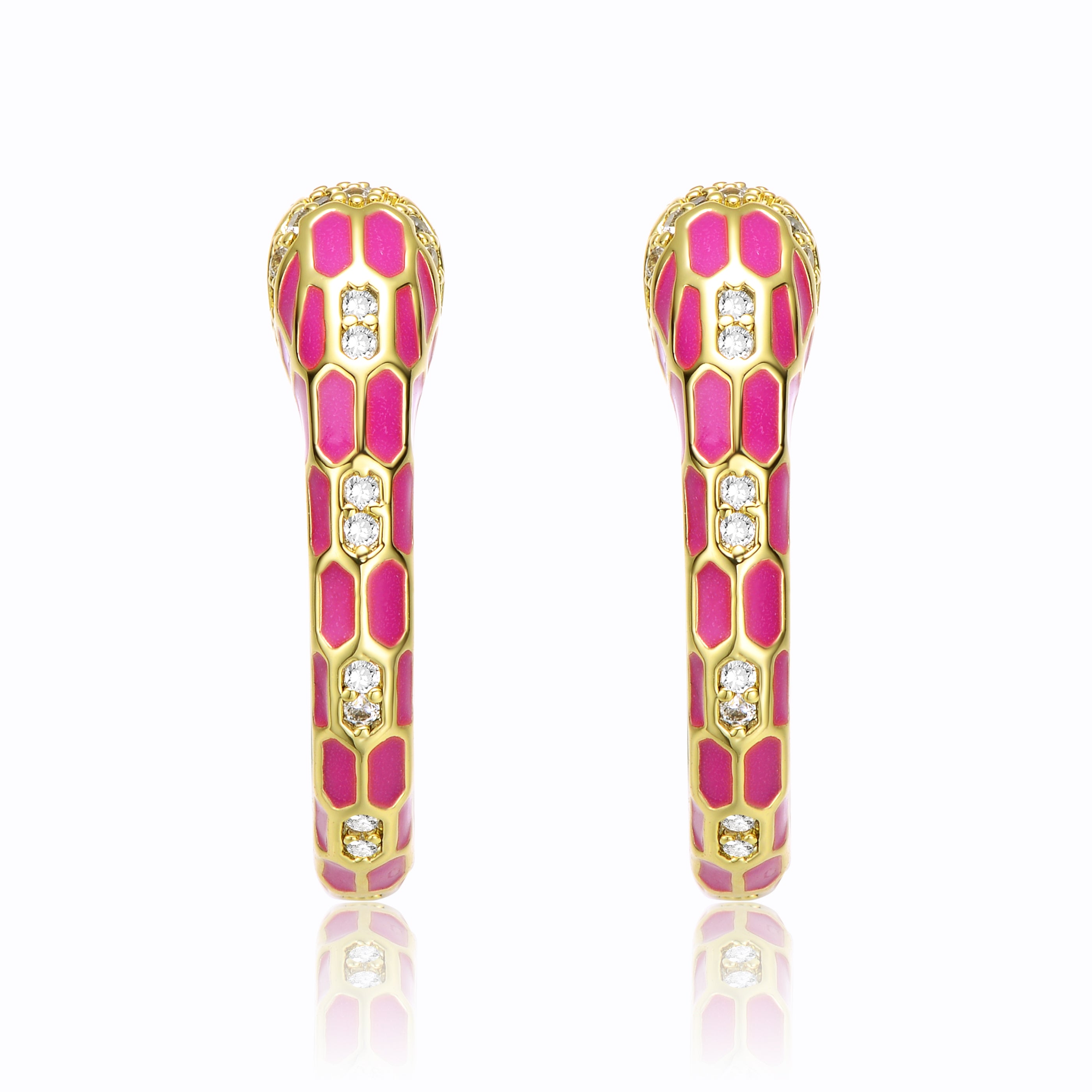 14k Yellow Gold Plated with Cubic Zirconia Pink Enamel Python Snake C-Hoop Earrings. These brightly polished 14k yellow gold c-hoop earrings feature rich pink enamel scales on the slithering python snake, bringing it a vibrancy that is super-cute and made to get noticed. Sparkling round brilliant cut cubic zirconias in the eyes and top of the head give these earrings luxury, all finished with butterfly backs for pierced ears.