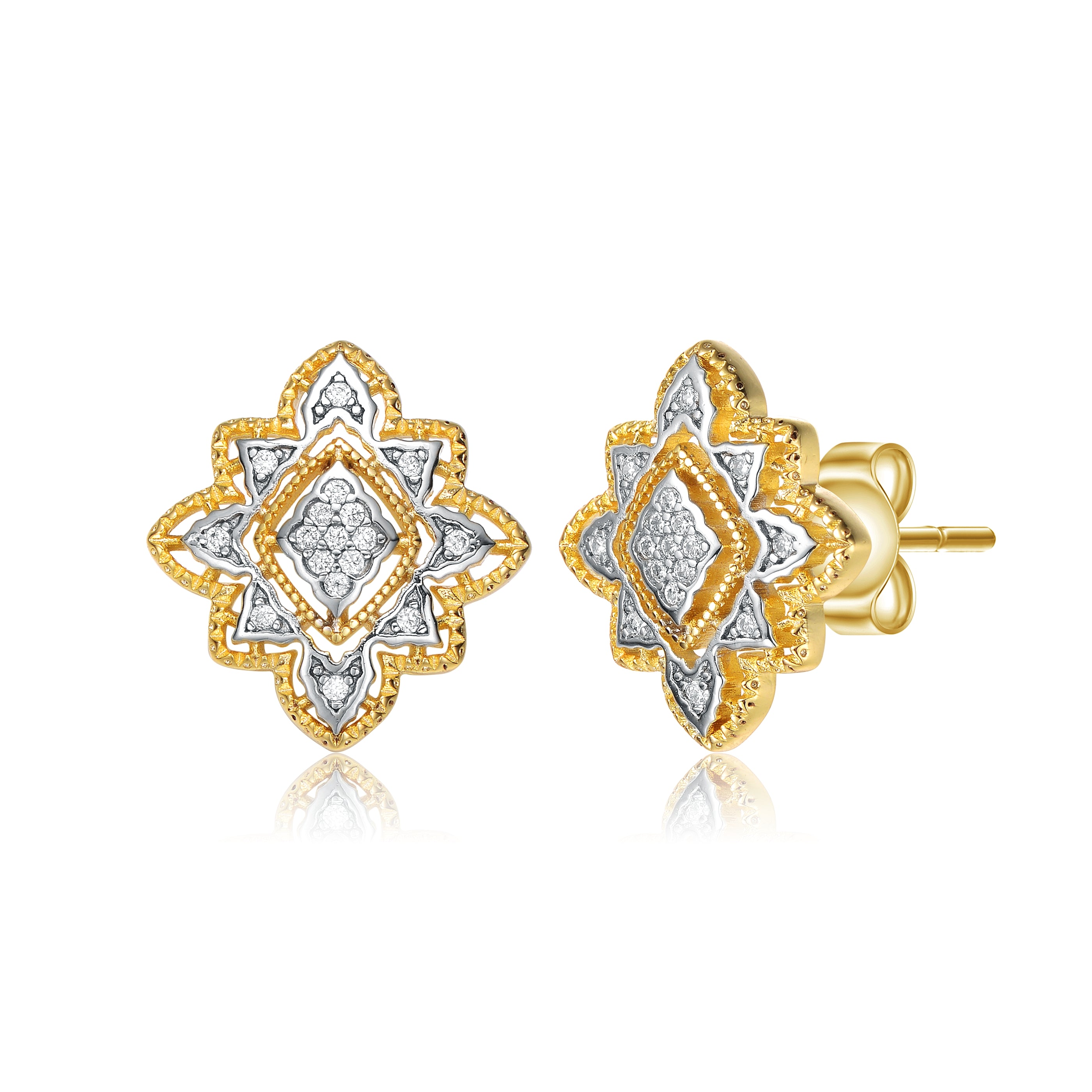 Modern 14k gold plated and cubic zirconia floral stud earrings. These stud earrings feature interesting design that consists of two tone nature inspired ornament, where the plating changes alternatly, accented with small clear round cubic zicronia stones in the center, as well as on the edges of the frame. The small clear round cubic zirconia stones are set in decorative prong setting, artfully crafted to make the perfect earring. Crafted with rhodium and 14k gold plating and it is secured with butterfly closure. Perfect piece of jewelry for stylish combinations. This also makes a sensational gift for a special birthday or occasion.