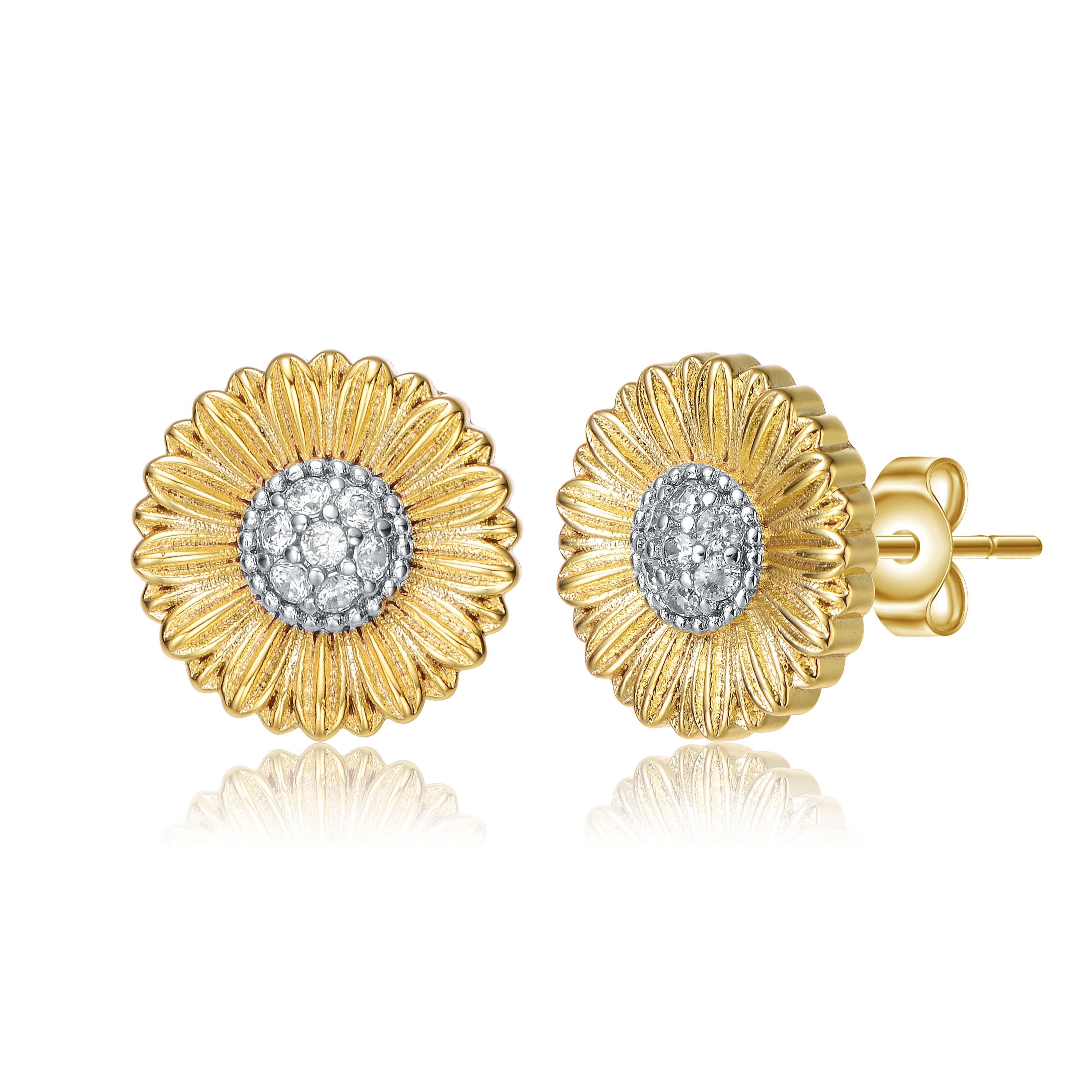 Stylish 14k gold plated and cubic zirconia floral stud earrings. These stud earrings feature interesting flower design that consists of two tone nature inspired ornament, where the petals are made out of 14k gold plating and the rhodium plated center is accented with small clear round cubic zicronia stones. Crafted with rhodium and 14k gold plating and it is secured with butterfly closure. Perfect piece of jewelry for stylish combinations. This also makes a sensational gift for a special birthday or occasion.