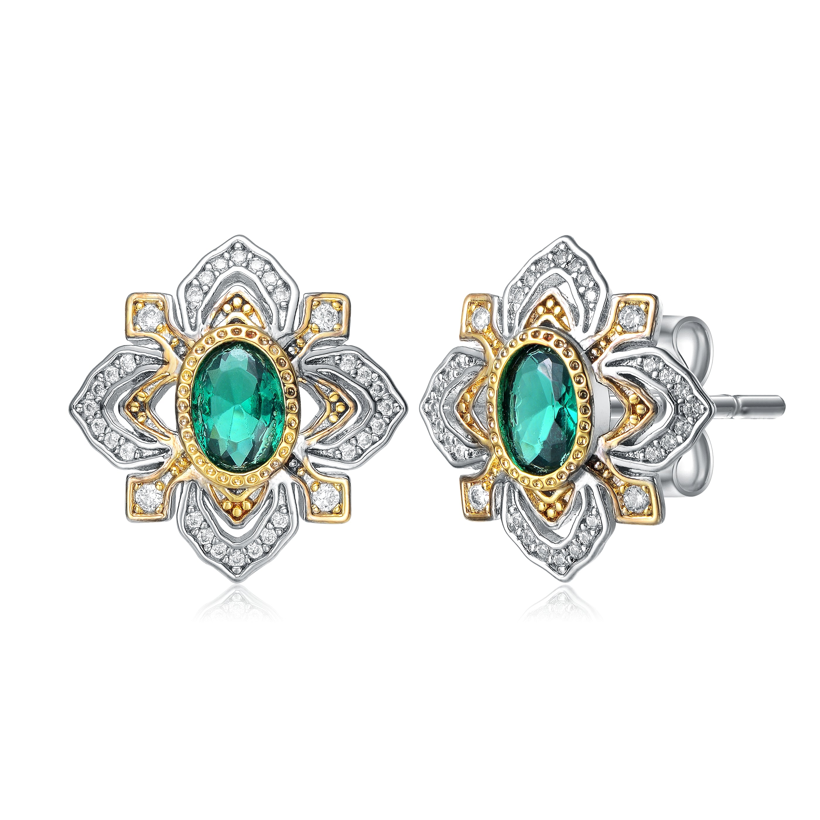 Elegant rhodium and 14k gold plated emerald cubic zirconia stud earrings. These stud earrings feature flower design that consists of artfully crafted two tone petals. The petals are changing aternately and are paved with small clear round cubic zicronia stones. The center features large oval emerald cubic zirconia stone. Crafted with rhodium and 14k gold plating and it is secured with butterfly closure. Perfect piece of jewelry for stylish combinations. This also makes a sensational gift for a special birthday or occasion.