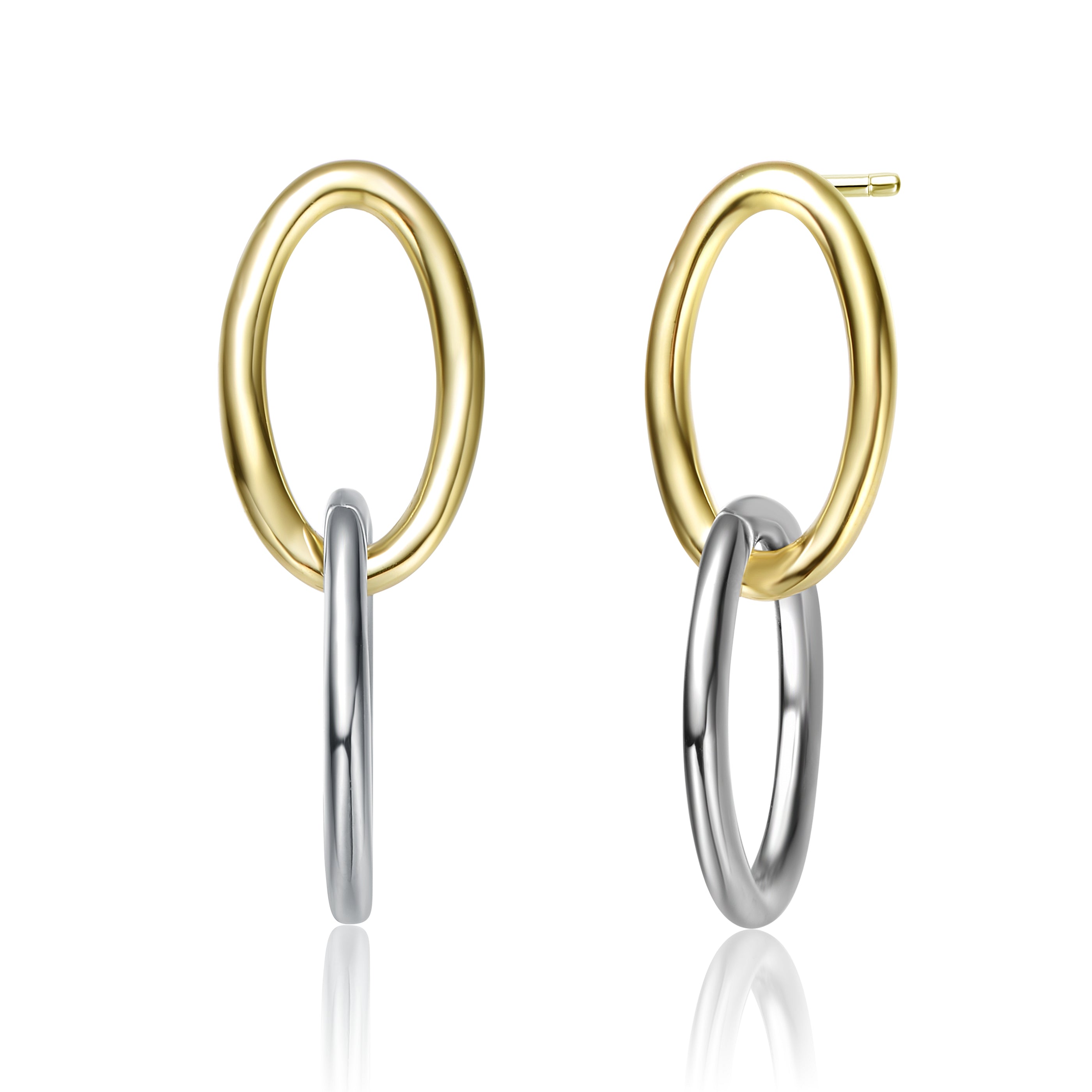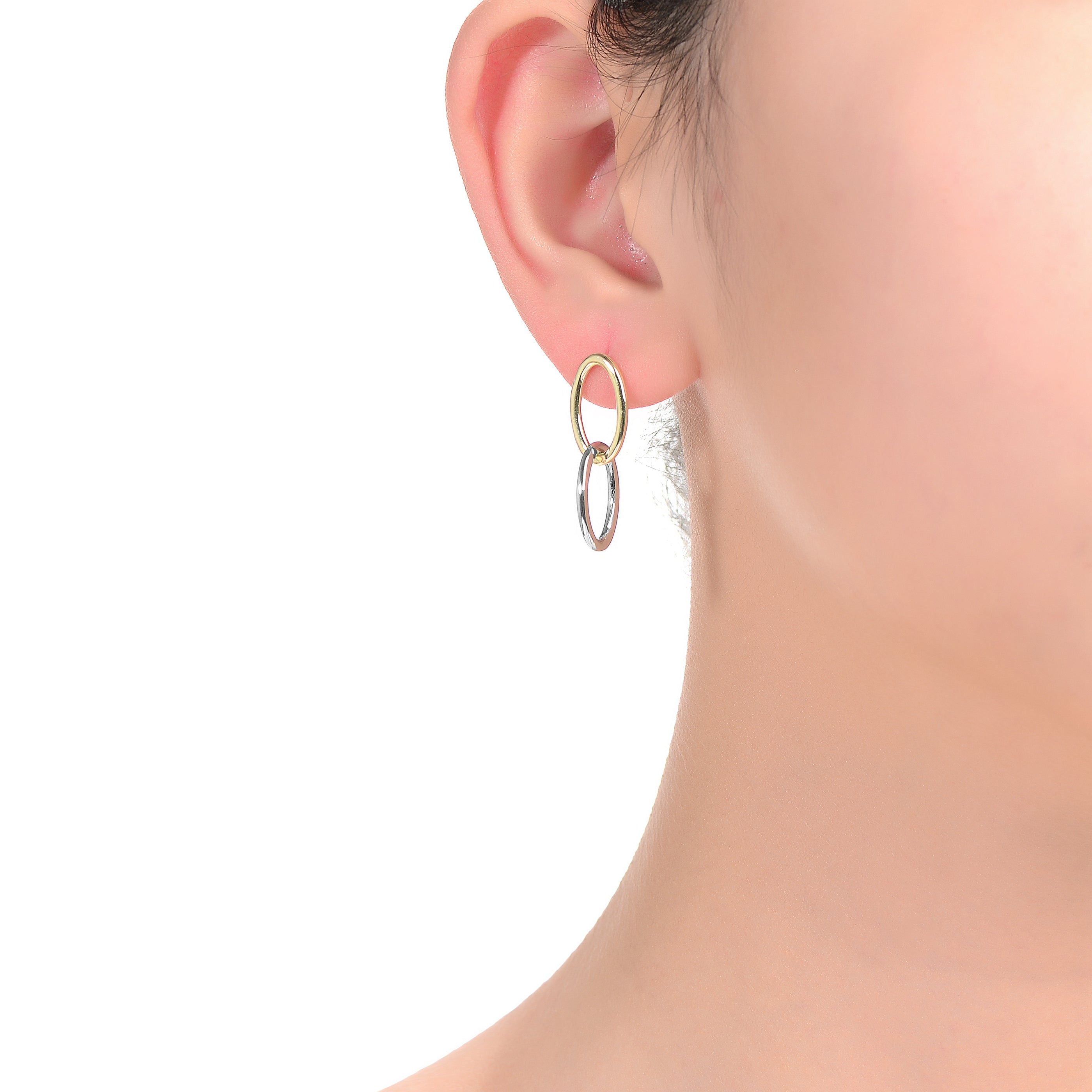 Stylish 14k gold plated two tone oval drop earrings. This design features two oval shaped metal frames that are intertwined in the center. These earrings have rhodium and 14k gold plating and secure with butterfly closure. Makes a great gift as well.