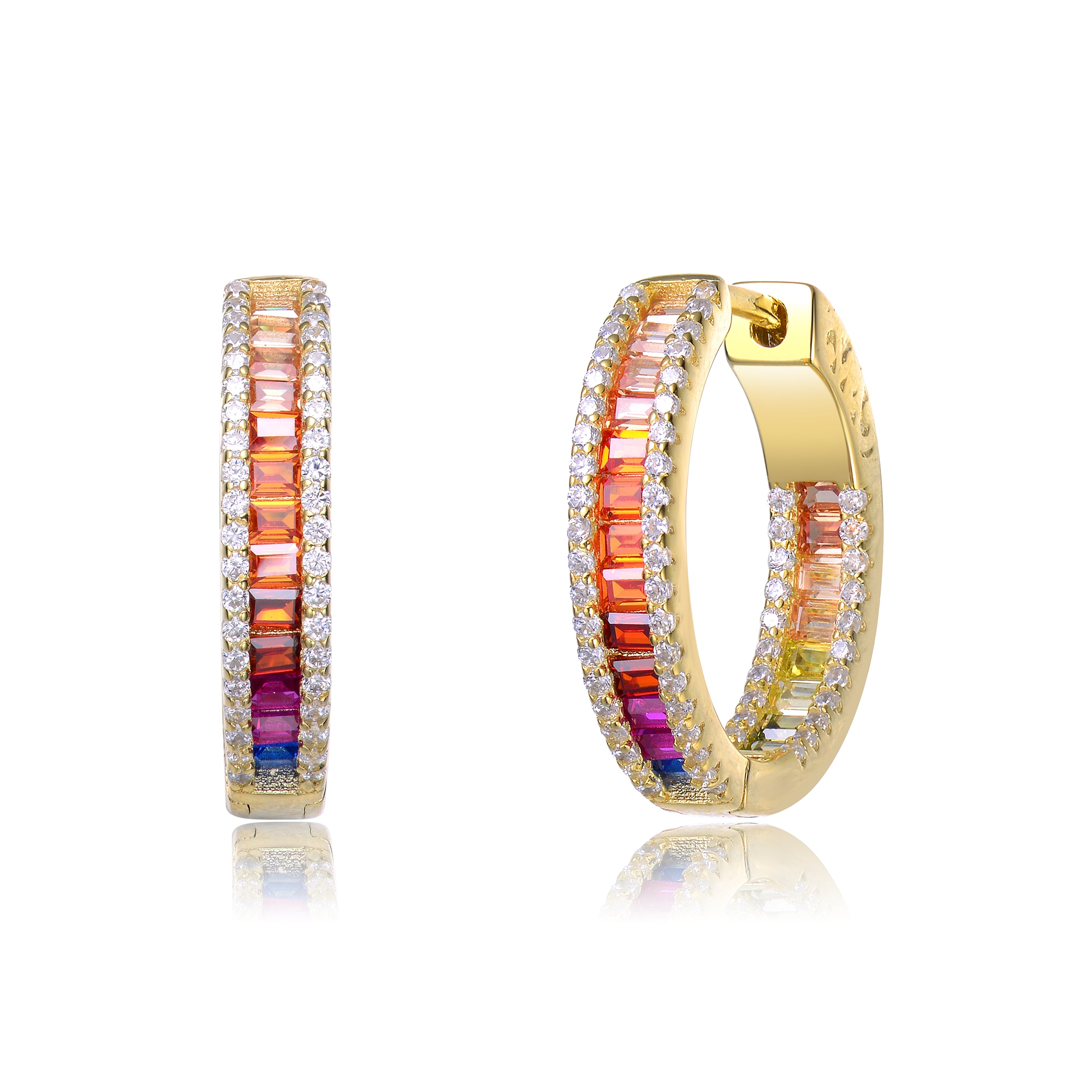 One of a kind 14k gold plated multi color cubic zirconia hoop earrings. The pair features multi colored baguette cubic zirconia stones in the center of the frame, accented by small clear round cubic zirconia set on the rounded frame. Crafted of 14k gold plating and secure with a hinged snap back closure. Makes a great gift as well.