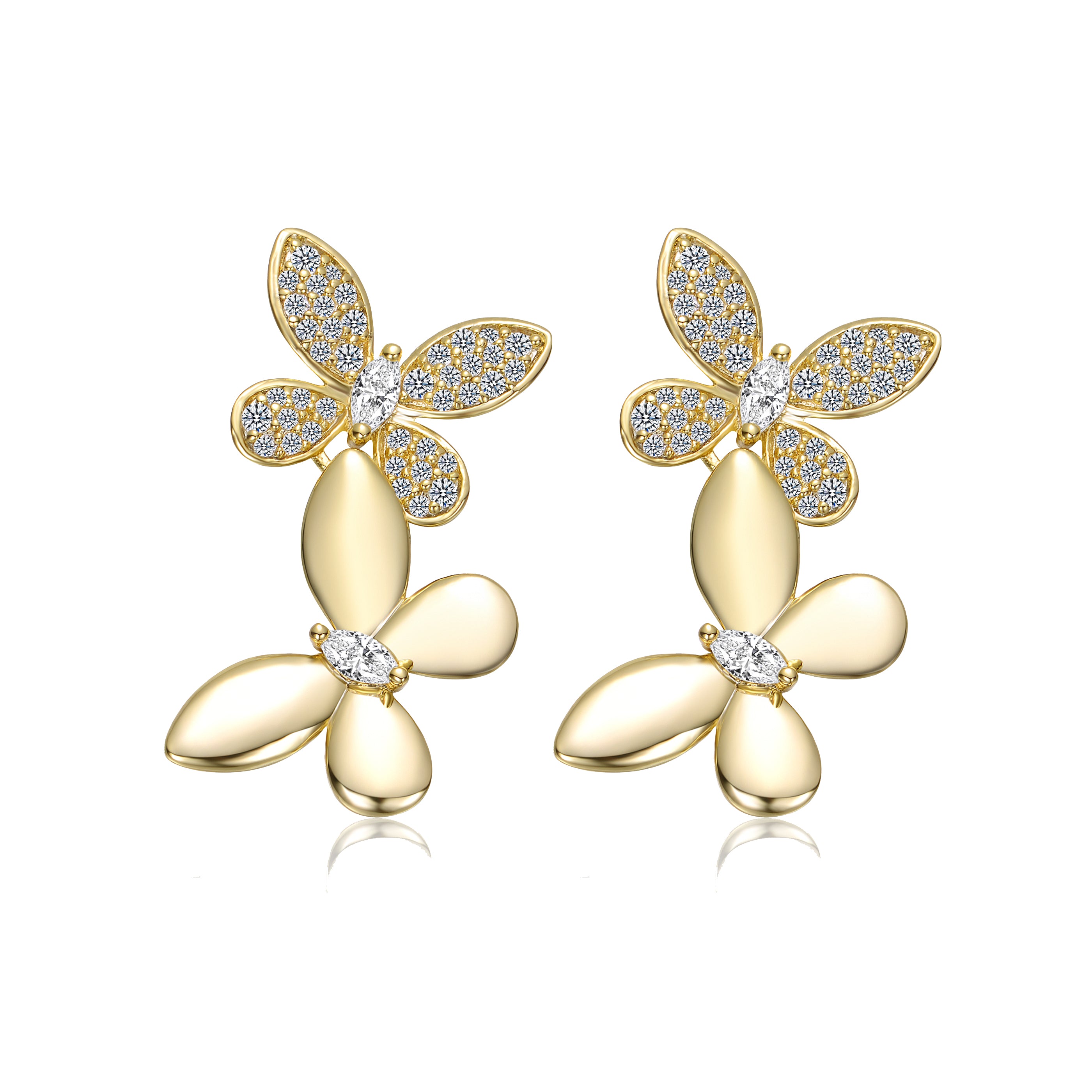 These exquisite stud earrings feature a charming floral design. Each earring consists of five gold-plated petals with a smooth, polished finish that radiates a warm golden hue. At the center and interspersed on the petals are sparkling cubic zirconia stones, meticulously set to enhance the earrings’ overall brilliance and allure. The central cubic zirconia is larger, serving as a focal point, while smaller stones embellish the petals’ outline, adding to their luxurious appearance. The earrings are designed with post back closures for secure wear. This jewelry piece combines elegance with contemporary style, making it suitable for both formal occasions and everyday wear.