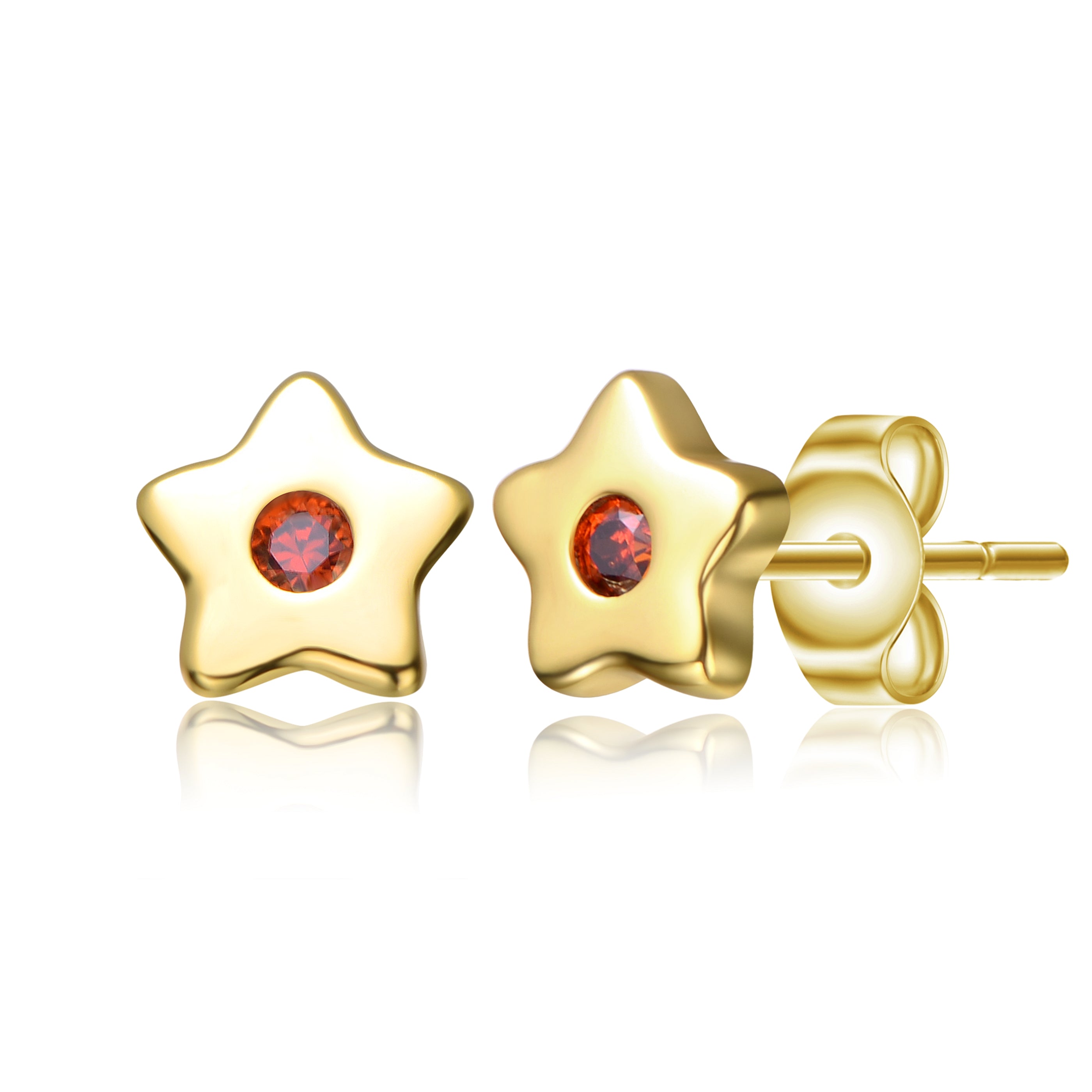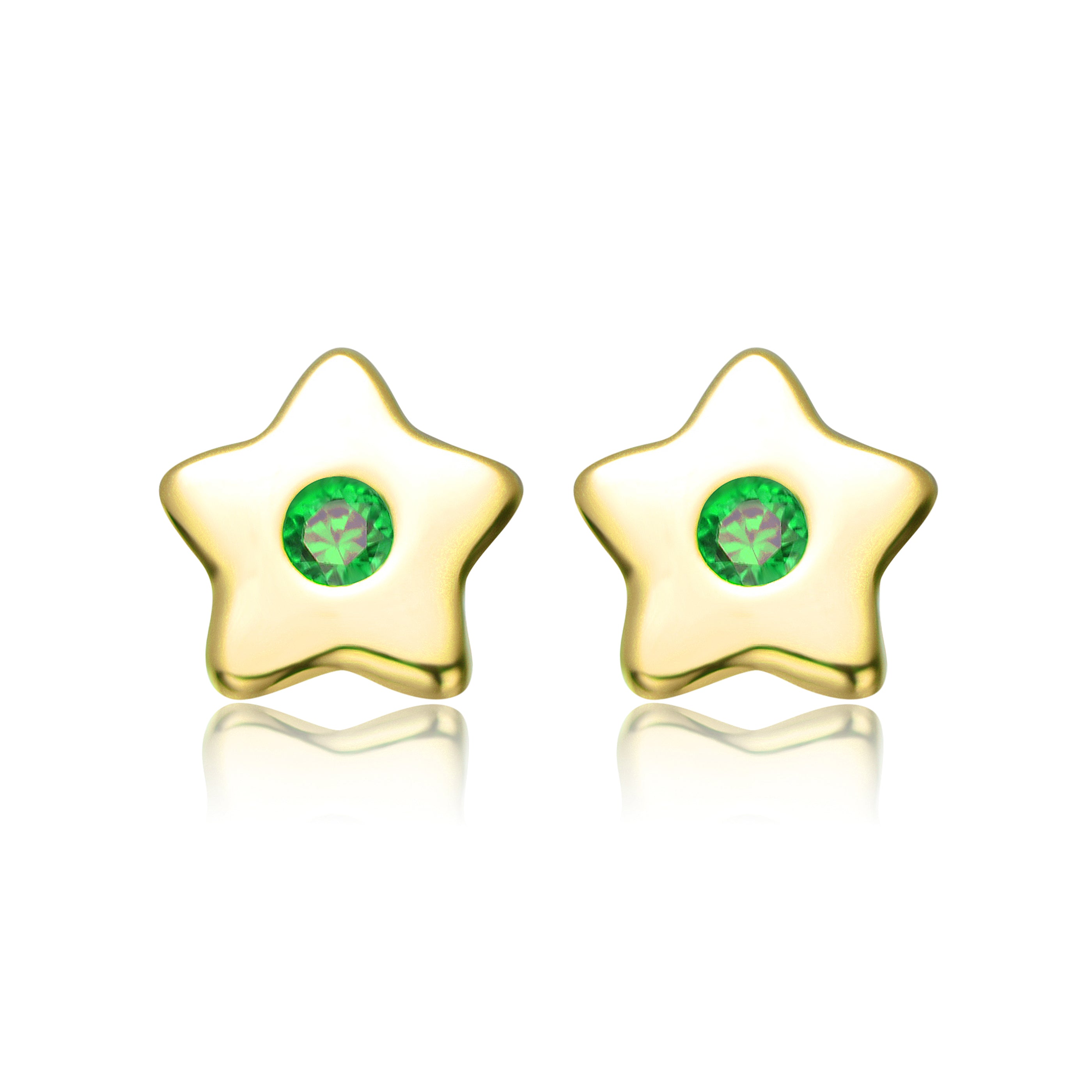 Kids 14k Gold Plated Green Cubic Zirconia Five-Point Lucky Little Star Stud Earrings. Twinkle, twinkle, little star, gift these brightly polished 14k gold plated stars to the littlest star in your life! These sweet children's stud earrings are fashioned into small five-point stars, sparkling with a round cut green cubic zirconia in the center. Butterfly backs keep them secure, making these earrings great as a surprise on a birthday, holiday, or push present for the mom and the bundle of joy.