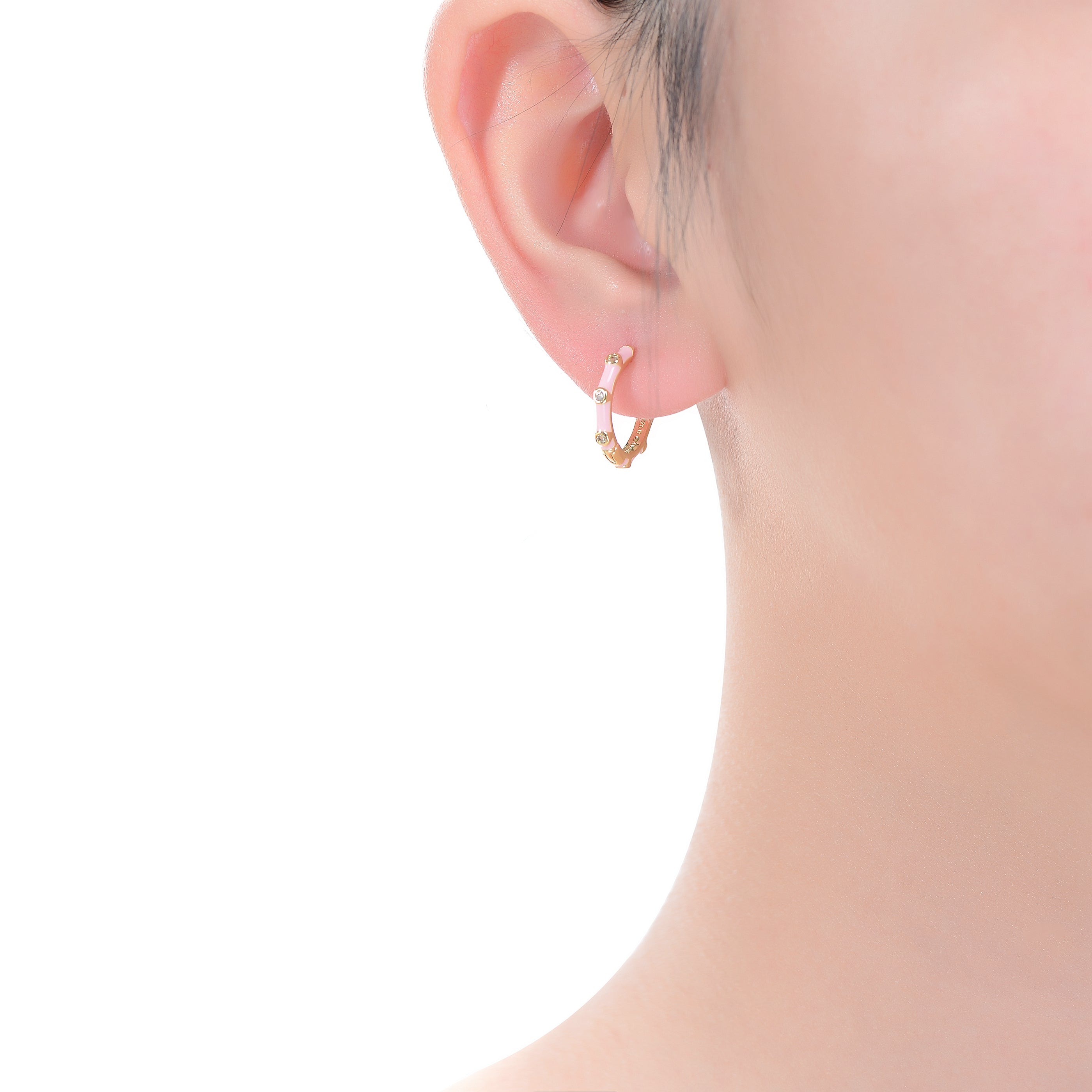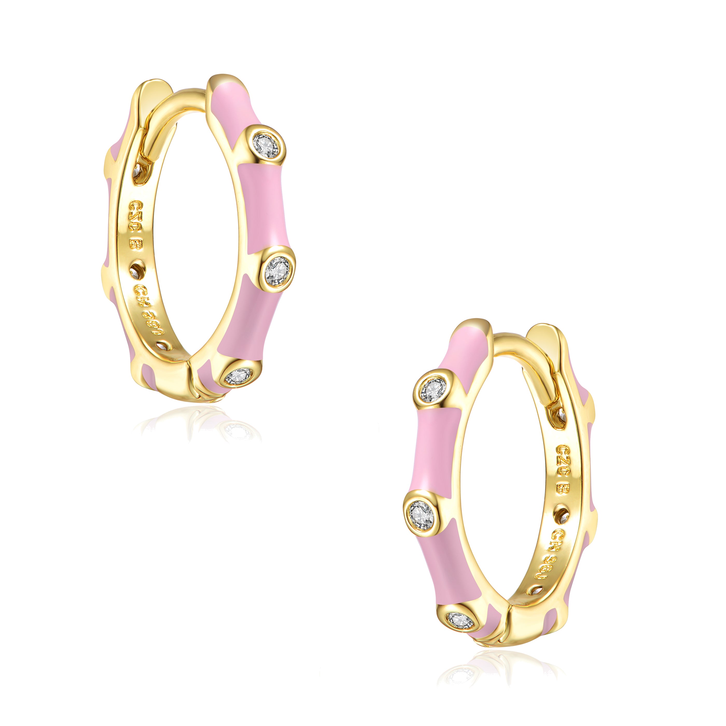 Add a pop of luxurious color with these designer-inspired bamboo hoop earrings! Rich, pink enamel and sparkling cubic zirconias alternate in a 14k yellow gold plated finish. Hinged posts secure these unique hoops. Available in different color options.