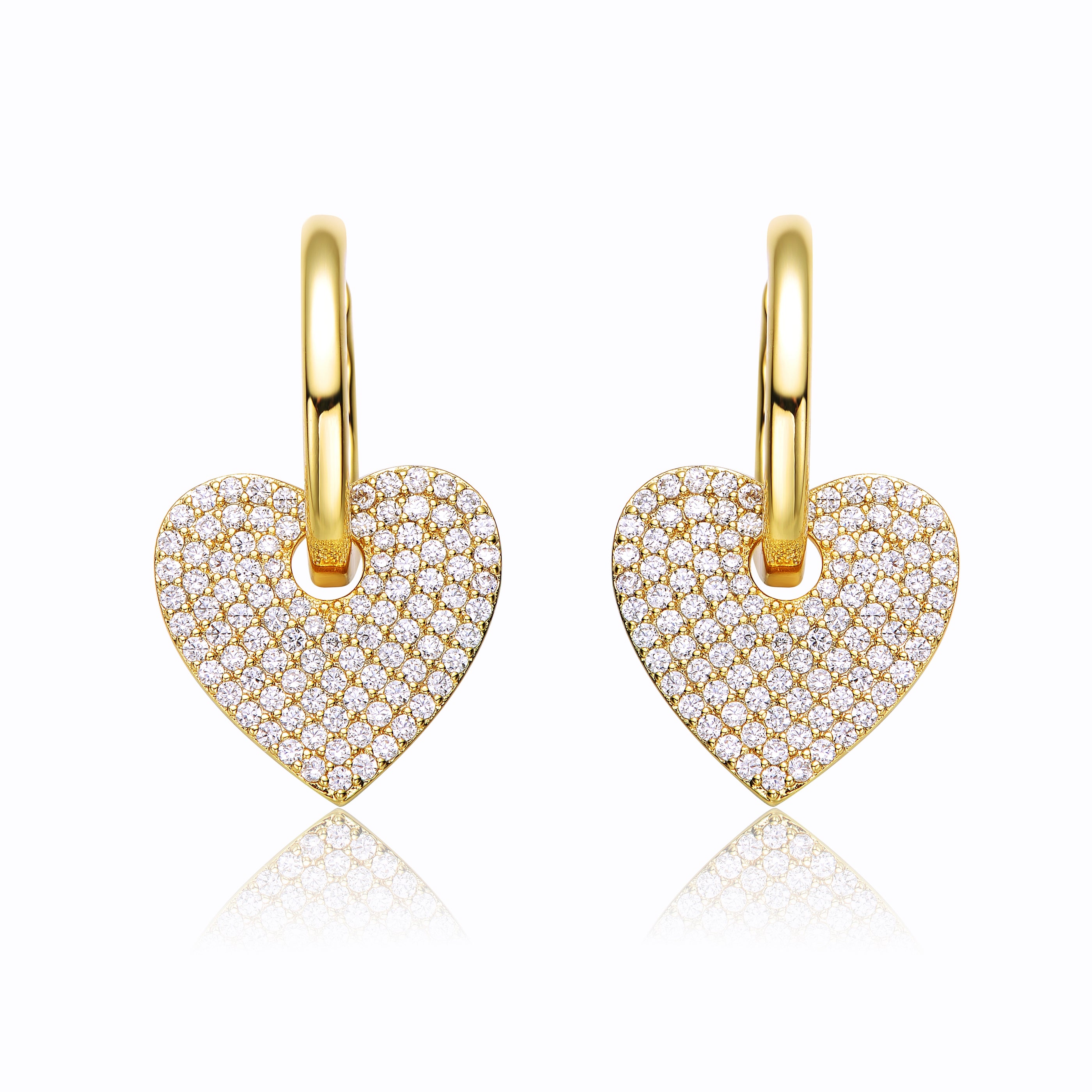 14k Yellow Gold Plated with Cubic Zirconia Heart Dangle Infinity Hoop Drop Earrings. Add these brightly polished 14k yellow gold plated earrings to your day or night look, perfect for those who love hearts. Sparkling round brilliant cut diamond-like cubic zirconias pave set on dropped heart charms add romance to these classic tubular hoops. Hinge backs provide an infinity fit to these hoops, allowing them to hug the earlobes comfortably when worn.