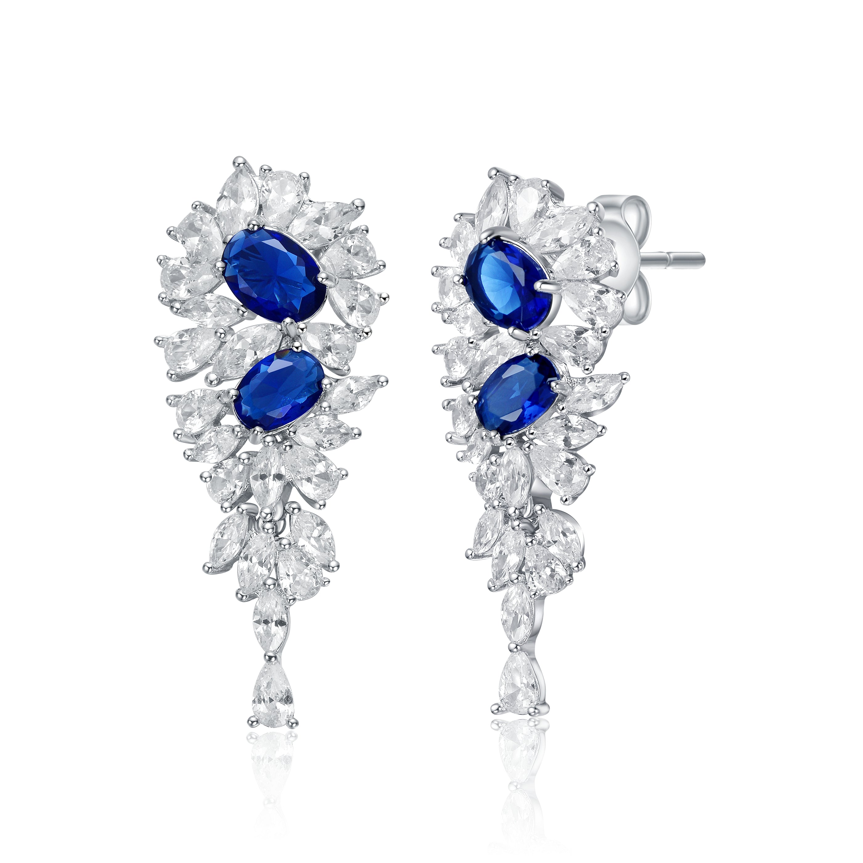 These exquisite earrings feature a striking pair of oval-cut sapphire stones at the center, surrounded by an intricate design of clear cubic zirconia crystals that cascade elegantly in a chandelier style. The combination of the deep blue sapphires with the sparkling clear zirconias set in a silver-tone base creates a luxurious and sophisticated accessory perfect for formal occasions.