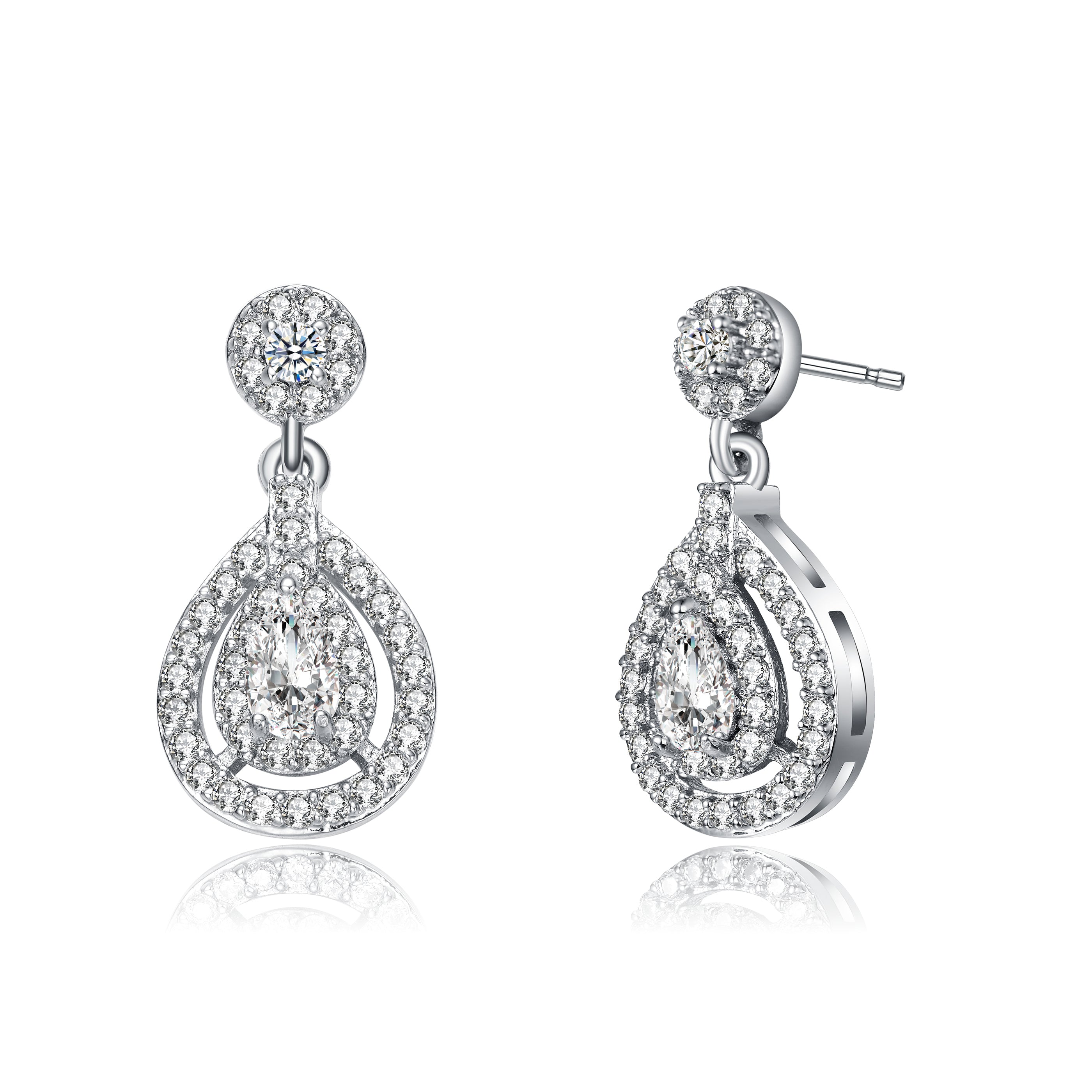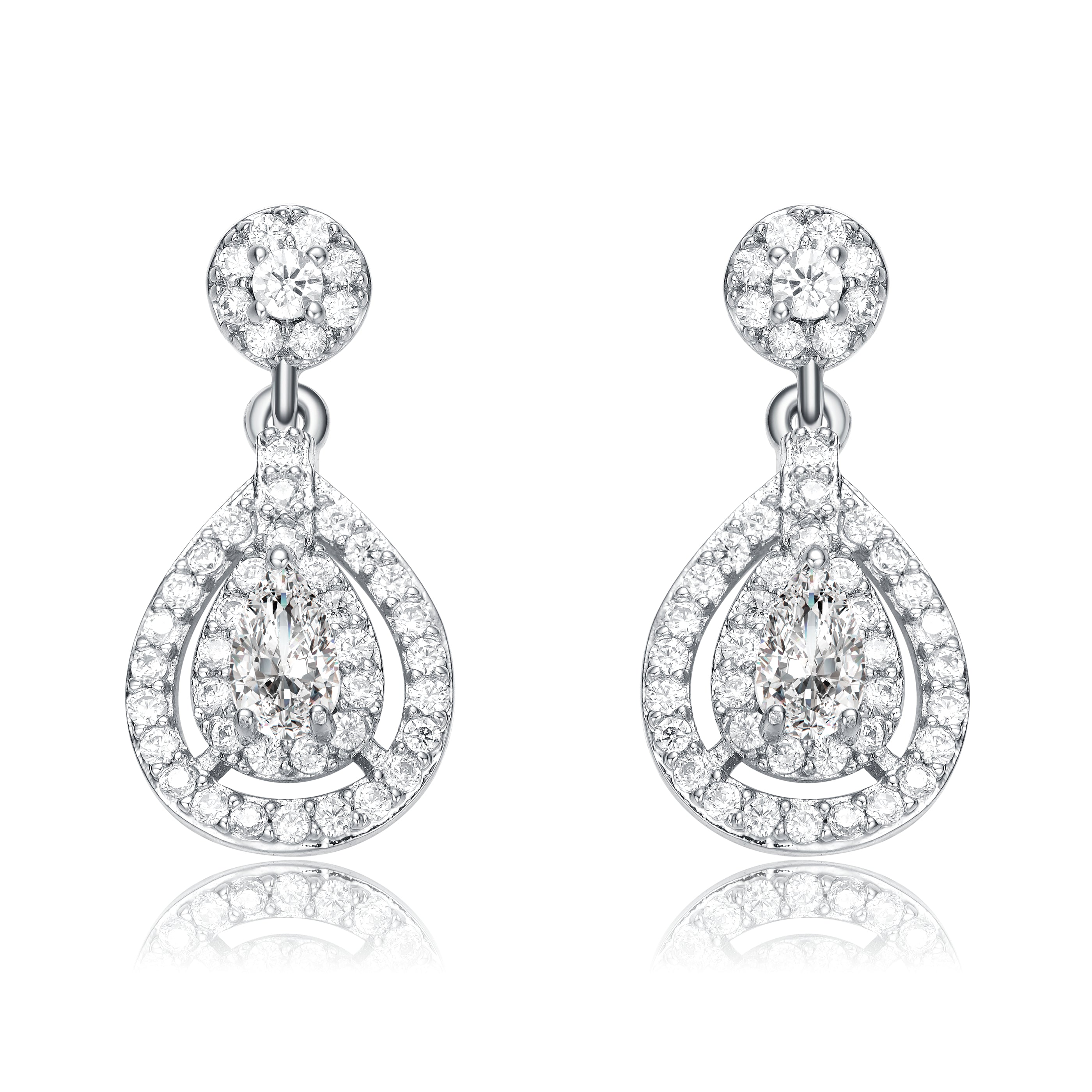 These exquisite earrings feature a rhodium-plated finish that enhances their durability and shine, while the teardrop design exudes timeless elegance. Each earring showcases a dazzling array of cubic zirconia stones, meticulously arranged to capture and reflect light from every angle. The central teardrop stone is framed by a halo of smaller crystals, adding depth and brilliance to the piece. Perfect for special occasions or adding a touch of glamour to any outfit, these earrings are a must-have accessory for those who appreciate sophisticated sparkle.
