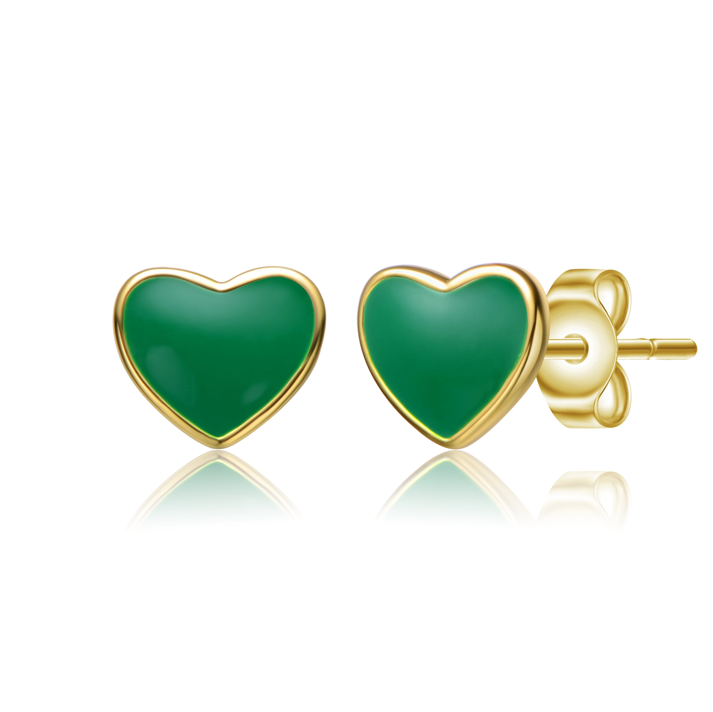Toddler/Kids 14k Gold Plated Colored Enamel Tiny Flat Heart Stud Earrings. Make the happiest moments last on the next special occasion, whether for a family member, friend, neighbor, or more. These tiny 14k gold plated heart studs feature a rich green enamel inlay and a smooth finish, ensuring they don’t snag or get caught on clothing or hair. Celebrate today and all of tomorrow with these super-sweet little heart stud earrings. Butterfly backs keep them in place. This item is available in emerald green enamel, ruby red enamel, or 14k gold plated hearts.