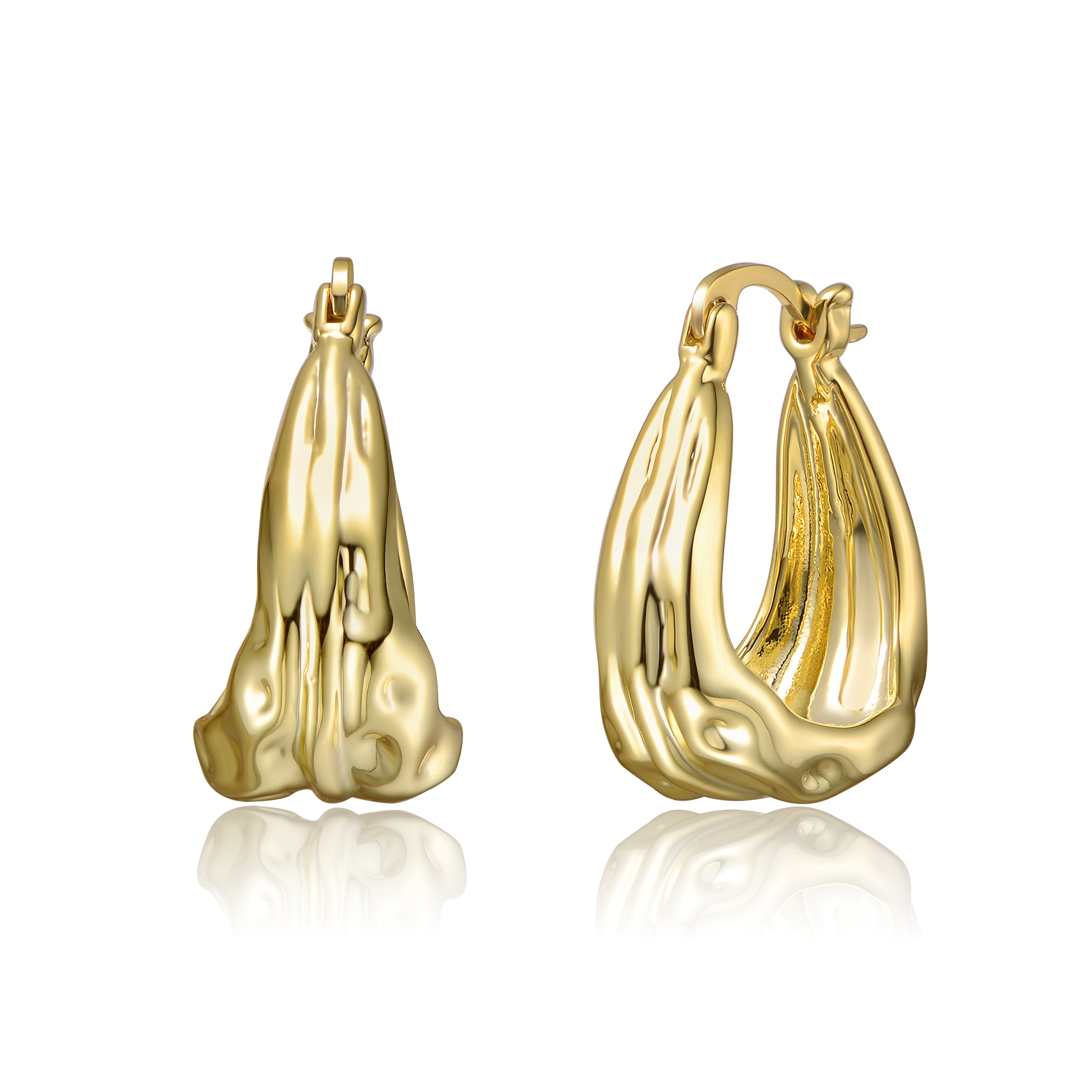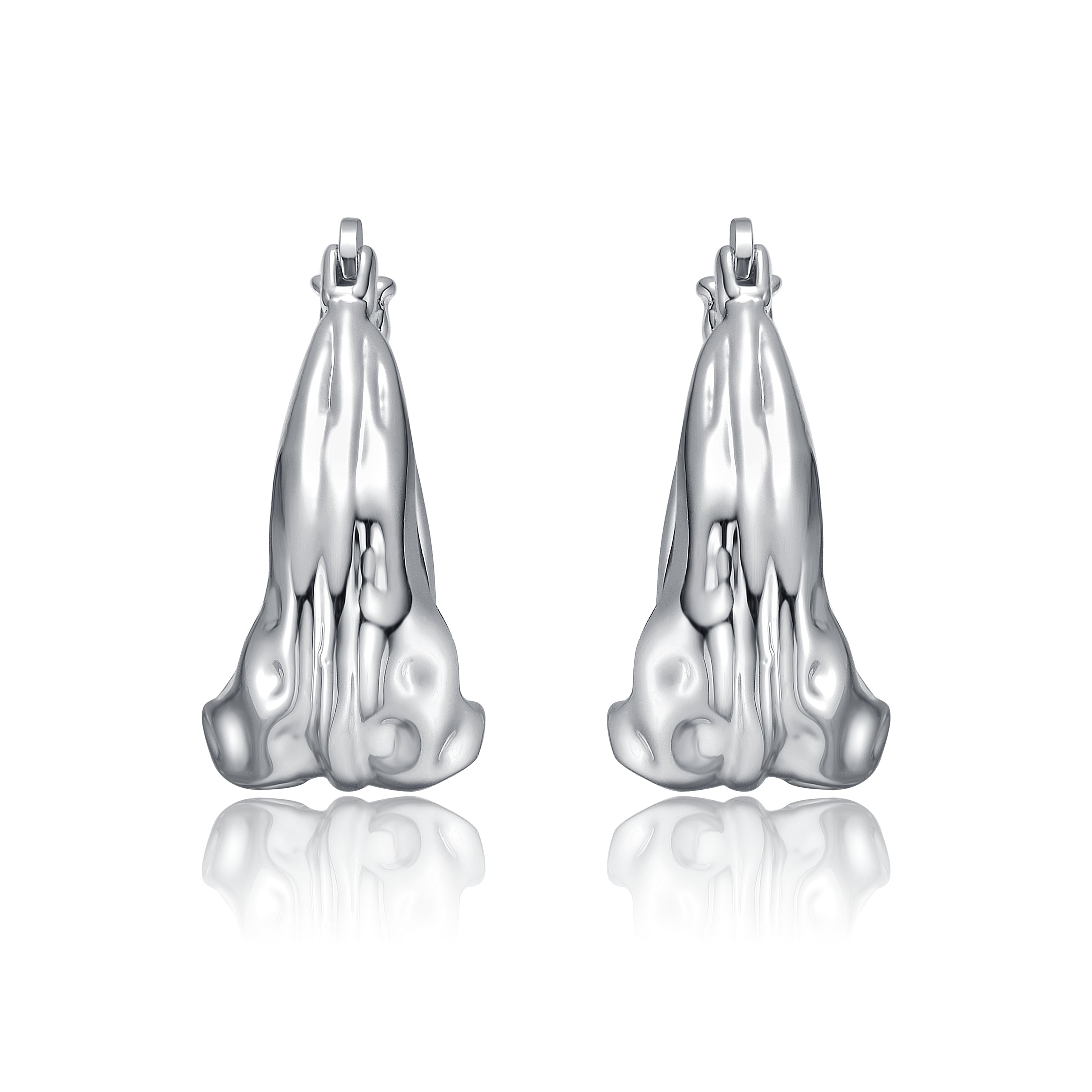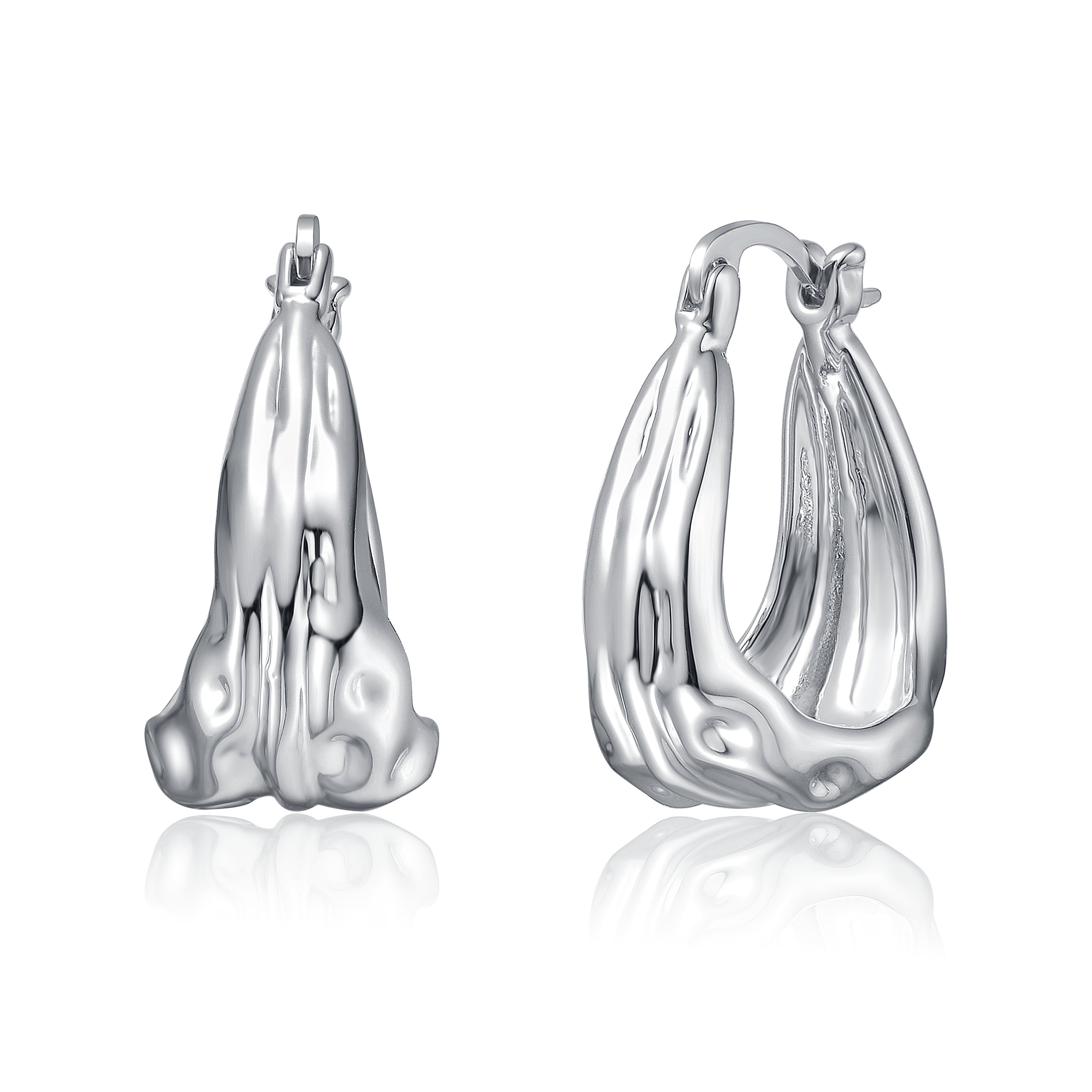 White Gold Plated Sculptural Waterfall Hoop Earrings. Elevate any wardrobe with these beautiful oblong hoop earrings, created in a durable white gold plating. A textured waterfall design gives these earrings a modern abstract artistic silhouette, bringing attention to their rich, luscious shine. Click-top posts keep these hoop earrings in place, adding movement when worn. Finish your look with something uniquely glamorous--also easy to mix and match.