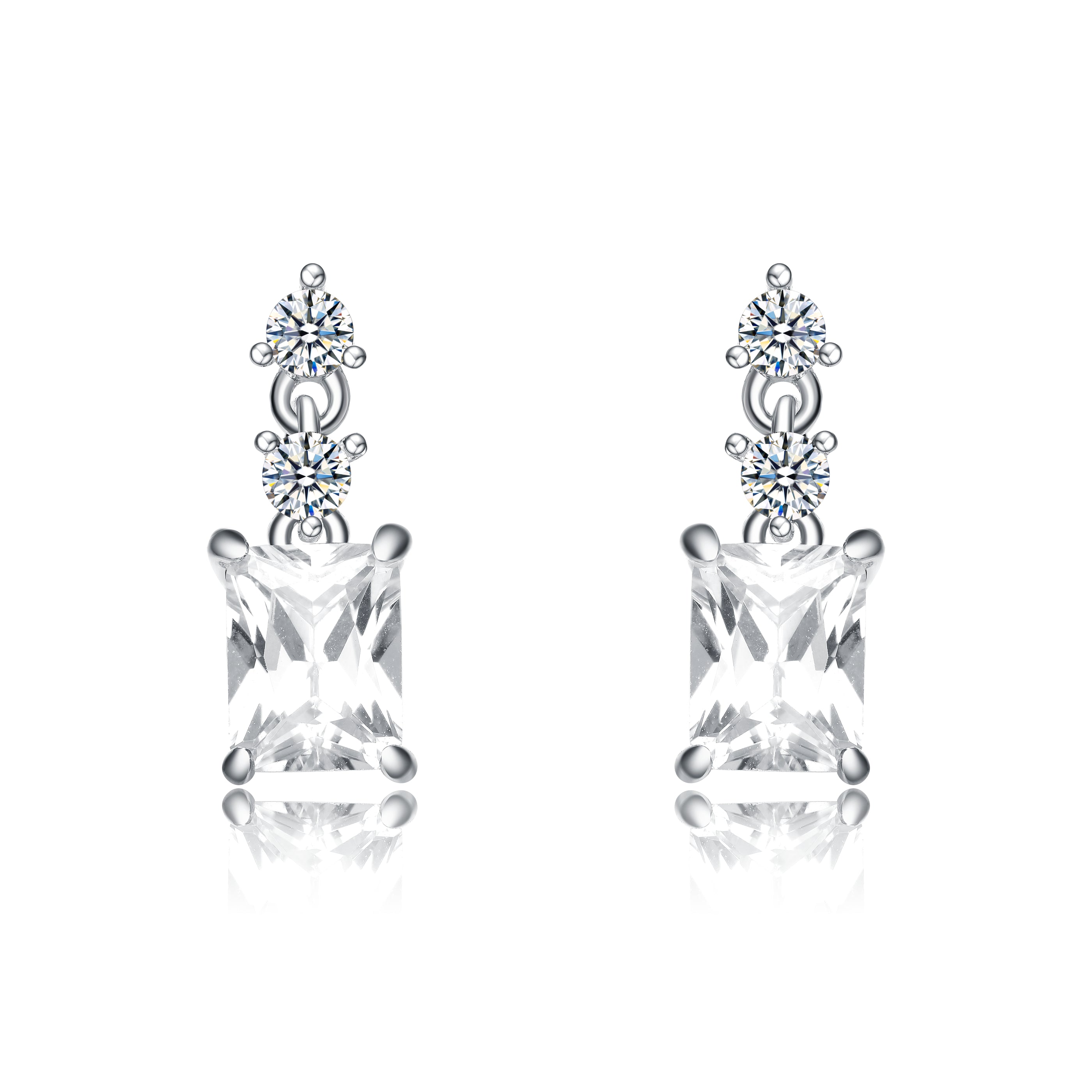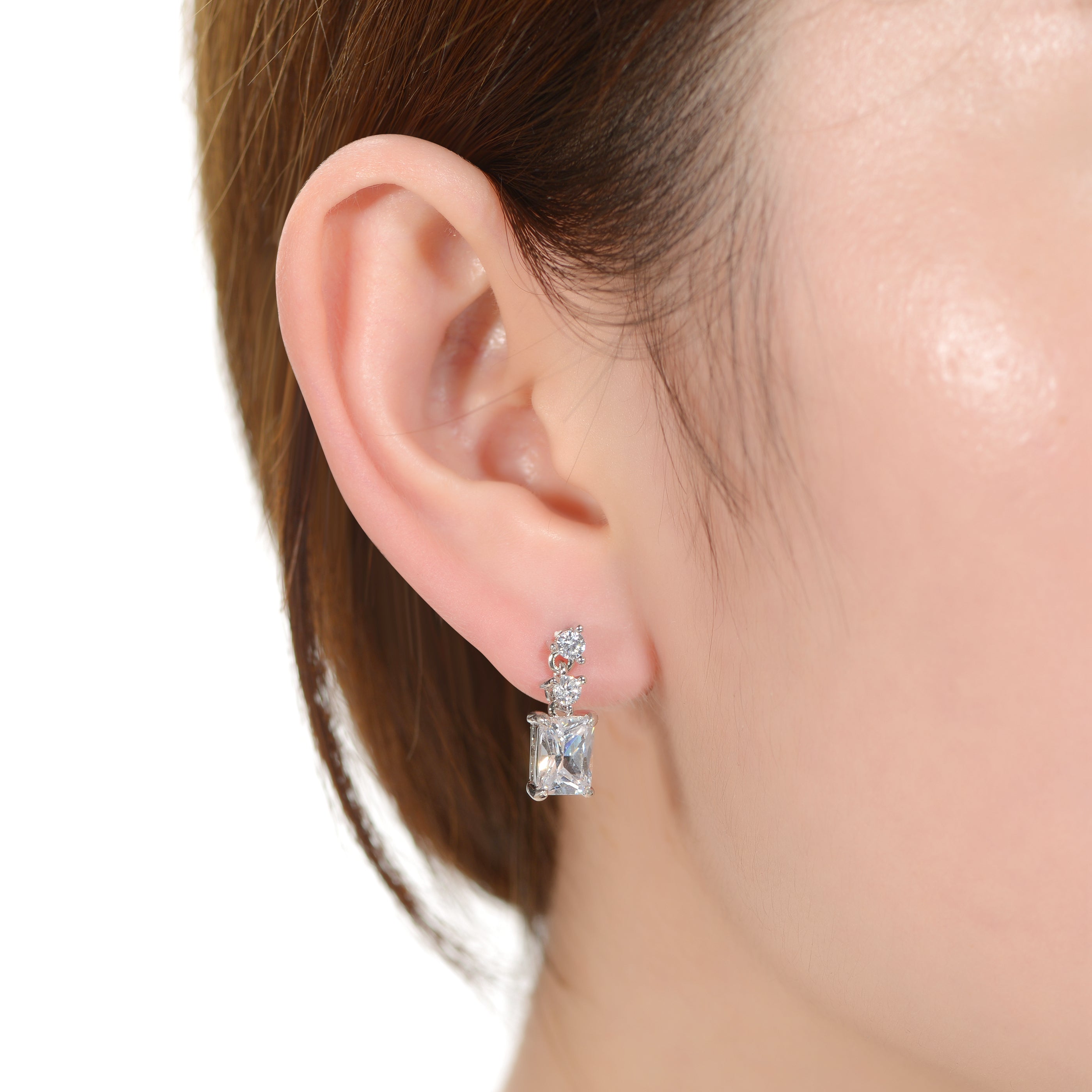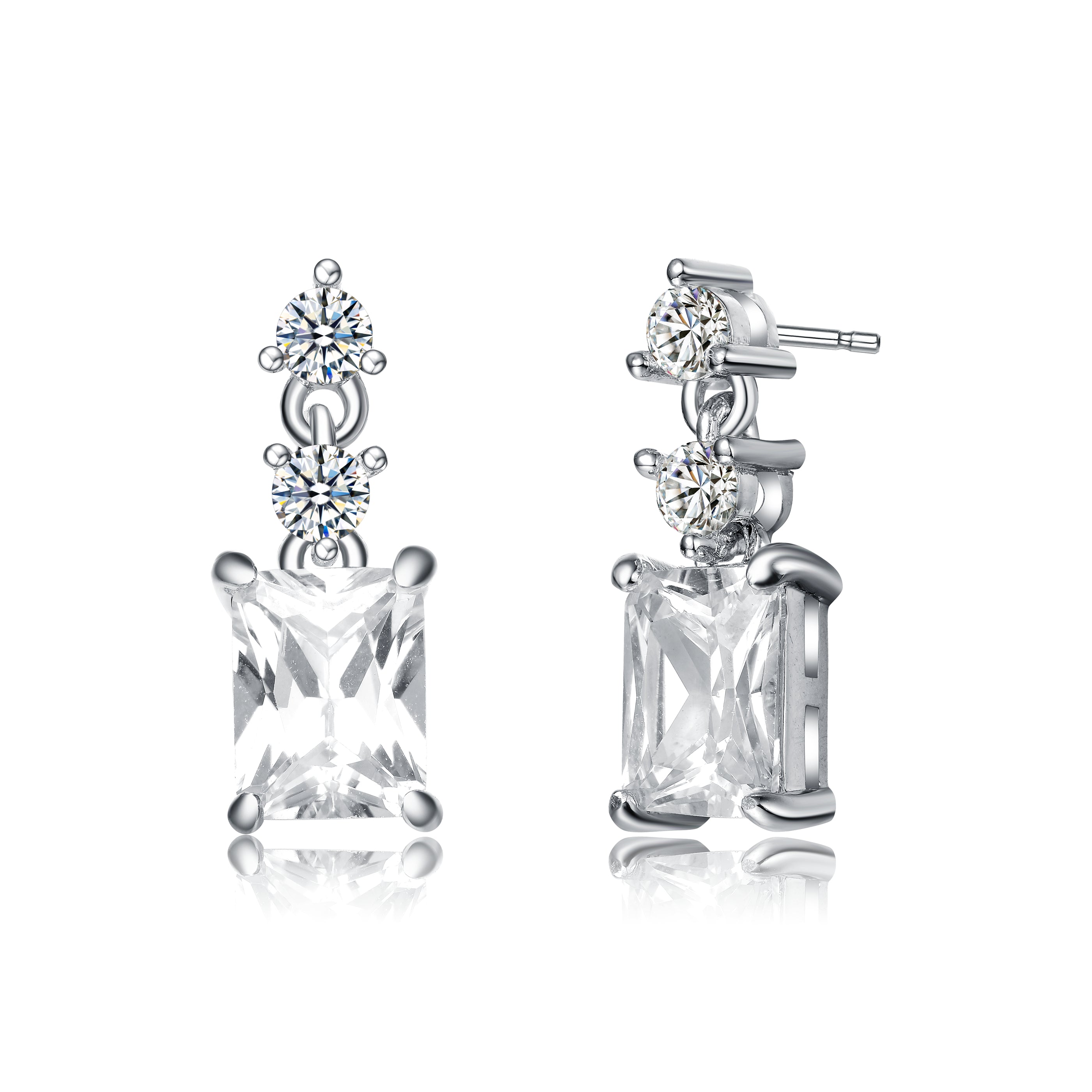 White Gold Plated with Cubic Zirconia Radiant & Round Three-Stone Drop Earrings. These Art Deco-influence earrings are made for today's looks, exuding contemporary fashion that is also classic. Glittering radiant cut solitaires secured in four-prong basket settings complement the two round brilliant cut cubic zirconias prong set on the top. This enchanting three-stone design gives these earrings a past, present, and future design, making them perfect for celebrating an anniversary or birthday. Butterfly backs keep them secure.