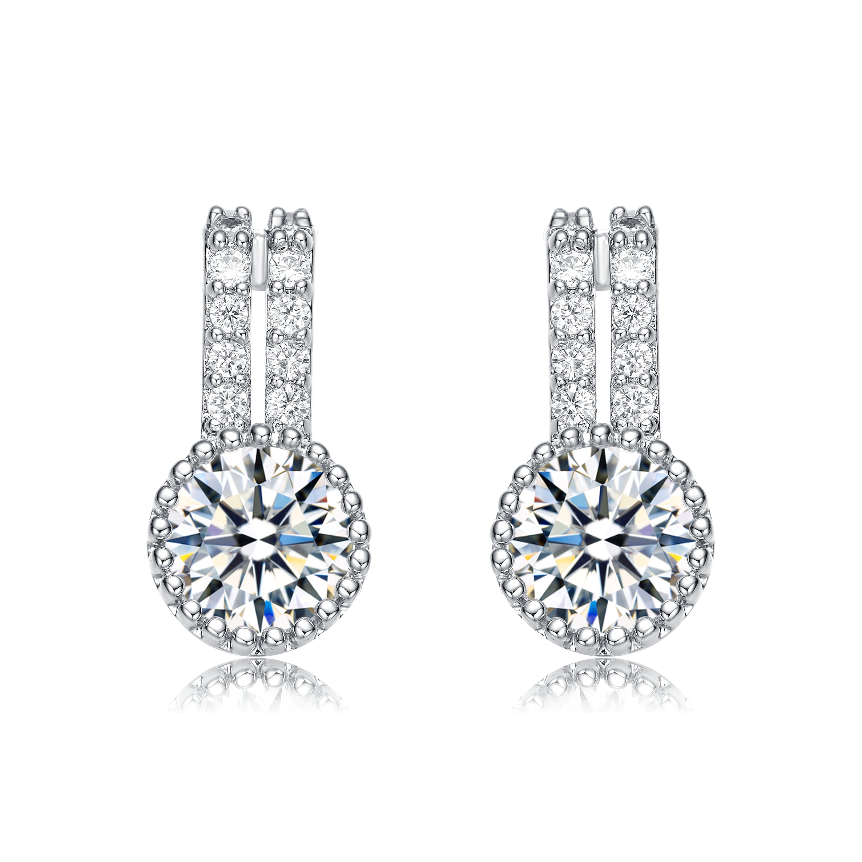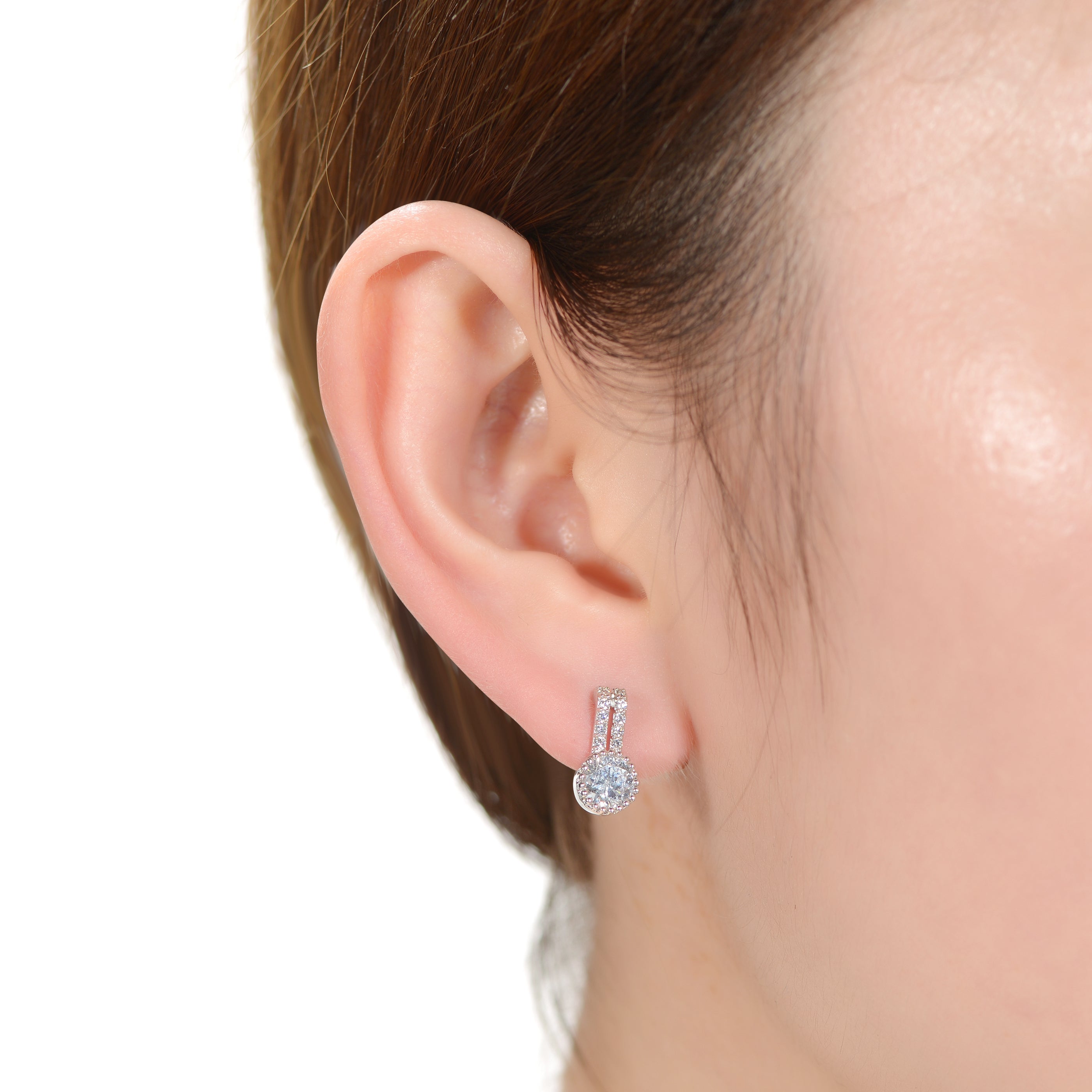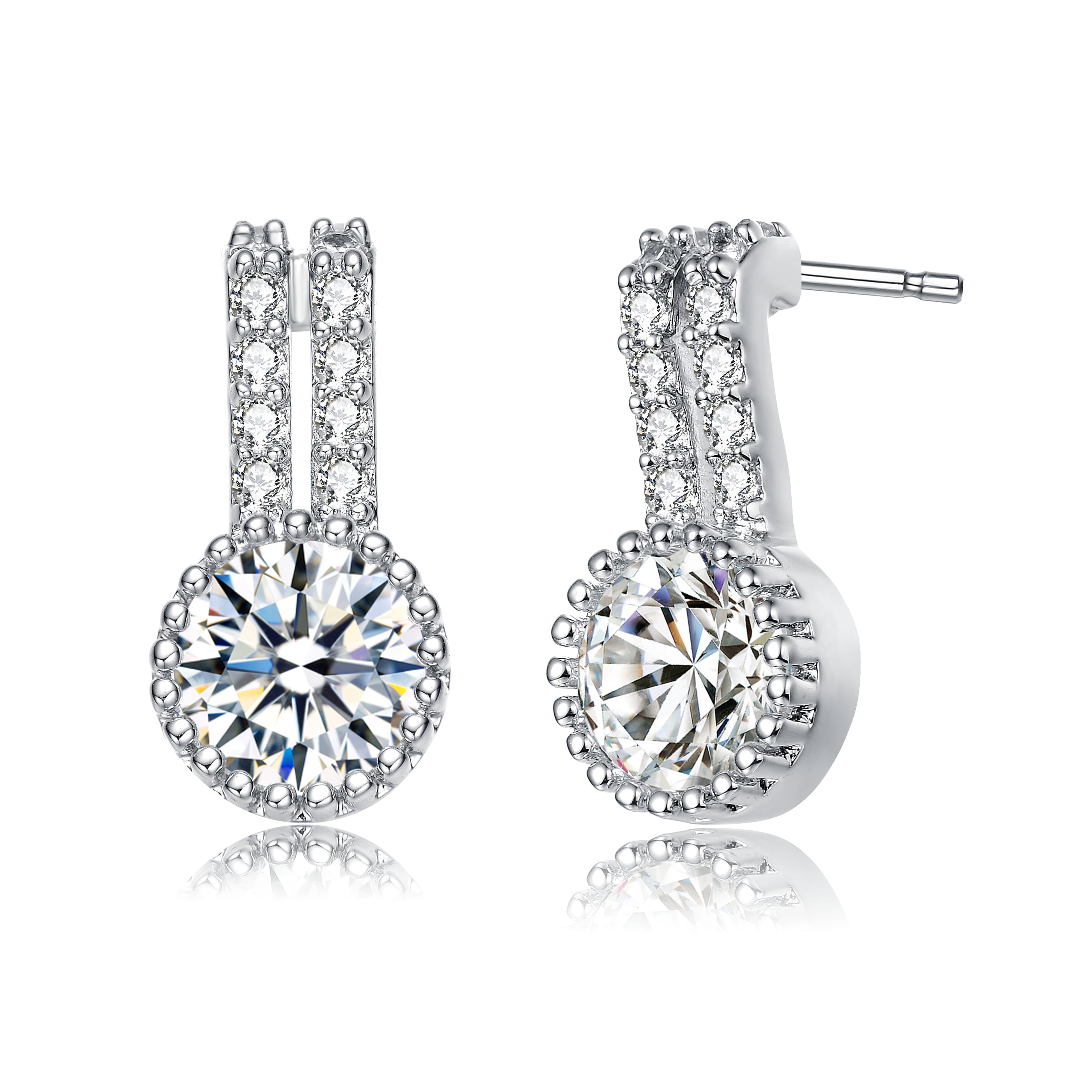 White Gold Plated with Cubic Zirconia Solitaire Milgrain Double Drop Earrings. Exude vintage inspiration with these brightly polished white gold stud earrings. Glistening round brilliant cut cubic zirconias prong set in milgrain beaded circles adds an Old World sophistication--perfect for those who love this detail. Two rows of round brilliant cut cubic zirconias pave set on the top add a double dose of glam to these cute earrings. Butterfly backs keep them secure.