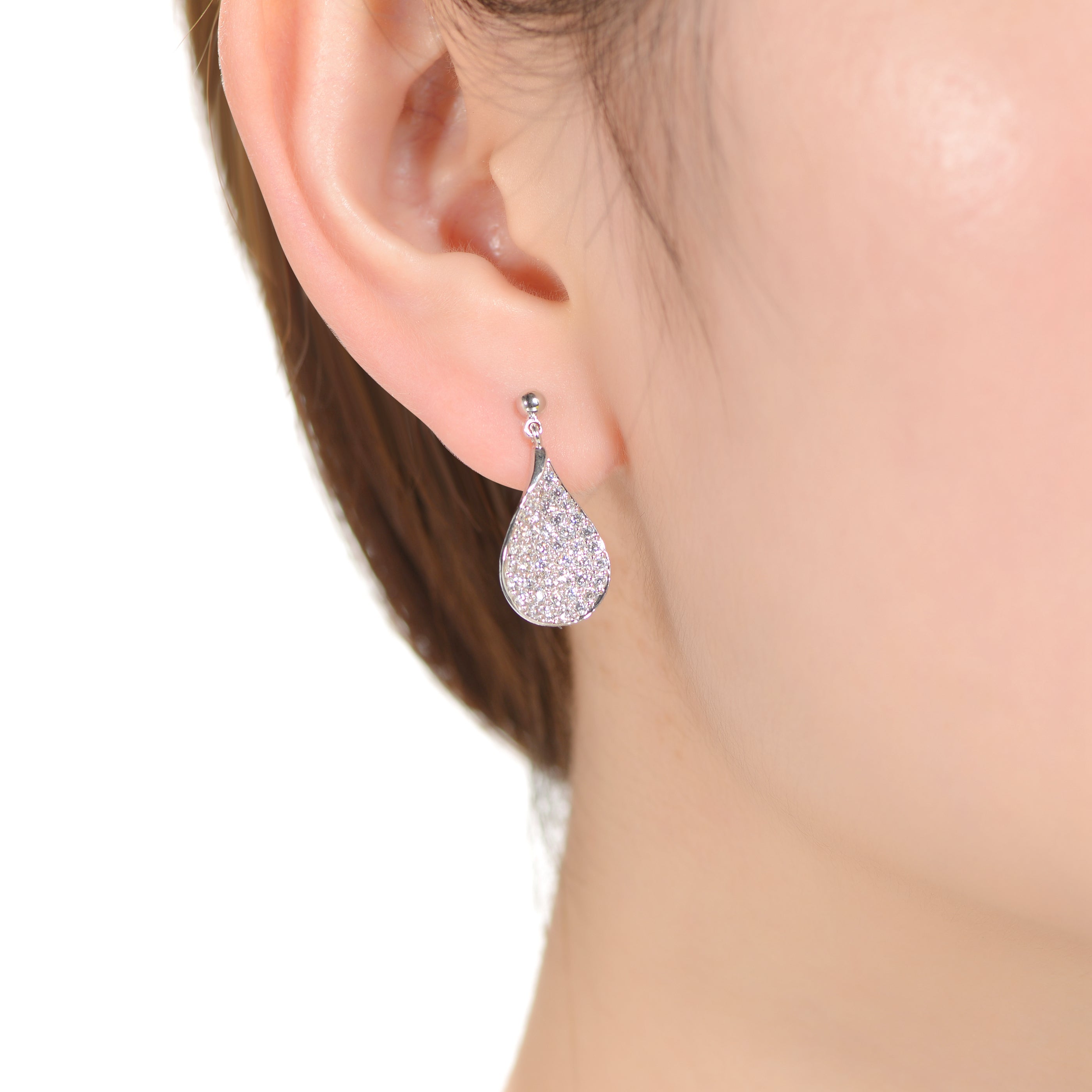 White Gold Plated with French Pave Cubic Zirconia Raindrop Pear Dangle Earrings. These brightly polished white gold plated dangle earrings feature round brilliant cut cubic zirconias French pave set in elegant raindrop pears. Butterfly backs keep these glamorous earrings in place, giving them graceful movement when worn. Select these pretty earrings as an anniversary, holiday, or birthday gift, or treat yourself to something treasurable, perfect for wearing out at night or any time.