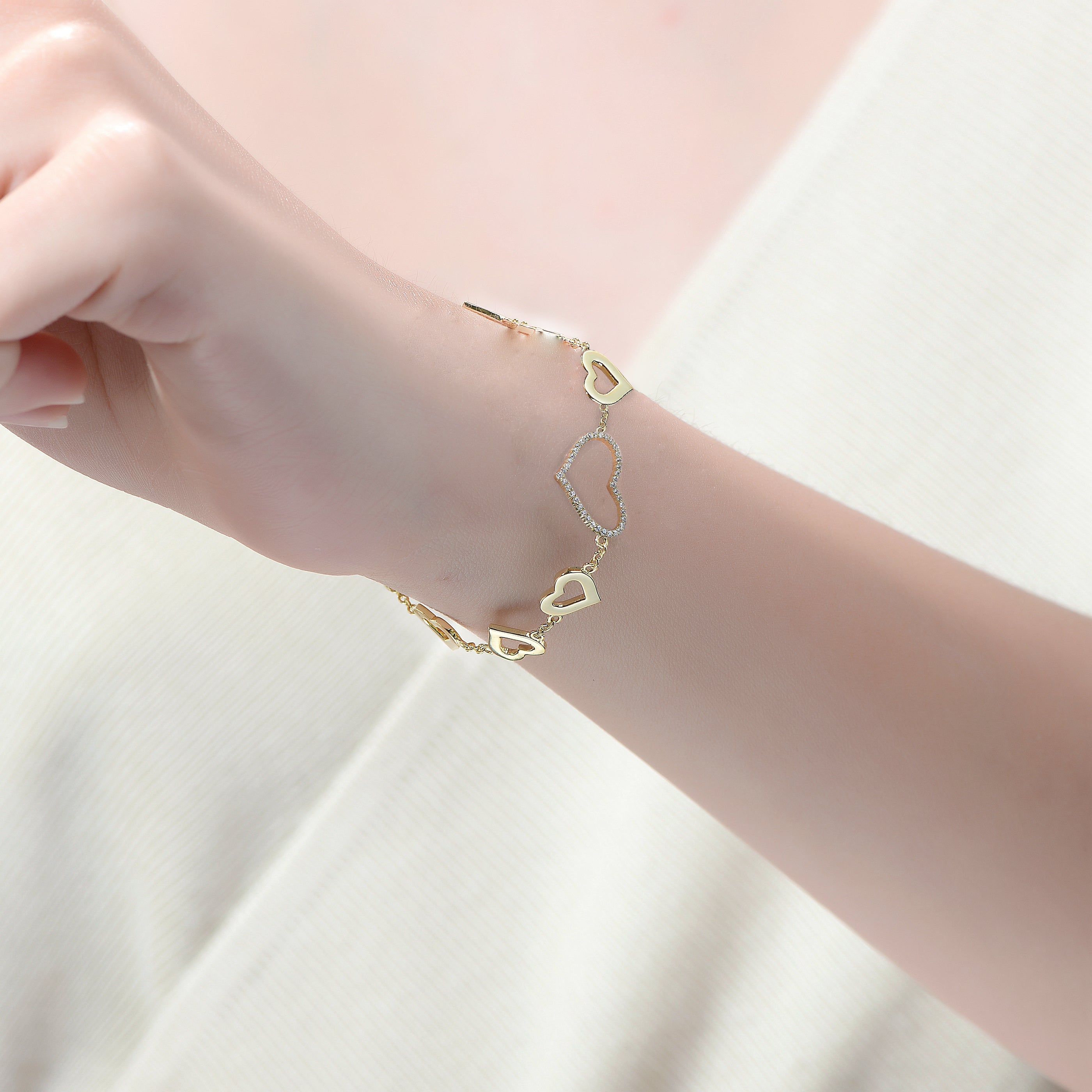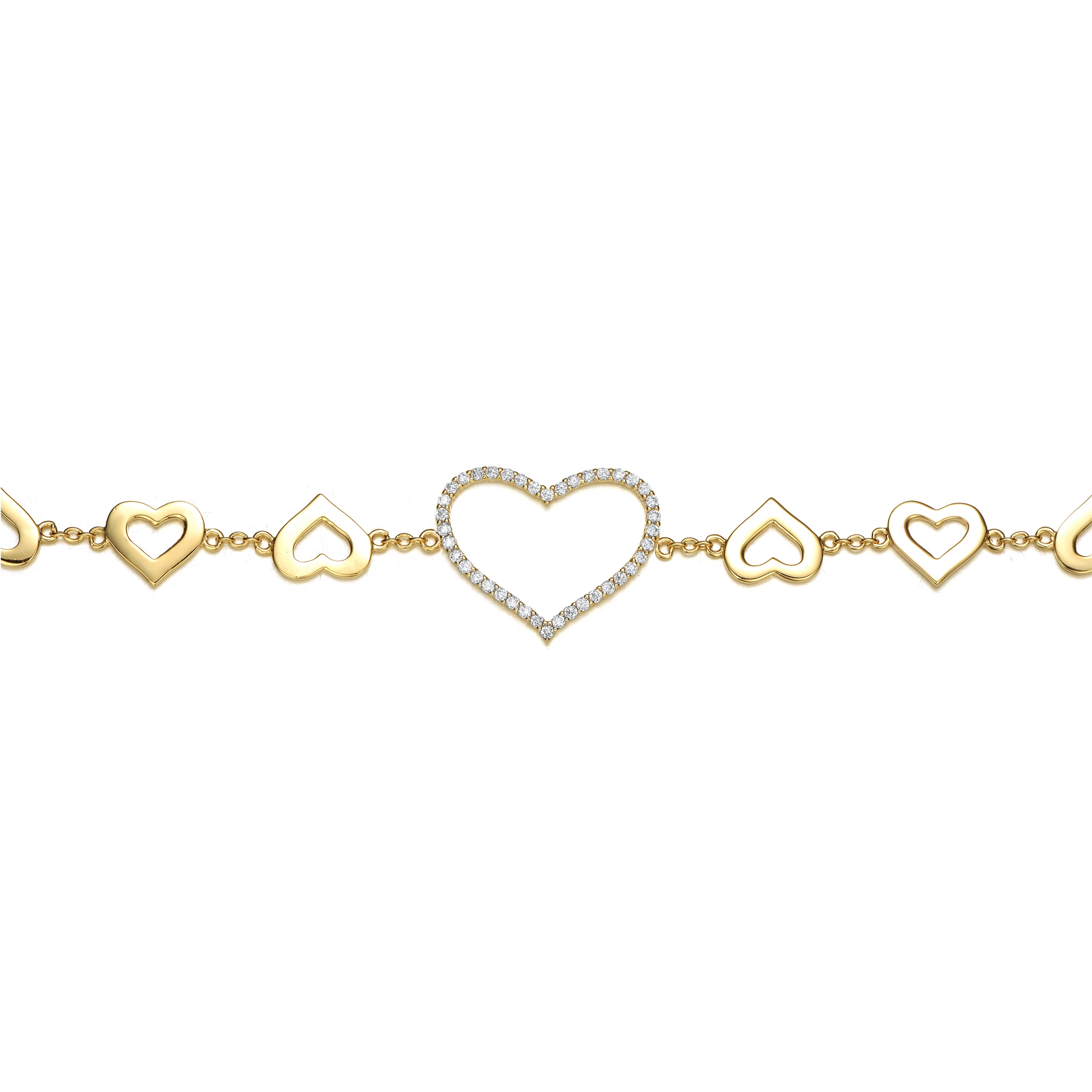 Hearts symbolize love and romance, making this chic heart halo charm bracelet the ultimate gift to give to a friend, a beloved, an aunt, mother, or grandmother. Shiny, rich heart halos align on a slinky cable chain in different sizes, finished with a cubic zirconia -like heart at the center, all in rich 14k yellow gold plating with a spring ring clasp and extension chain.
