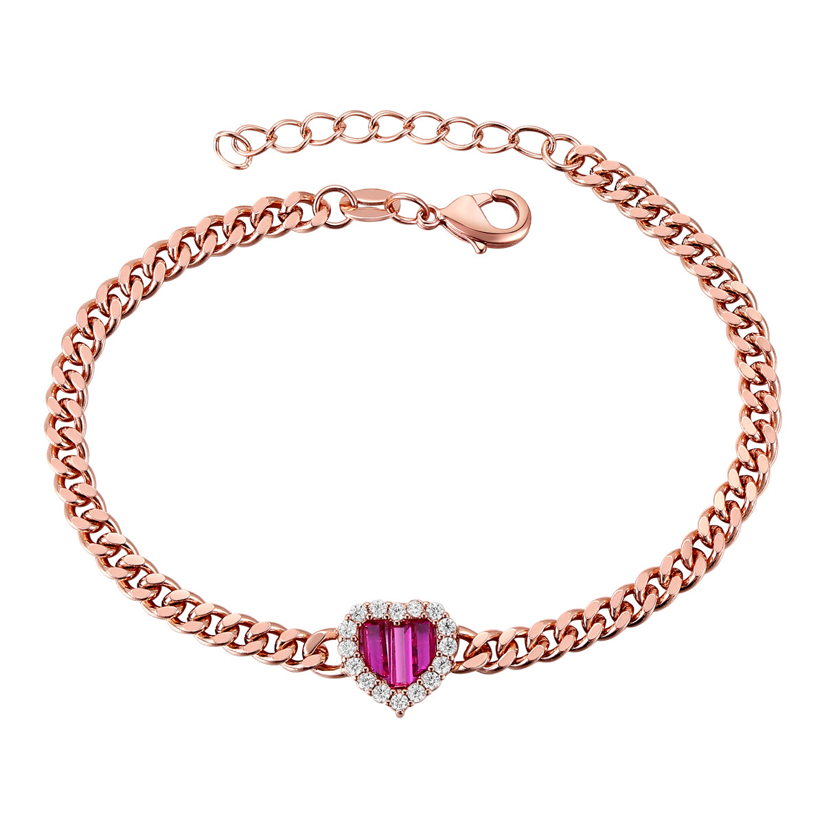 18K Rose Gold Plated with Ruby Heart & Cubic Zirconia Adjustable Tennis Bracelet. Romantic moments should last today and tomorrow with this brightly polished 18k rose gold bracelet, a symbolic token of affection. A rubycubic zirconia solitaire nestles in the center. Glittering round brilliant cut cubic zirconias pong set on a dazzling tennis chain gives it extra glamour. A secure lobster claw clasp with an extension chain adjusts to your wrist size, making this bracelet ideal for gifting to any loved one.
