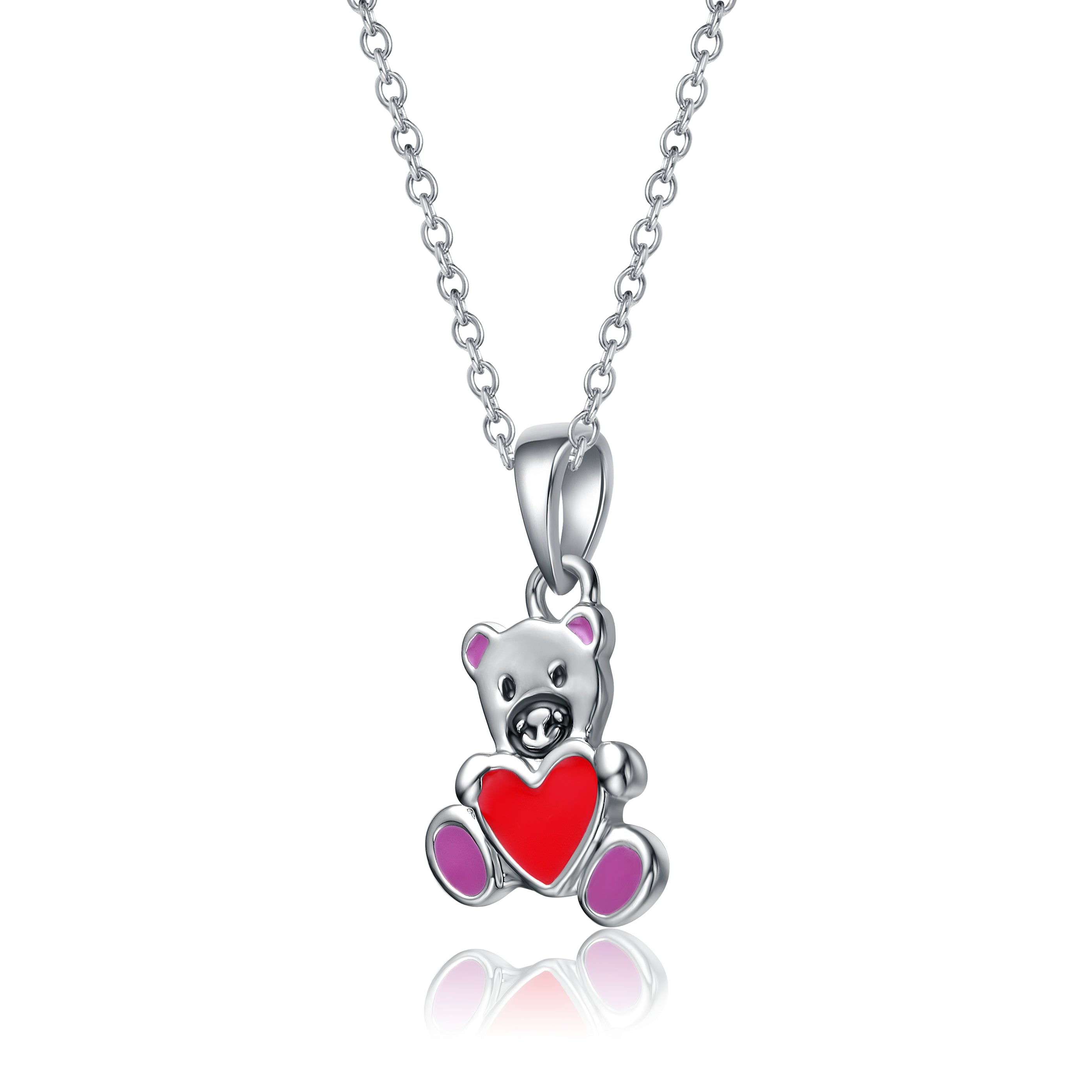 Kids White Gold Plated Enameled Heart Teddy Bear Pendant Charm. Adorable, and oh-so-sweet! This lightweight children's white gold plated pendant features a cute teddy bear holding a heart, symbolizing love and happiness with rich enamel detailing for a pop of color and cheerfulness. Gift this tiny teddy to an expectant mother or on a birthday/holiday present for the tiniest tike in your life, showing how much you care. The durable gold plating gives it added shine, sure to get noticed every time.