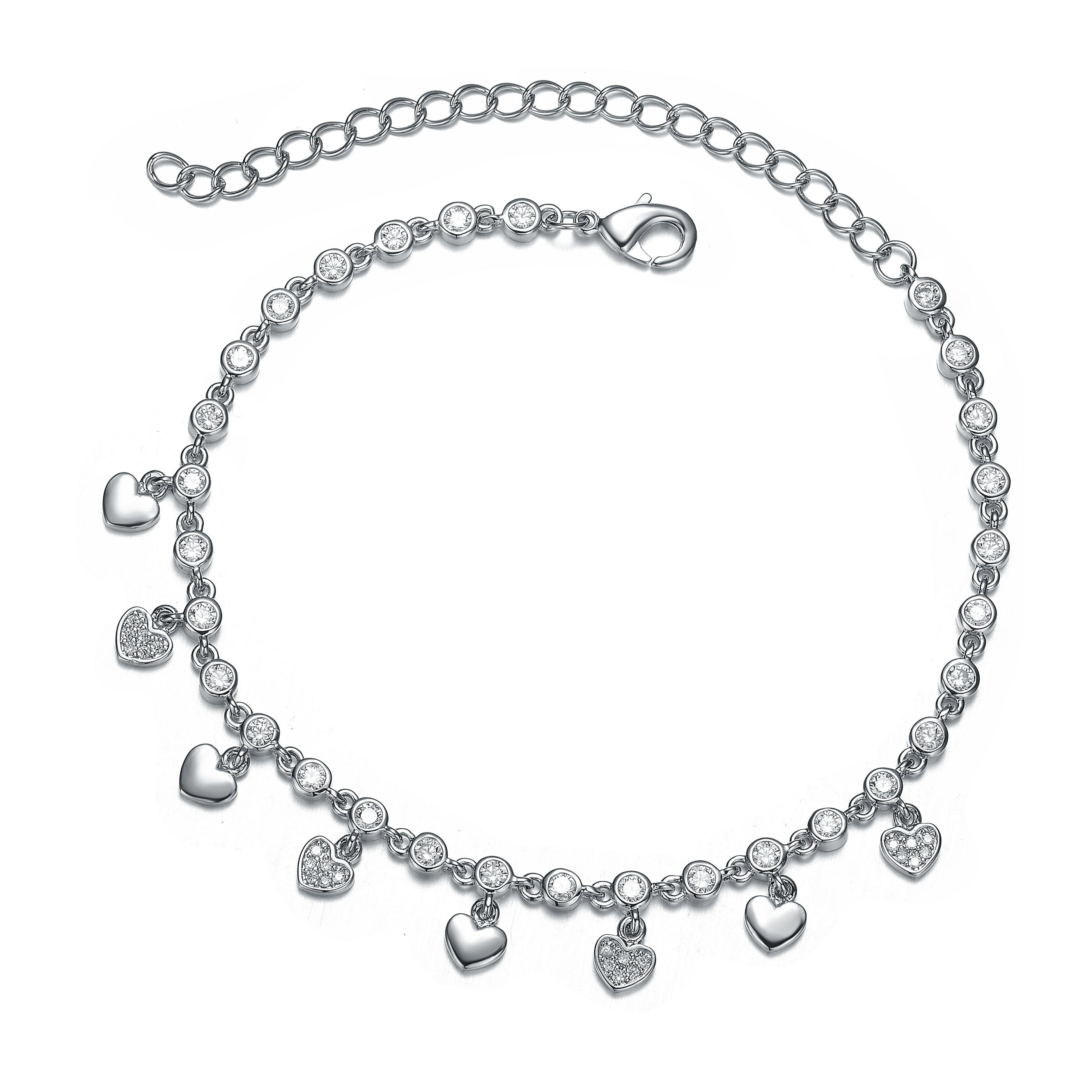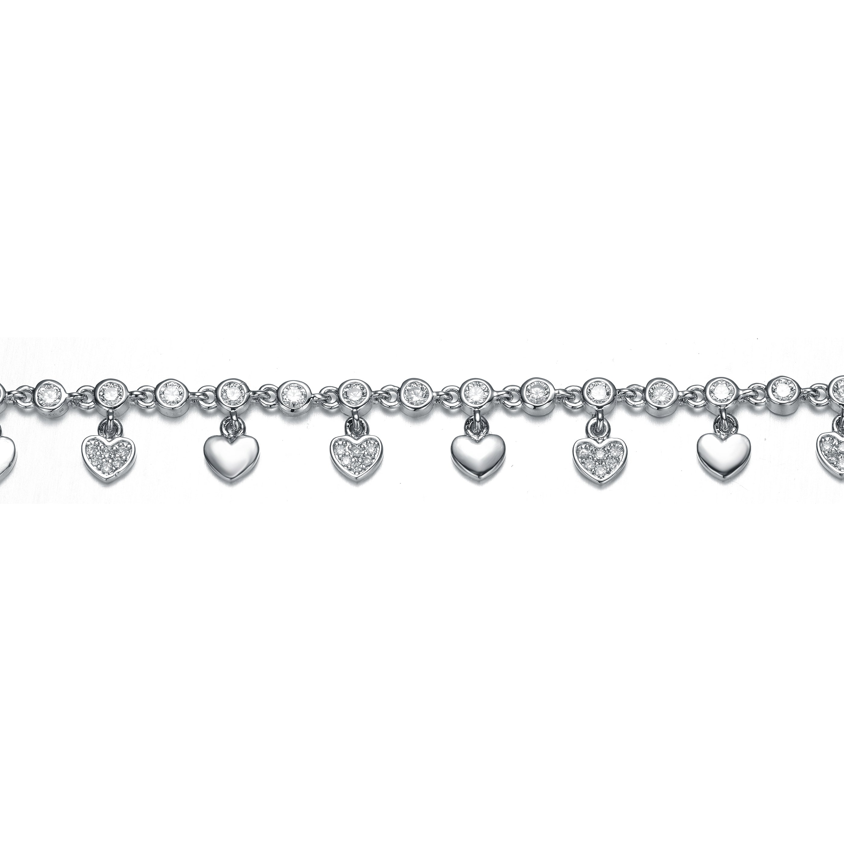 Elegant Rhodium Plated Cubic Zirconia Adjustable Heart Bracelet. This bracelet features interesting design that is made out of two types of heart charms which change alternately, set on an artfully crafted chain. One charm is made out of solid metal and the other is accented with small round cubic zirconia stones. The chain is made out of links and clear round cubic zirconia stones set in bezel, changing alternately. Crafted with Rhodium Plating and it is secured with lobster claw closure. This item also makes a great gift as well.