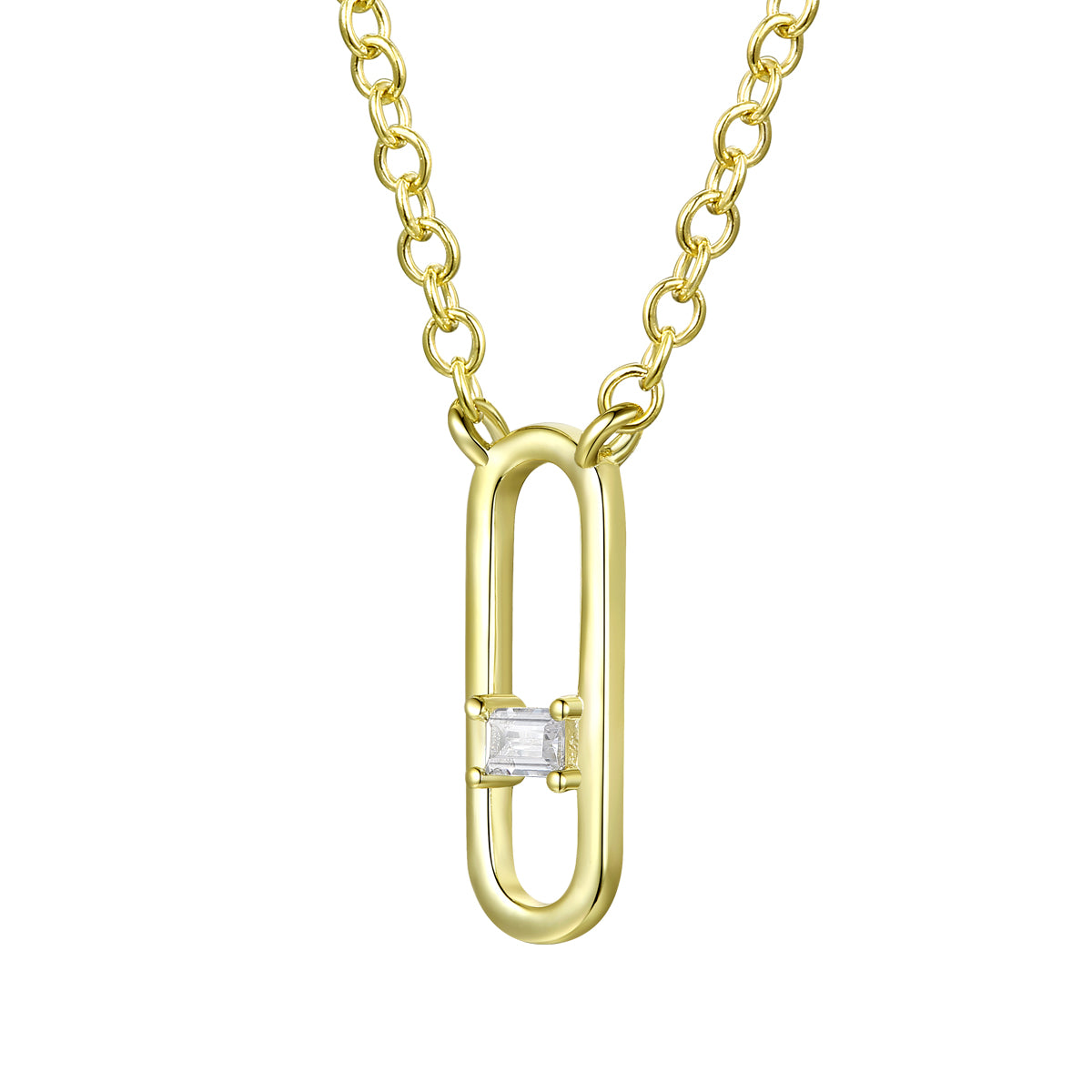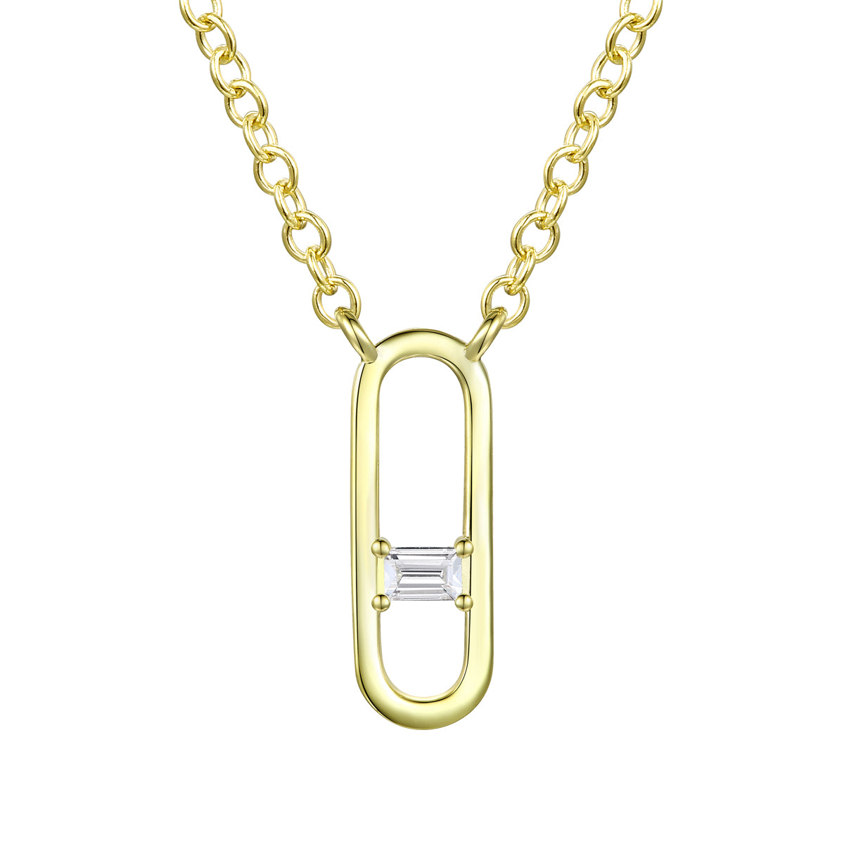 Stylish 14K Gold Plated Baguette Cubic Zirconia Modern Teens Necklace. This pendant features oval charm design that is made out of solid metal, with clear baguette cubic zirconia stone in prong setting in the center, connected to a chain on two sides on the top. Crafted with 14K Gold Plating and it is secured with spring ring closure. Perfect piece of jewelry for stylish combinations. This item also makes a great gift as well.