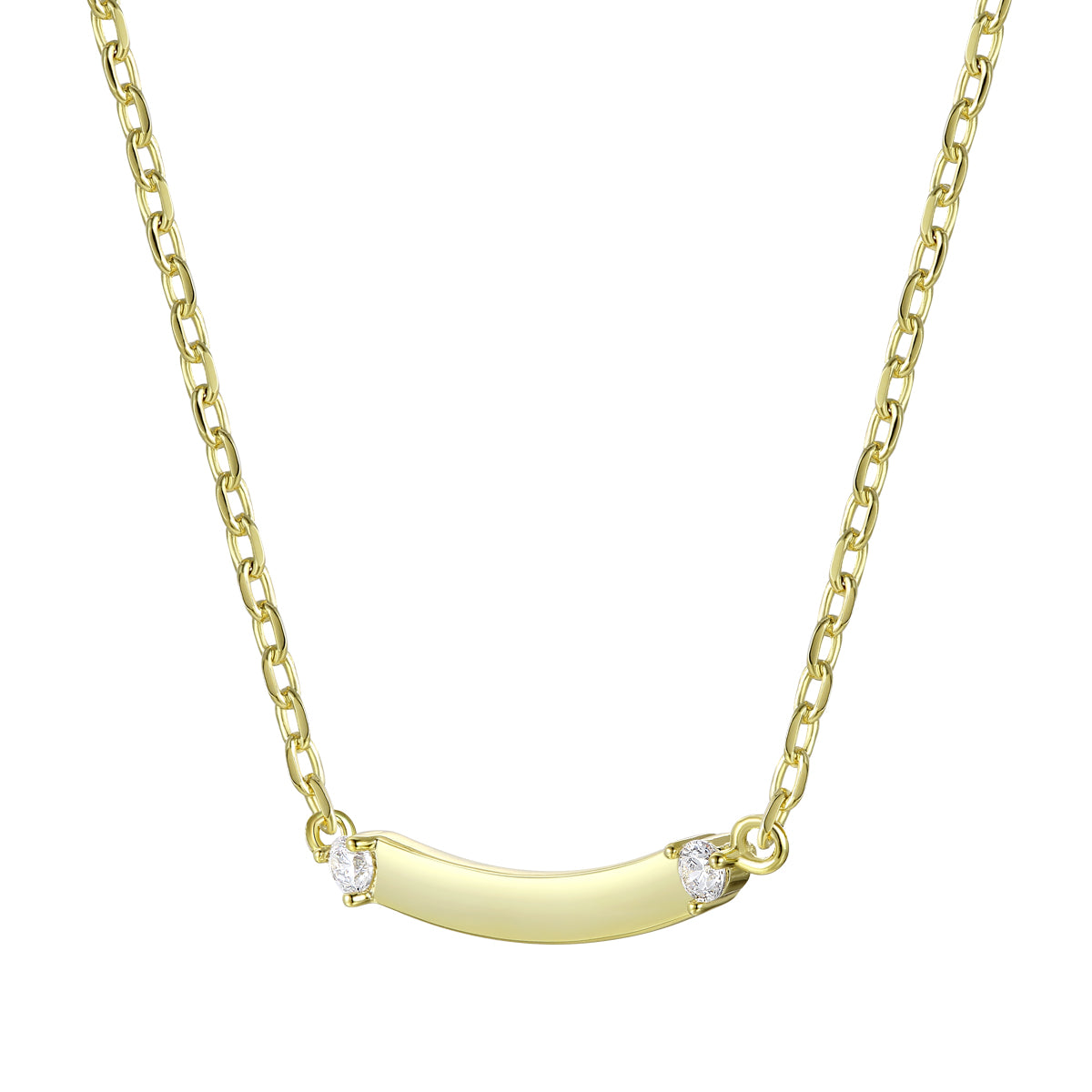 Elegant 14K Gold Plated Cubic Zirconia Curved Bar Necklace. This item features a simple design that is made out of rounded bar made out of solid metal accented with clear round cubic zirconia stones on both sides and connected to chain. Crafted with 14K Gold Plating and it is secured with spring ring closure. Perfect piece of jewelry for stylish combinations. This item also makes a great gift as well.