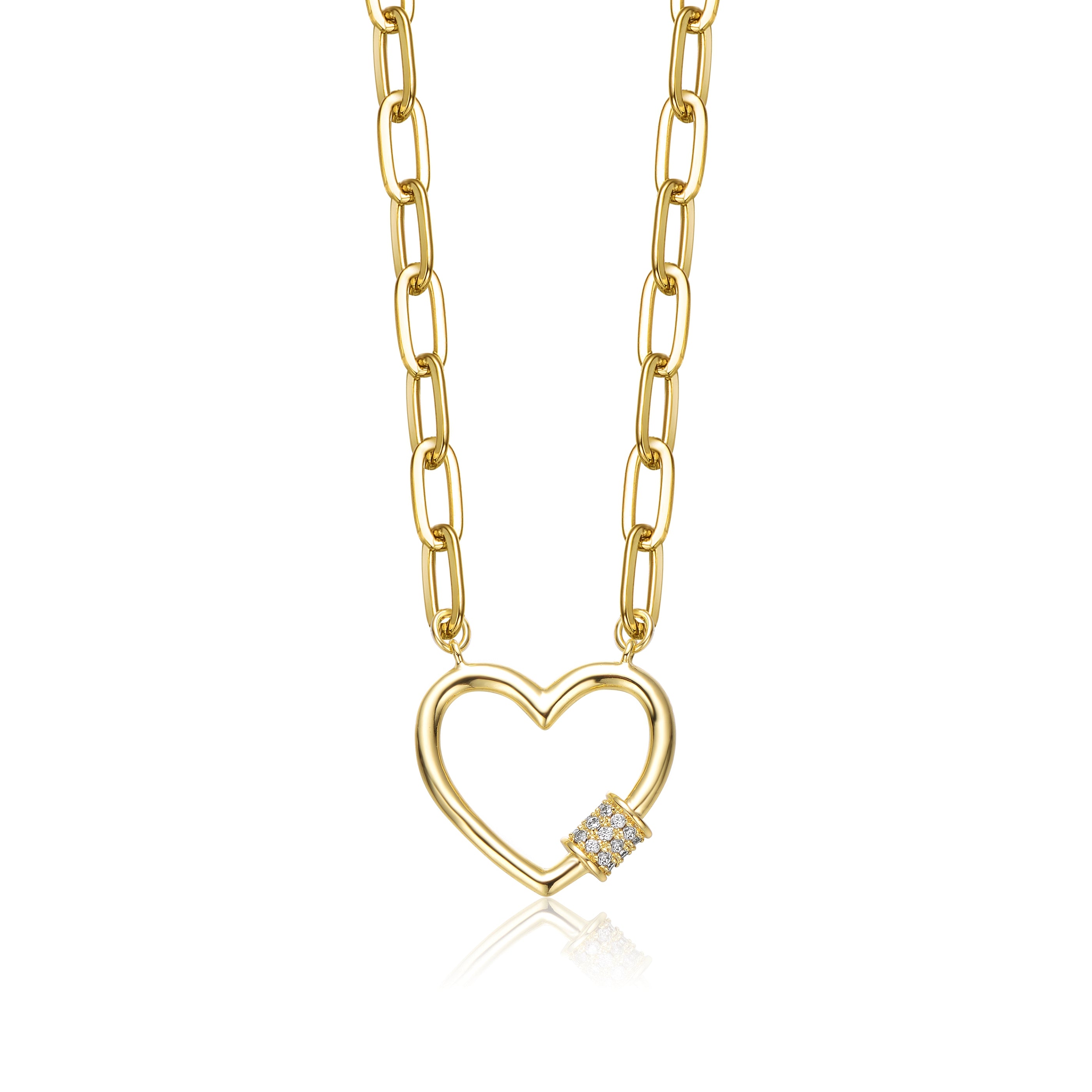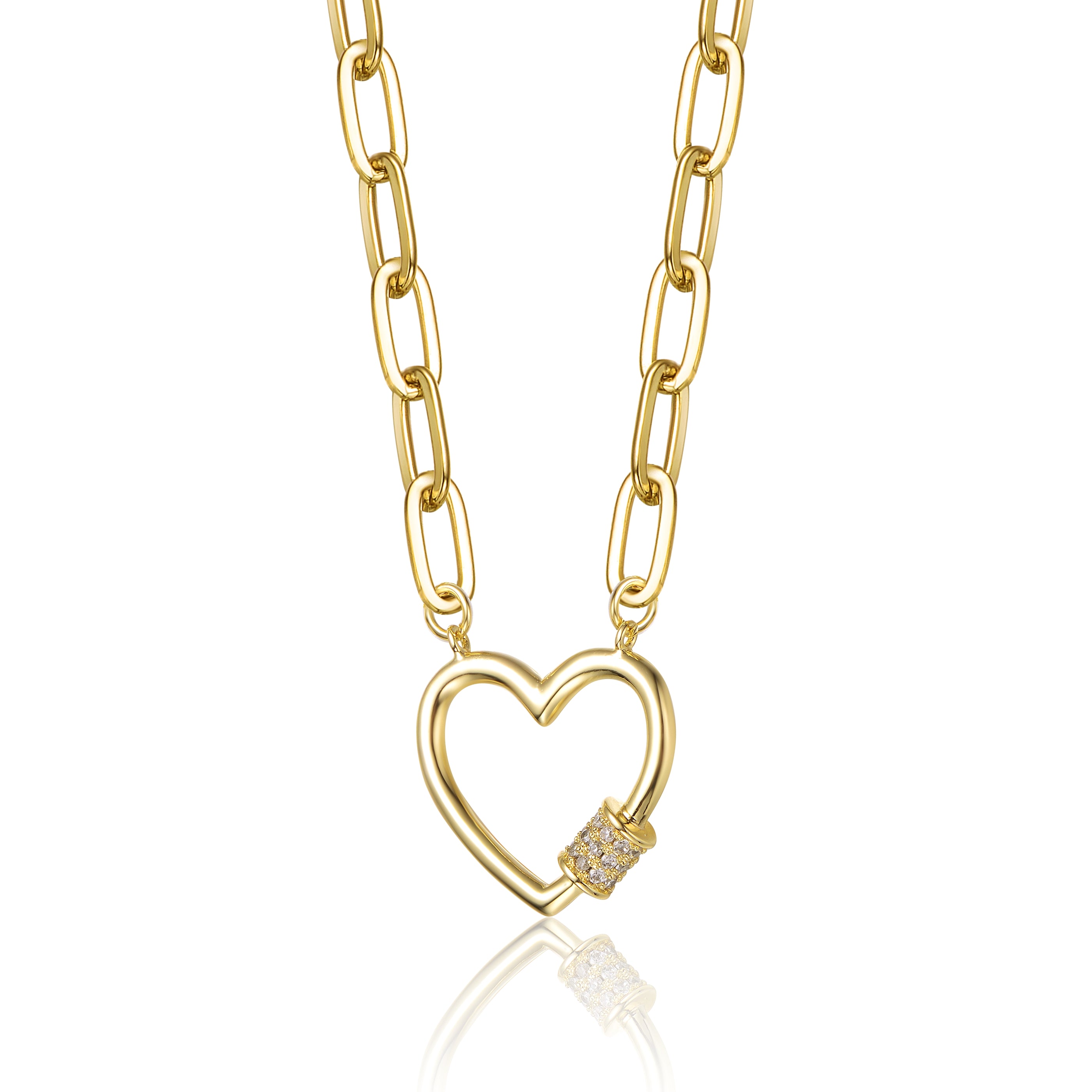 Classy 14K Gold Plated Cubic Zirconia Charm Necklace. This stylish item features interesting heart charm design that is accented with small clear round cubic zirconia stones placed on one side of the heart charm. The charm is connected to a paper clip link chain on both sides. Crafted with 14K Gold Plating and secure with a lobster claw closure. Perfect piece of jewelry for all combinations. These also make a sensational gift for a special birthday or occasion.