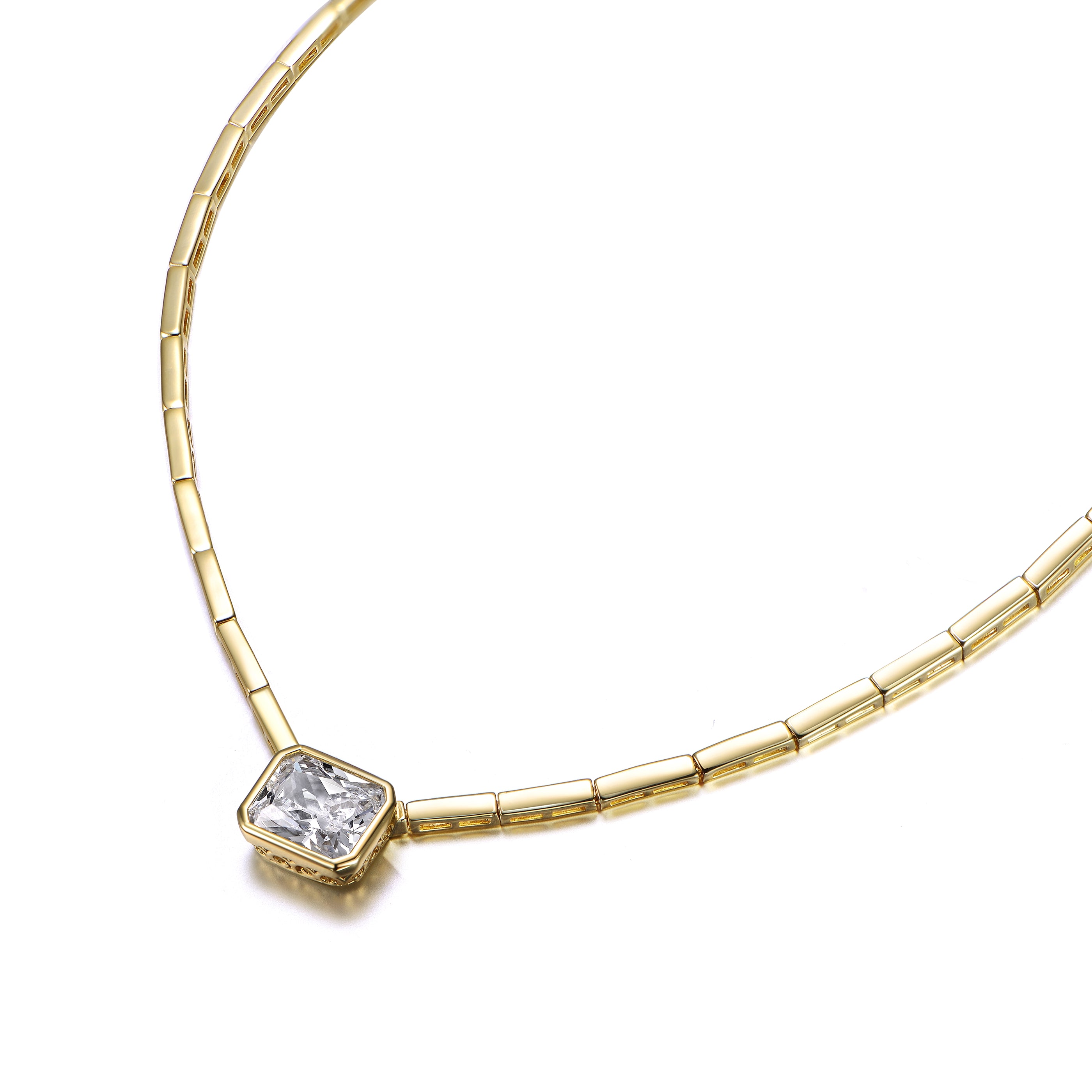 14k Gold Plated Emerald Cut Cubic Zirconia East-West Solitaire Necklace. Add the ultimate finishing touch with this brightly polished 14k gold plated necklace featuring a shimmering emerald cut cubic zirconia solitaire in an east-west (sideways setting). A shiny bar link chain adds a modern look to this classic pendant style. Necklace measures 16" long with a fold-over clasp for your convenience; add lightweight chains for a layered style if desired.