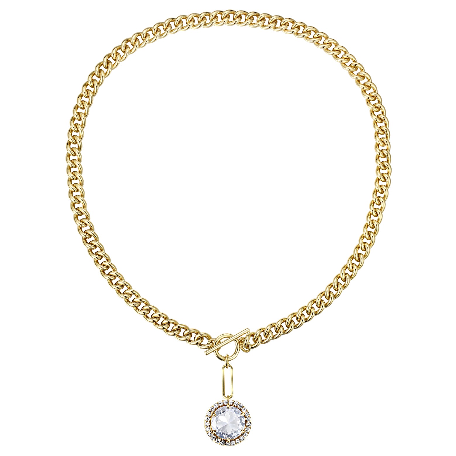 14k Gold Plated with Clear Cubic Zirconia Halo Drop Curb Chain Necklace. Crafted with meticulous attention to detail, this piece seamlessly blends classic charm with modern allure. The substantial 14k gold-plated chain, composed of closely interlinked loops, creates a smooth, tactile feel against your skin. Its lustrous finish catches the light, adding opulence to any ensemble. Suspended from the chain is a circular pendant showcasing a brilliant, clear cubic zirconia(April birthstone)with a halo design of small clear cz. Expertly faceted to enhance its sparkle, the gemstone captivates from every angle.