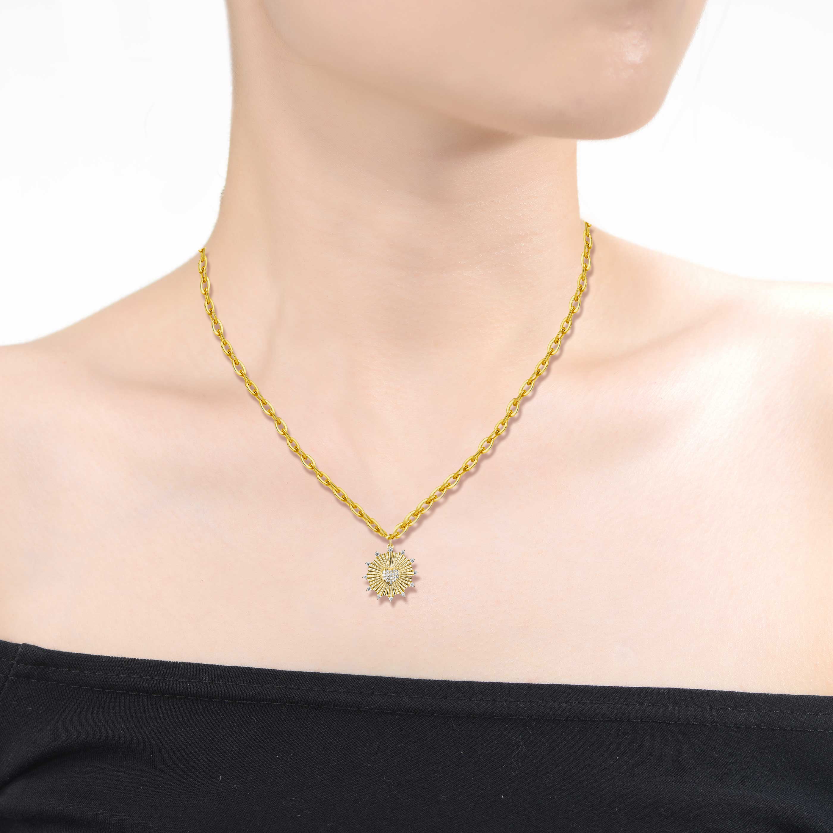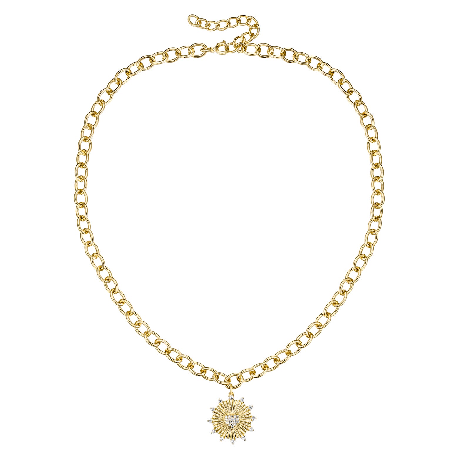 This lavish curb chain necklace features a dimensional sunshine shield pendant sparkling with round brilliant cut cubic zirconias. This pendant sits on a tiny ring bail, making it the main focal point. A spring ring clasp and extension chain keep this 14k gold plated necklace secure.