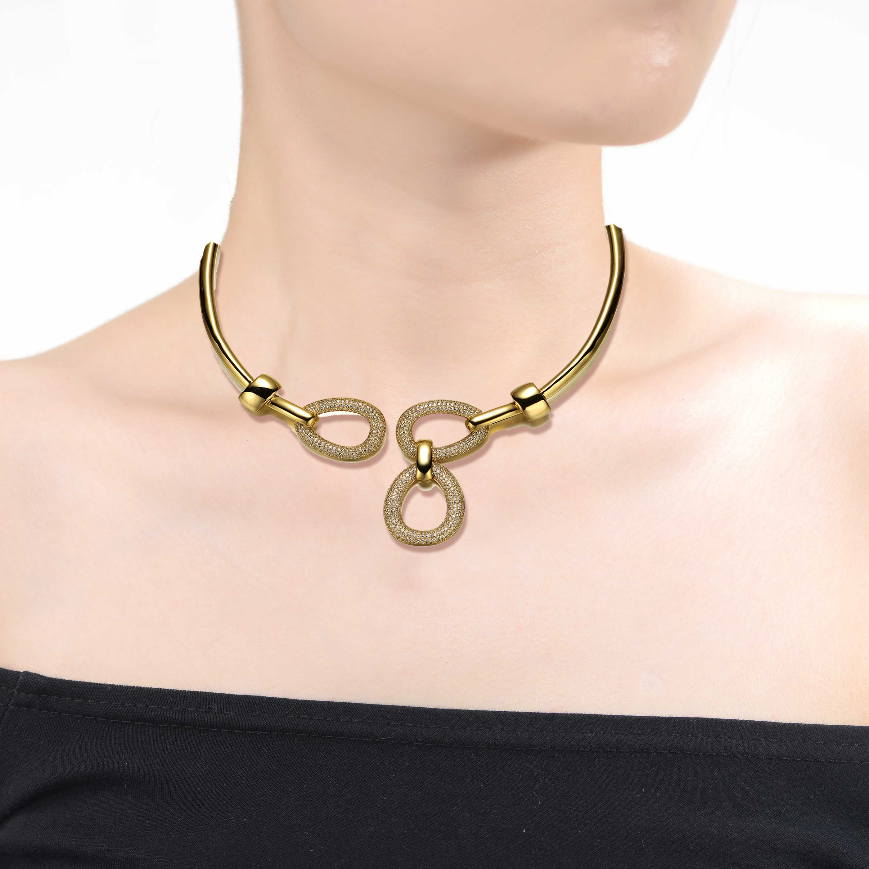 14k Yellow Gold Plated Modern Triple Mesh Drop Open Collar Choker Necklace. Add modern luxury to your wardrobe with this brightly polished 14k yellow gold plated stiff open collar necklace. Three open mesh links give this choker a contemporary style, perfect for upgrading your look to next-level elegance. A hinge on the back makes it easy to place on and remove from the neck, making it your newest favorite and in line with today's hottest trends.