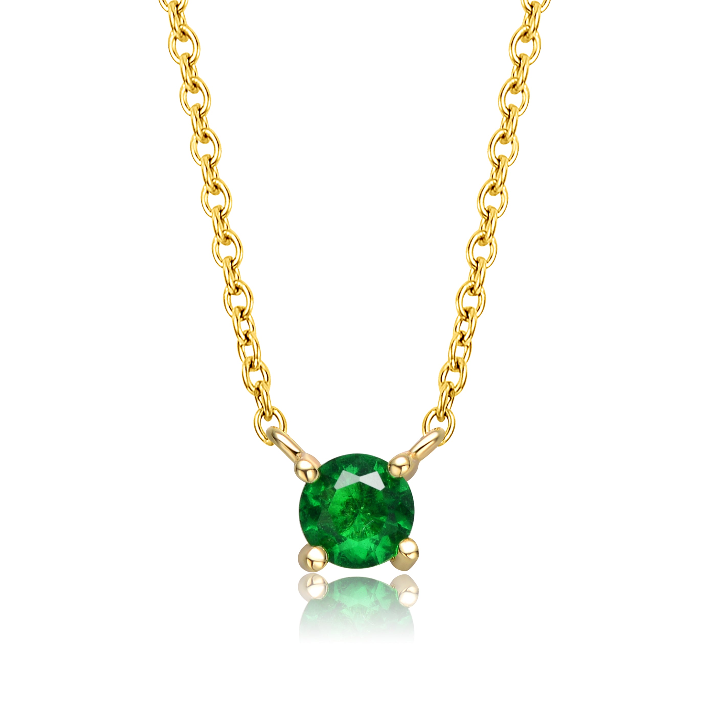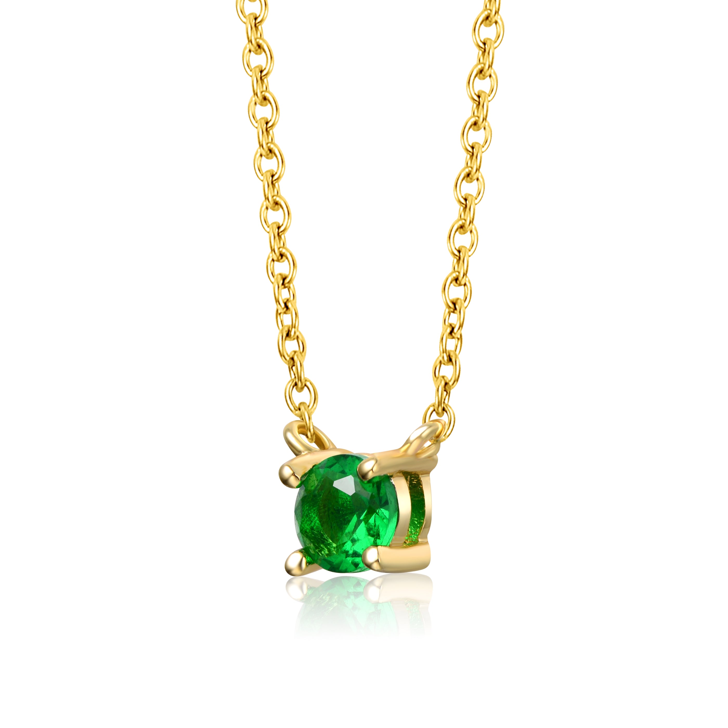 This classic 14k yellow gold plated solitaire Necklace design compliments any outfit, from daytime to evening. The faceted emerald green cubic zirconia stones sparkle in the light and are carefully fastened onto strong steel posts.