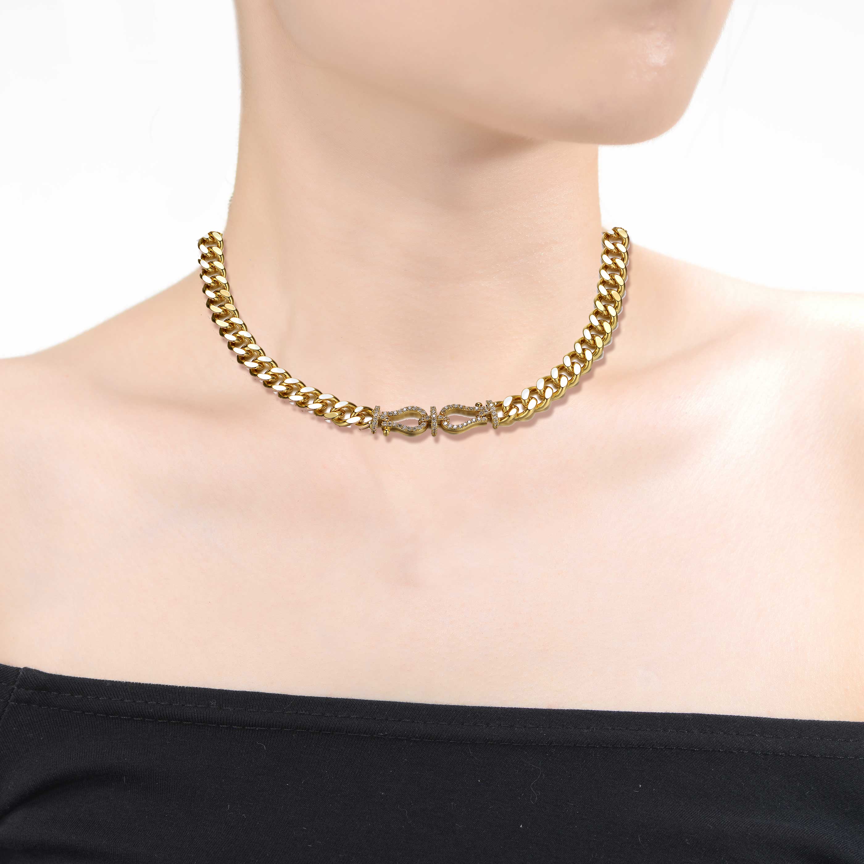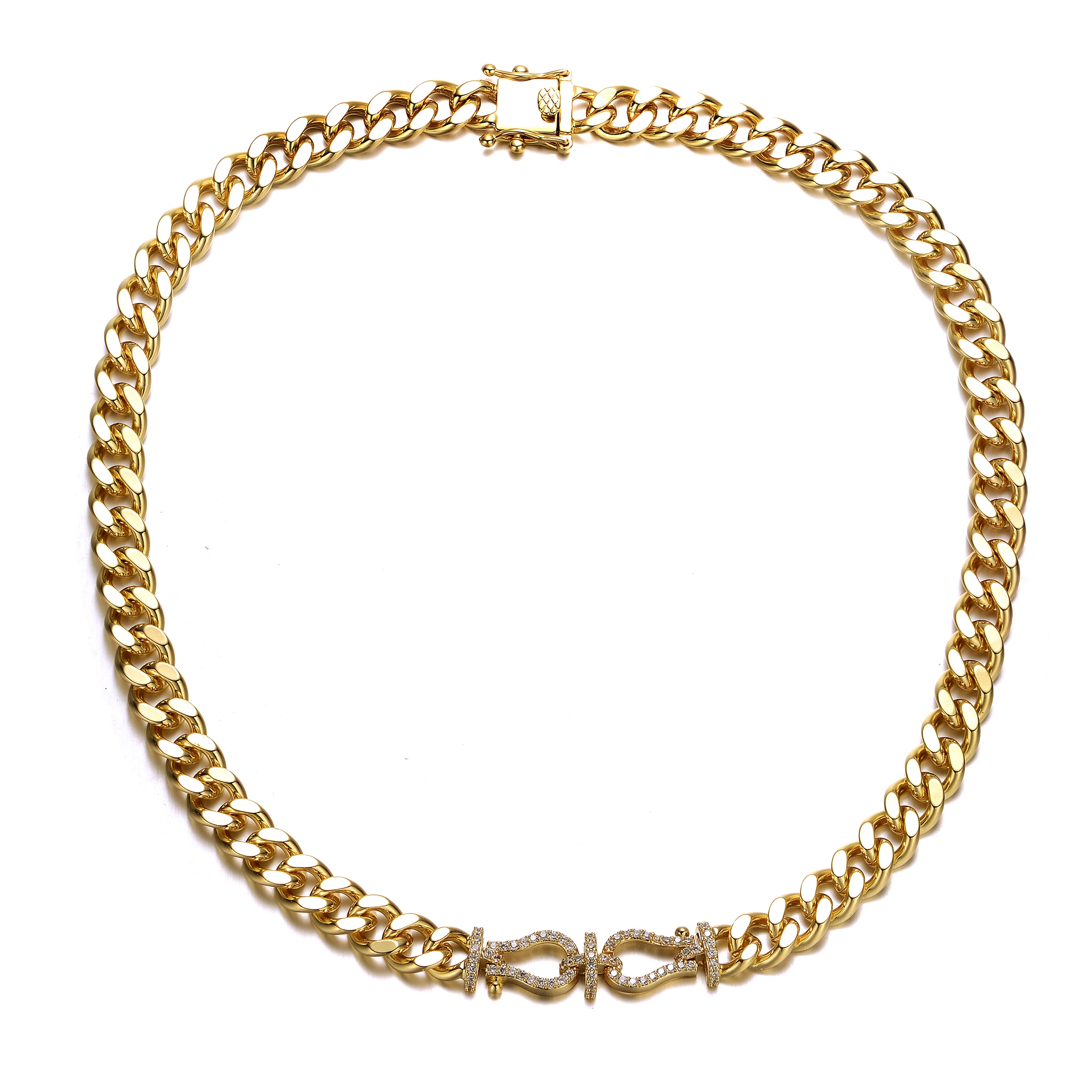 14k Yellow Gold Plated with Cubic Zirconia Miami Cuban Chain Door Knocker Necklace. This bold and sleek necklace is finely crafted in brightly polished 14k yellow gold plating, adding a luxurious finishing touch to your look. A classic Miami Cuban/curb chain gives it a contemporary vibe complemented by a classic door knocker design on the front studded with round brilliant cut cubic zirconias. A box clasp keeps this statement-worthy chain necklace in place.
