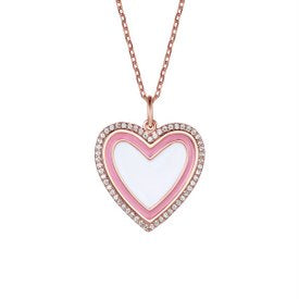 This sweet little heart pendant sparkles with round brilliant cut cubic zirconias complemented by pink and white enamel in concentric frames, giving it a vintage inspiration. A ring bail with a box chain threaded through makes this 18k rose gold plated necklace ready for wear, secured by a lobster clasp.