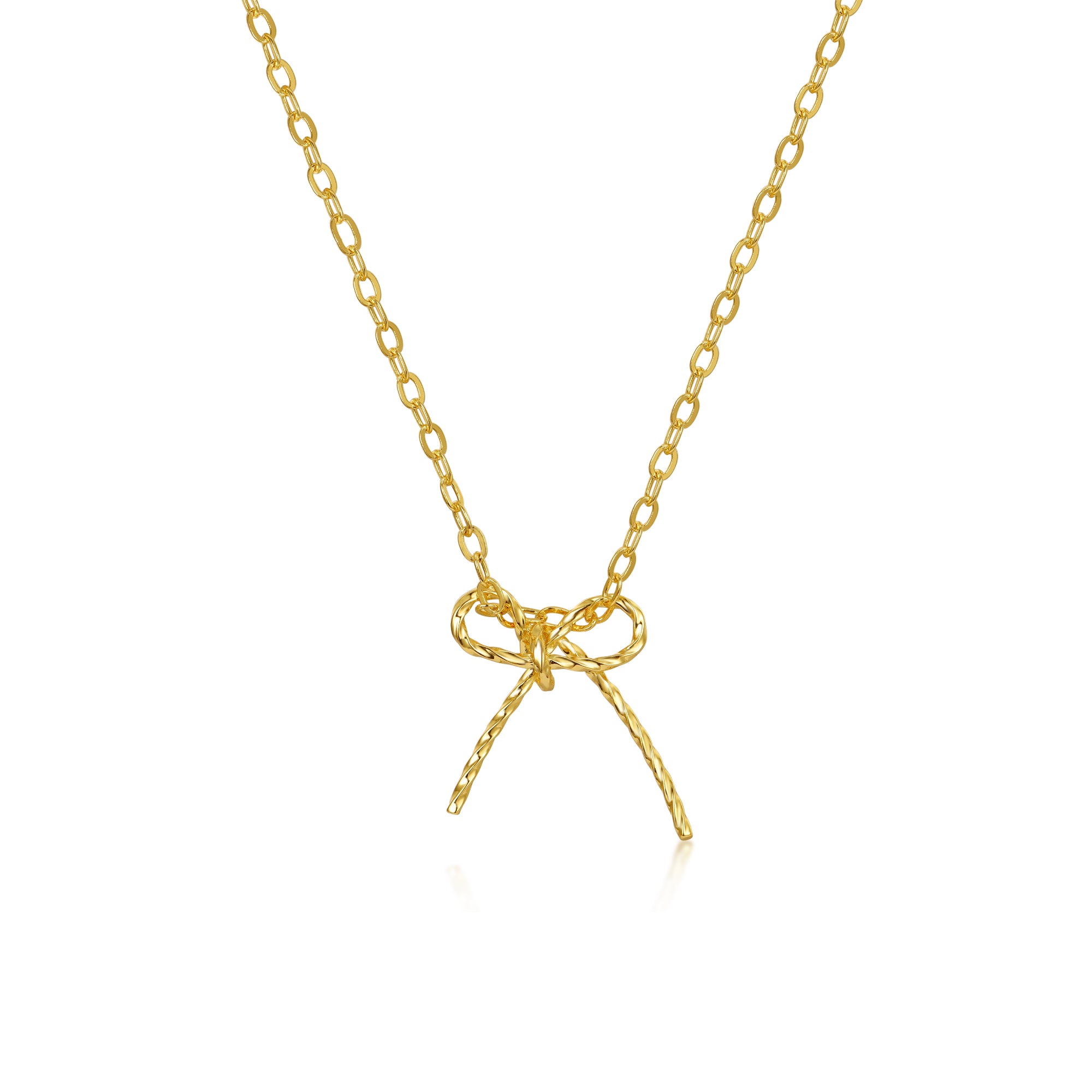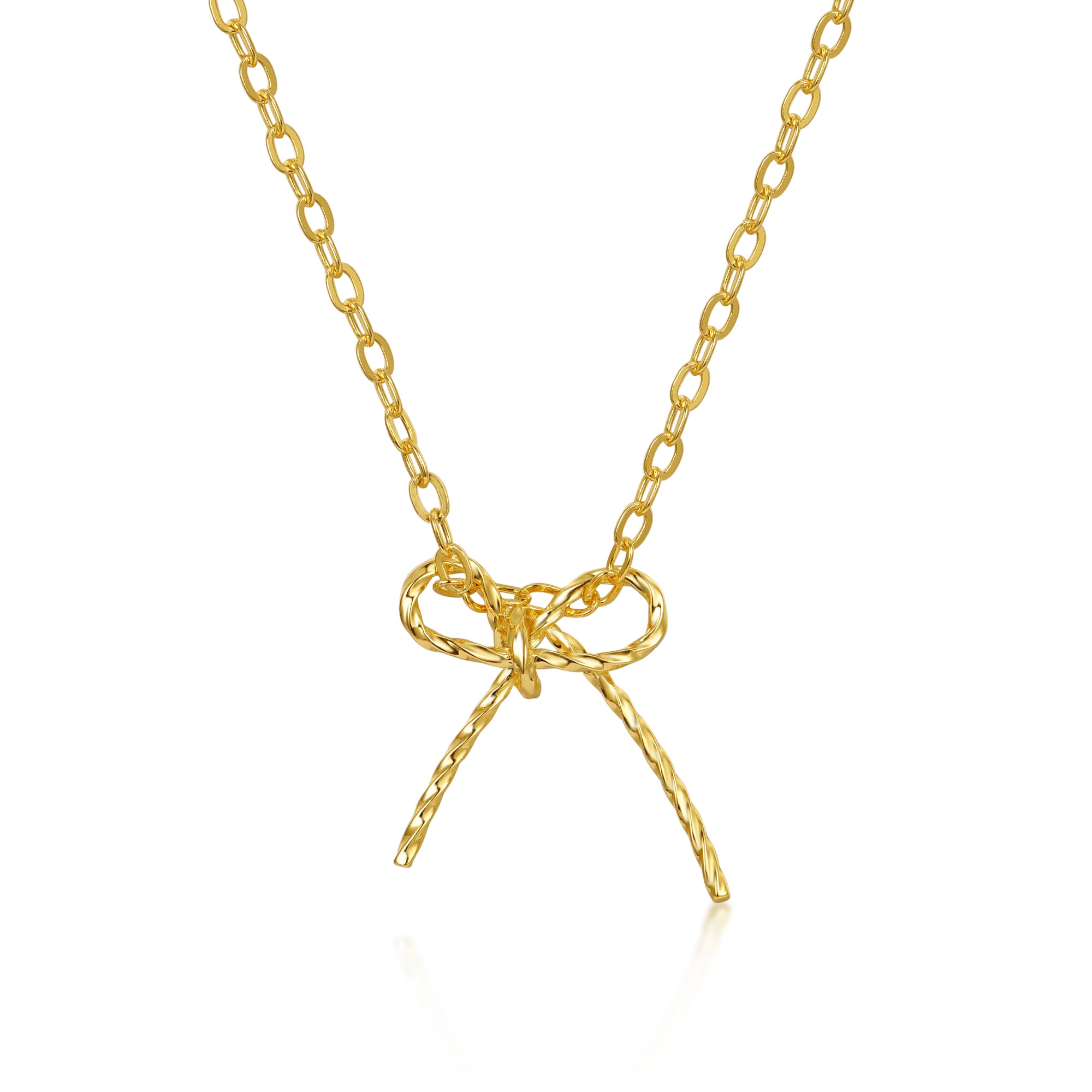 Give a beautiful gift to those who are most precious! This necklace features a graceful ribbon bow-tie pendant on a cable chain, making it a sentimental design. A lobster clasp keeps it secure, with the necklace all crafted in 14k gold plating.