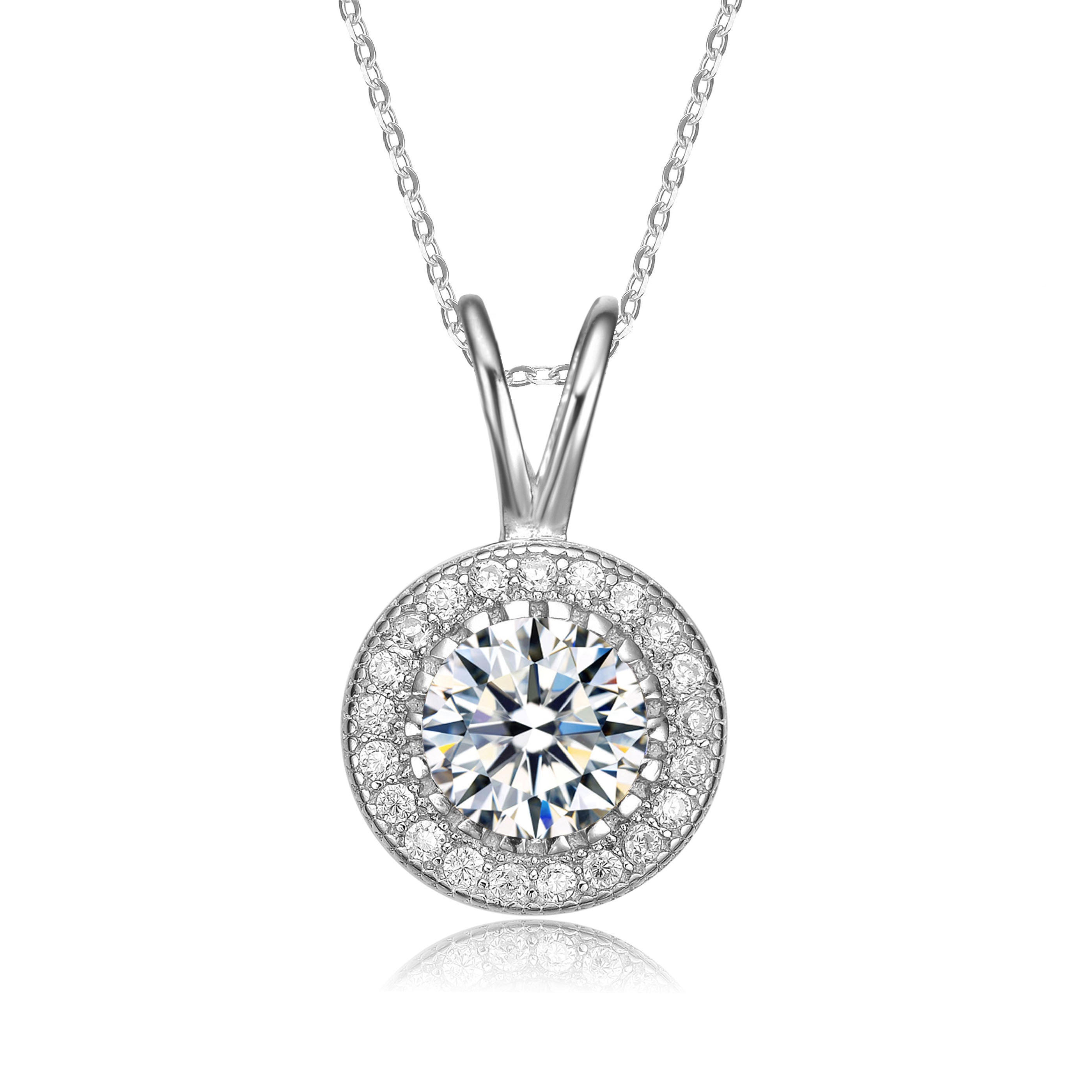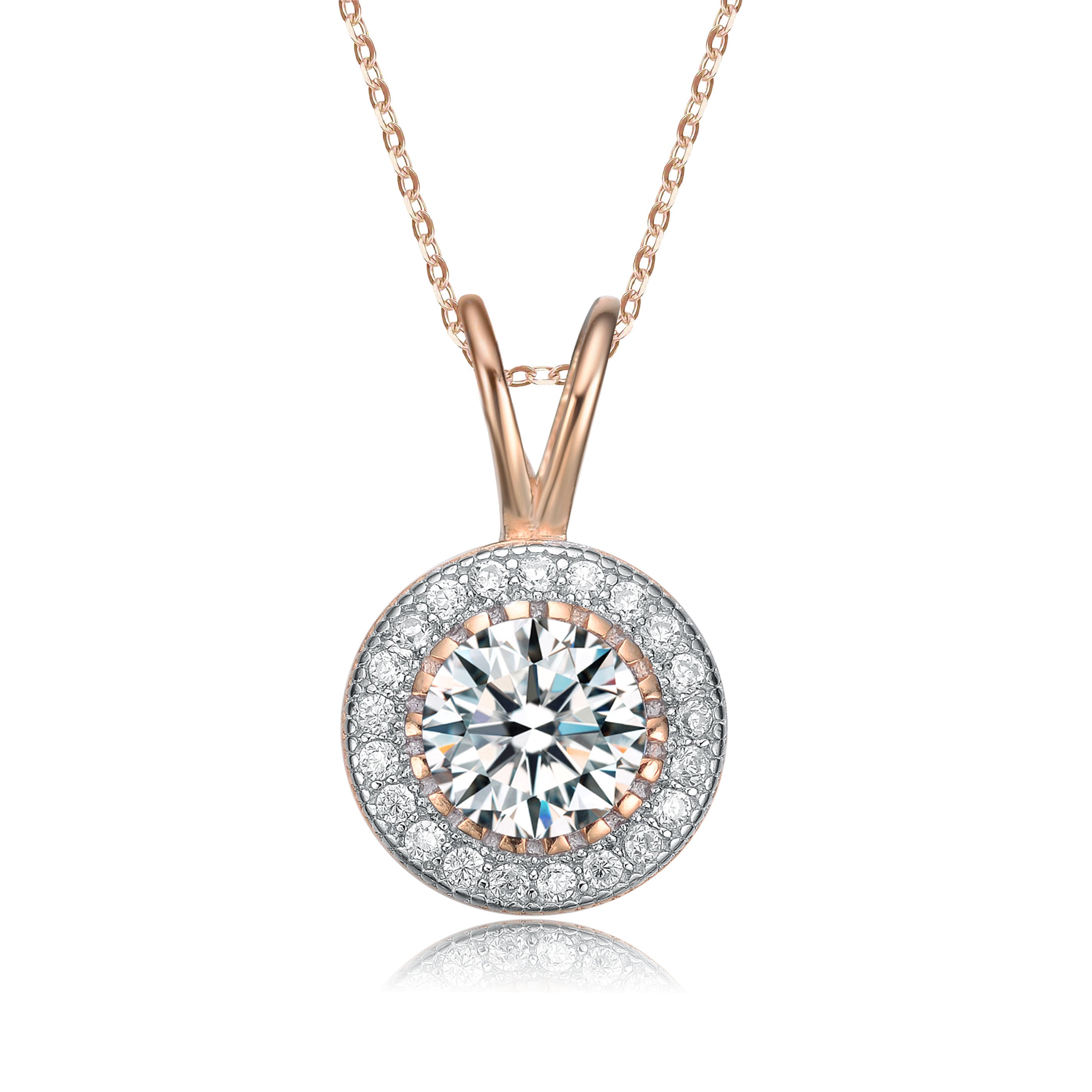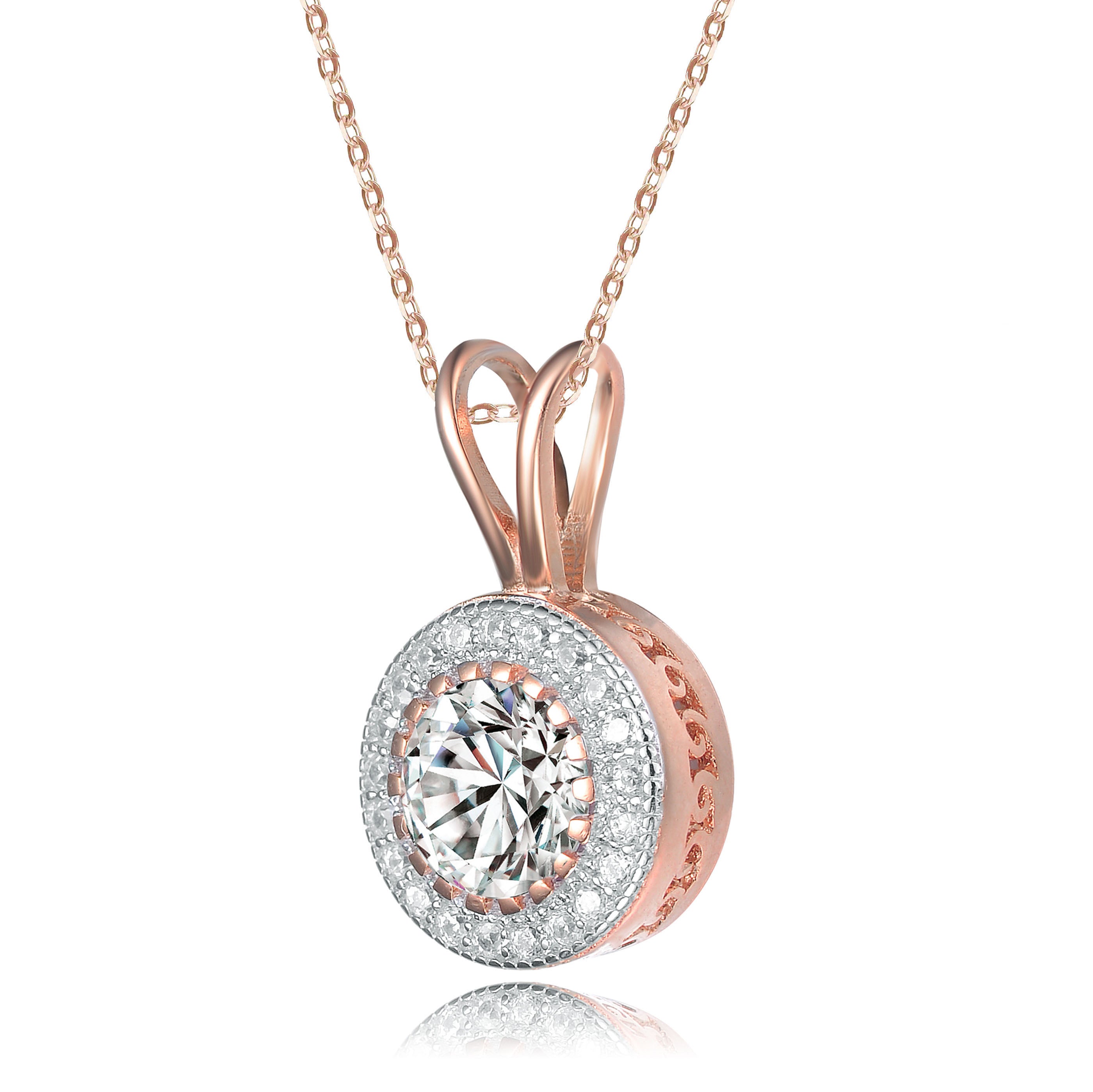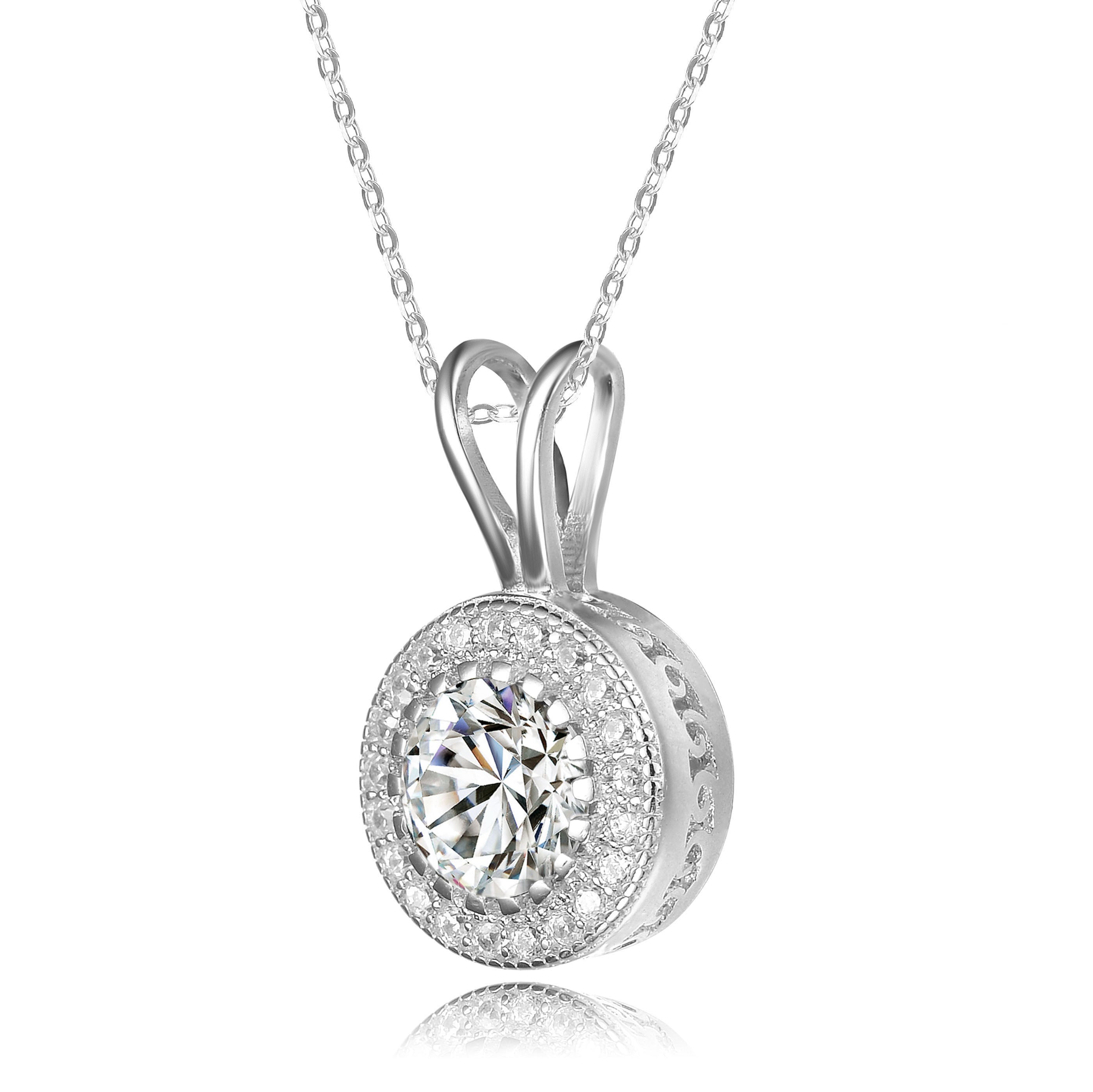 This dainty pendant features a sparkling white round-cut cubic zirconia stone outlined with smaller ones. Crafted of Rhodium Plating this pendant necklace is available in rhodium plating or 18k rose gold plating. It secures with a spring ring.