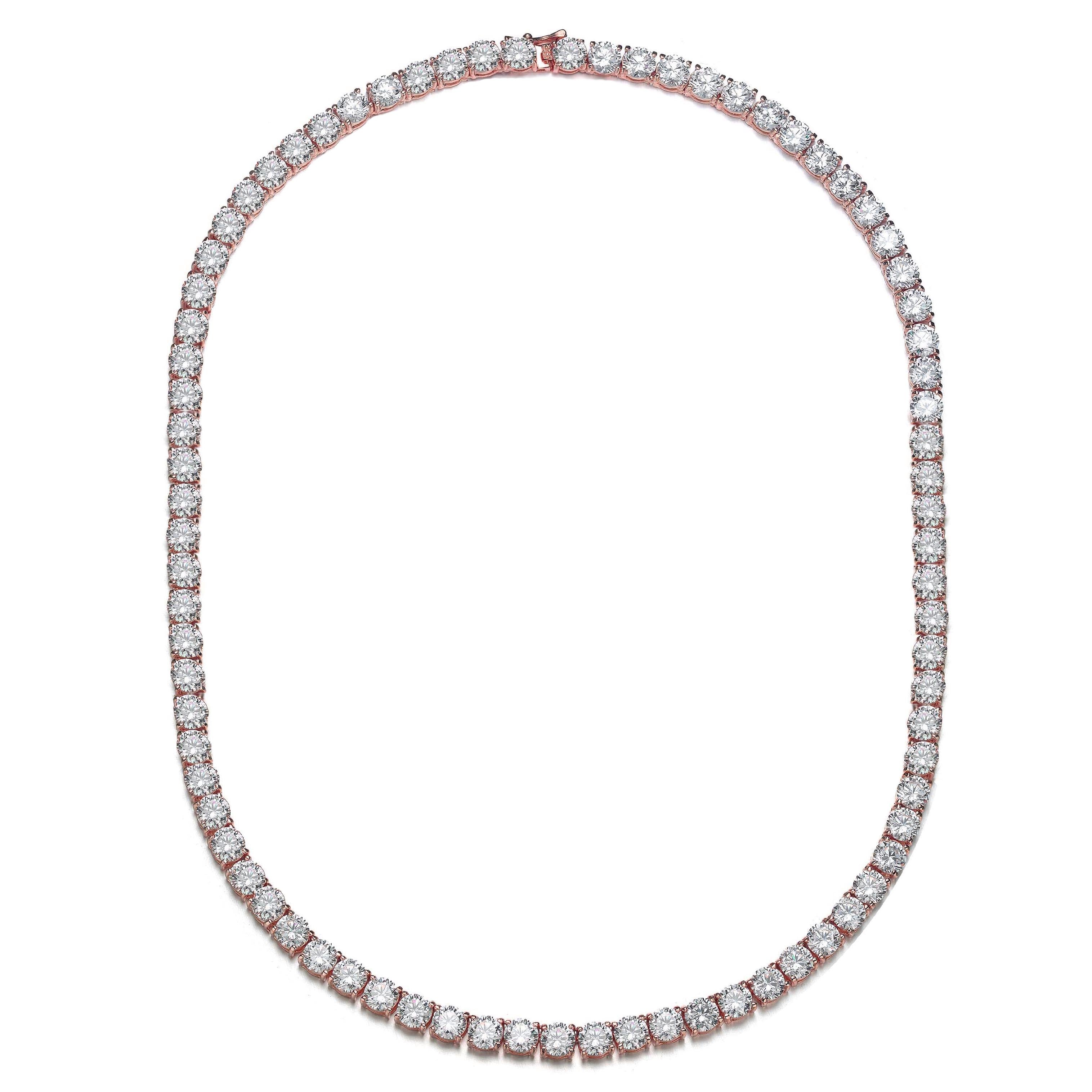 This classic tennis necklace features dazzling clear round Cubic Zirconia that sparkles in every angle. Crafted of Rhodium, 14k gold, or rose gold plating. the necklace secures with a box clasp.
