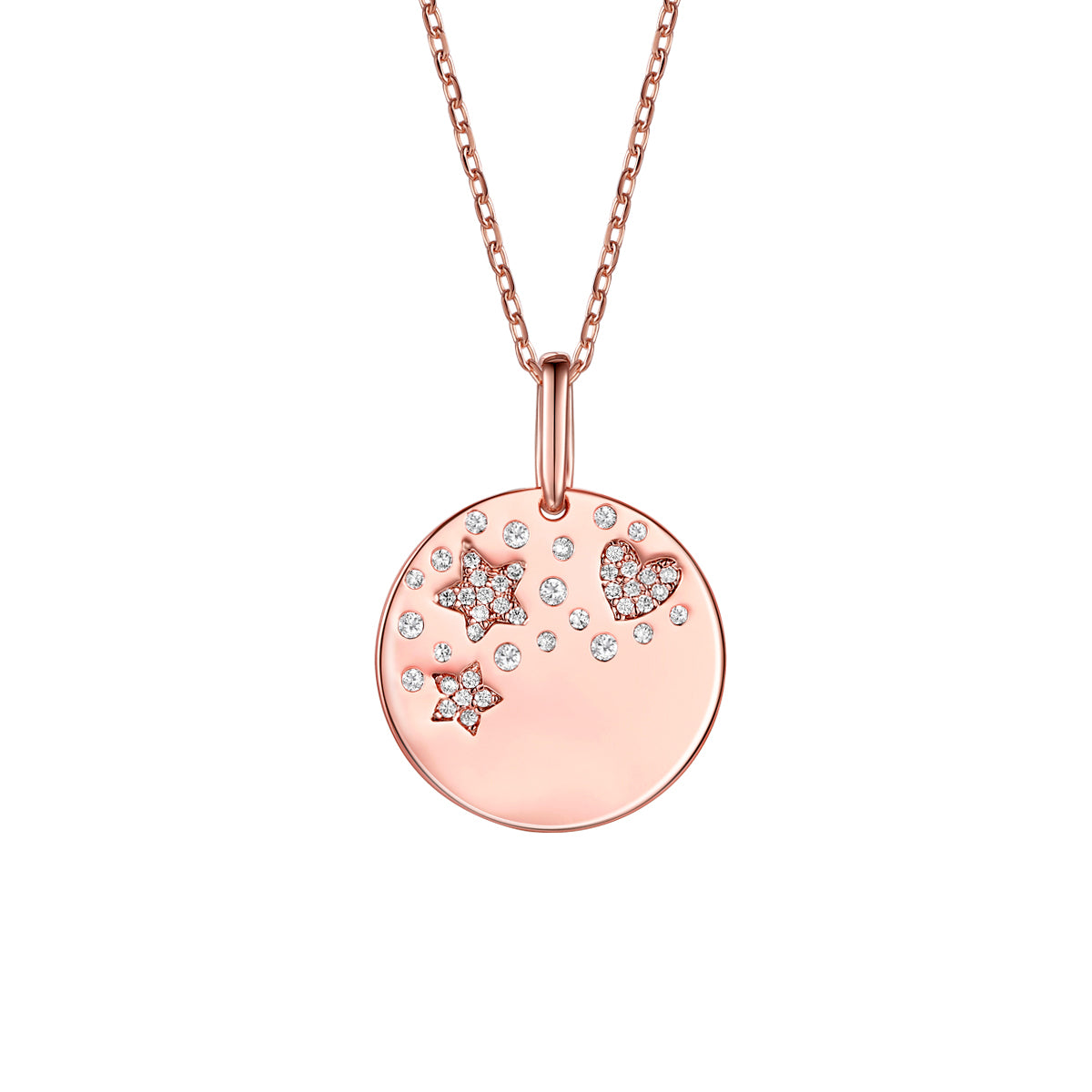 | Shoot for the stars! This brightly polished necklace features sweet stars and a heart shape sparkling with round brilliant cut -like cubic zirconias dusting the medallion pendant. A scalloped oblong bail with a box chain threaded through finishes the design, secured by a lobster clasp and made in 14k gold or 18K rose gold plating. |