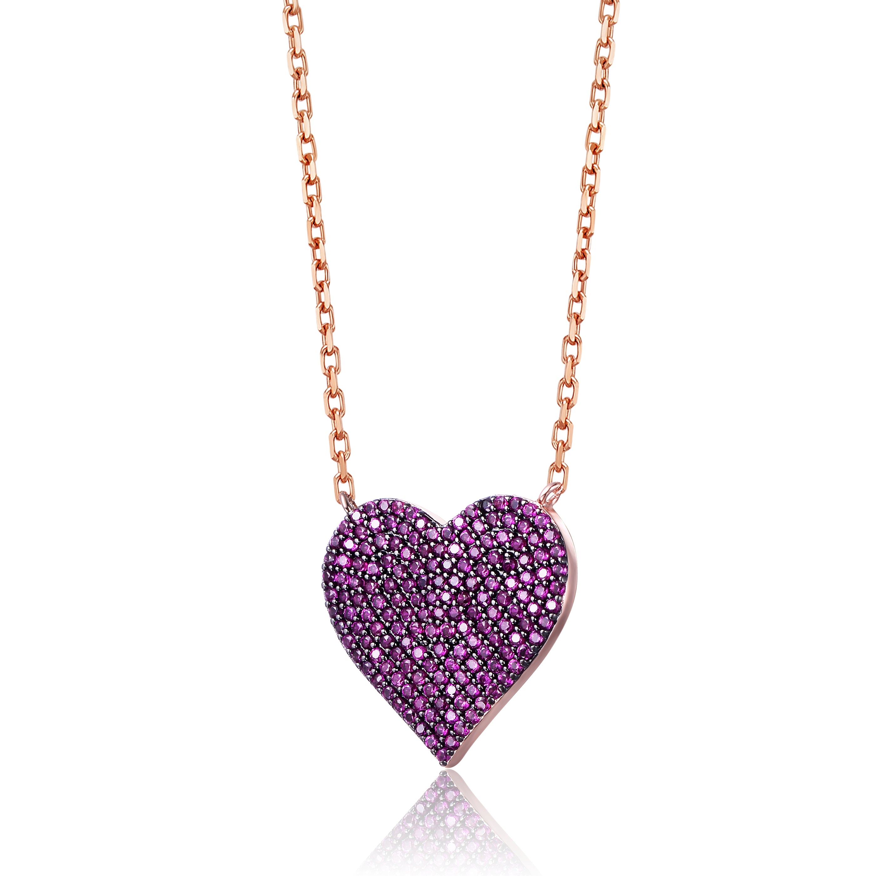 This stunning necklace features a heart-shaped pendant, meticulously adorned with ruby-colored cubic zirconia stones that offer a radiant sparkle. The pendant is attached to a delicate rose gold-plated chain, which complements the rich hue of the gemstones. The design of this necklace combines classic romance with modern elegance, making it a perfect choice for those seeking a piece of jewelry that makes a statement of love and sophistication