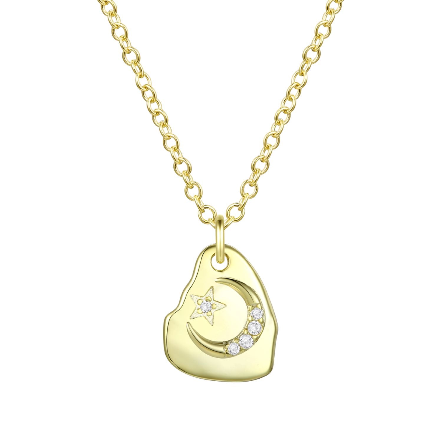 Delicate 14k gold plated cubic zirconia assymetrical star pendant necklace. This pendant features assymetrical bar charm design with engraved moon and star shape in the center, accented with clear round cubic zirconia stones, connected to a chain on the top. Crafted with 14k gold plating and secure with spring ring closure. This item also makes a sensational gift for a special birthday or occasion.