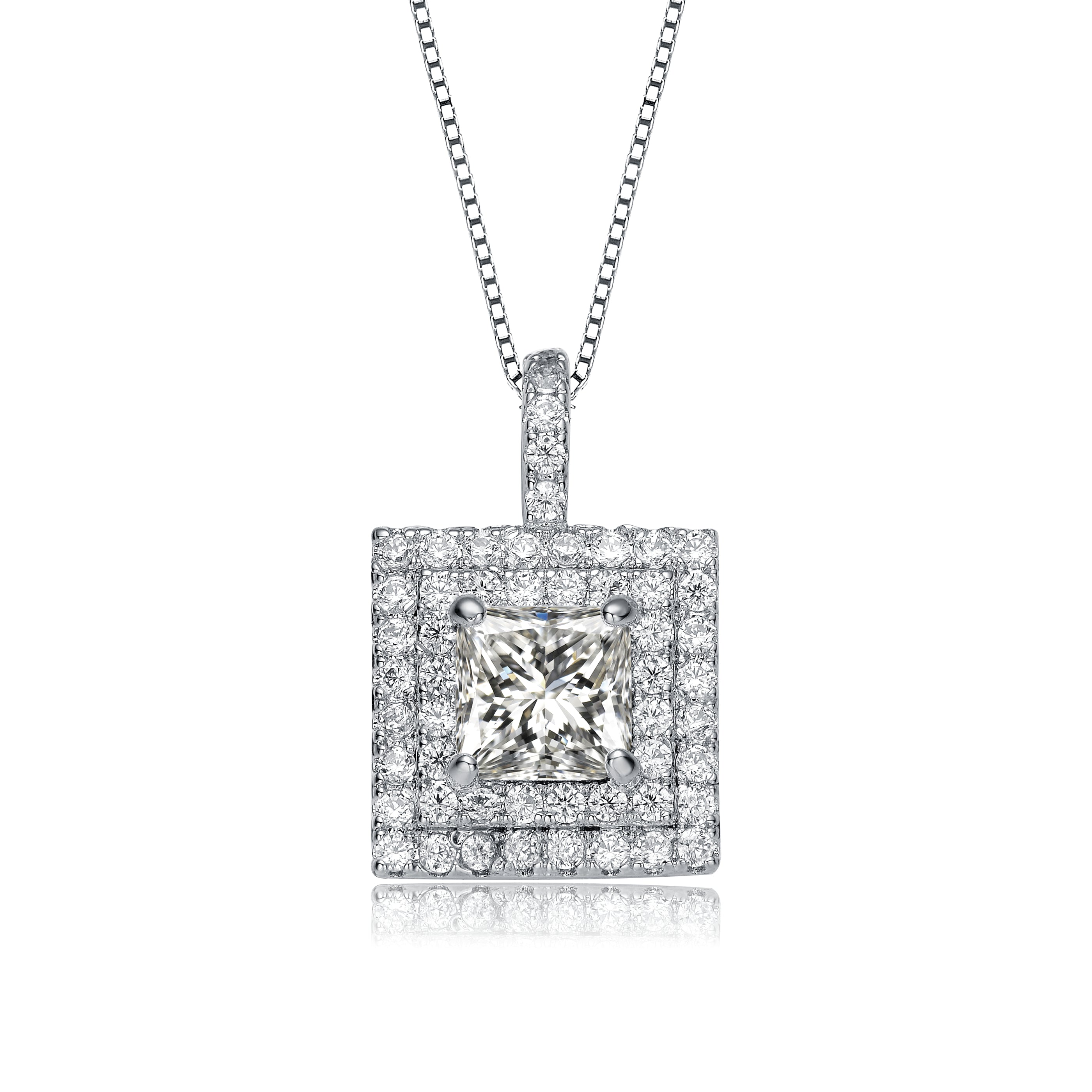 White gold plated with princess cut diamond cubic zirconia solitaire double halo cluster pendant necklace. Select this brightly polished white gold plated pendant necklace as a gift to any loved on, a token of romance and affection. A princess cut diamond-like cubic zirconia solitaire secured in the center with prongs complements a double-decker concentric halo cluster. A diamond-like cubic zirconia oblong bail suspends from a durable box chain, making this vintage-inspired necklace ready for wear. A lobster clasp keeps it in place.