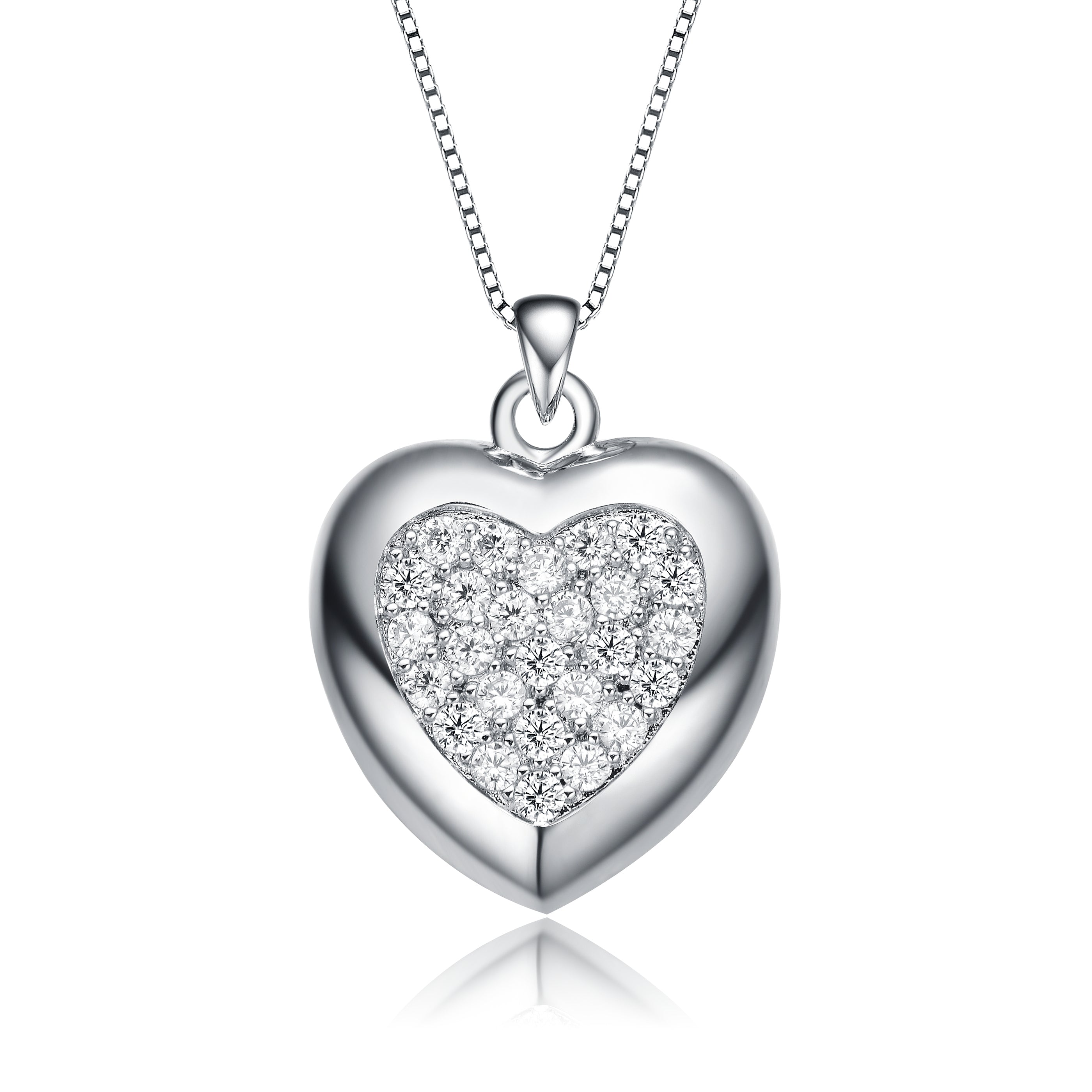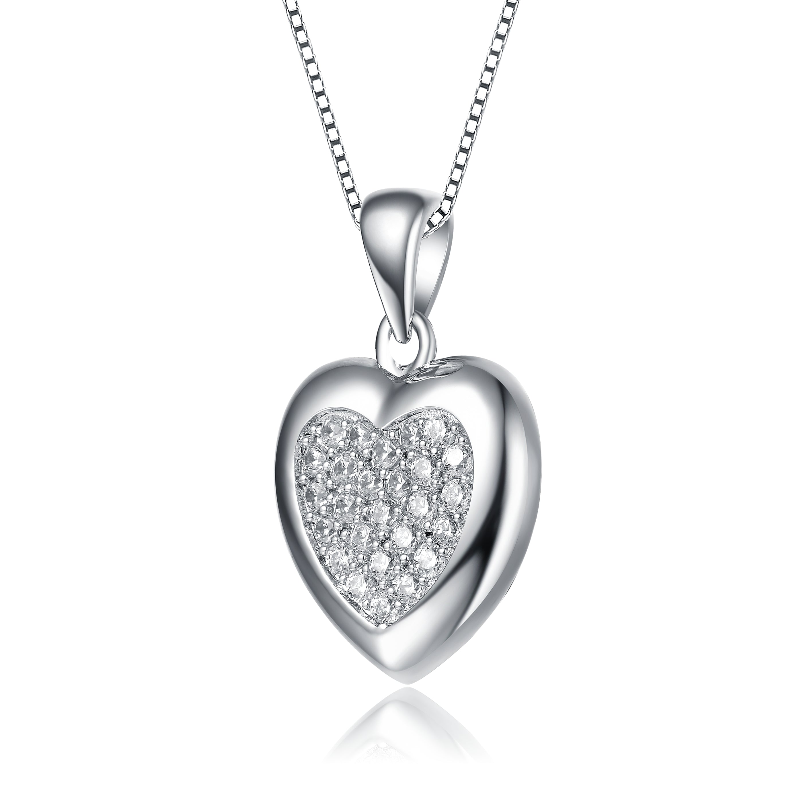 Fashionable and elegant Heart Pendant Necklace. This necklace is set on 18" chain and a pendant that features Rhodium heard shape and center of clear round Cubic Zirconia. This necklace set in Rhodium plated and has a spring ring closure.