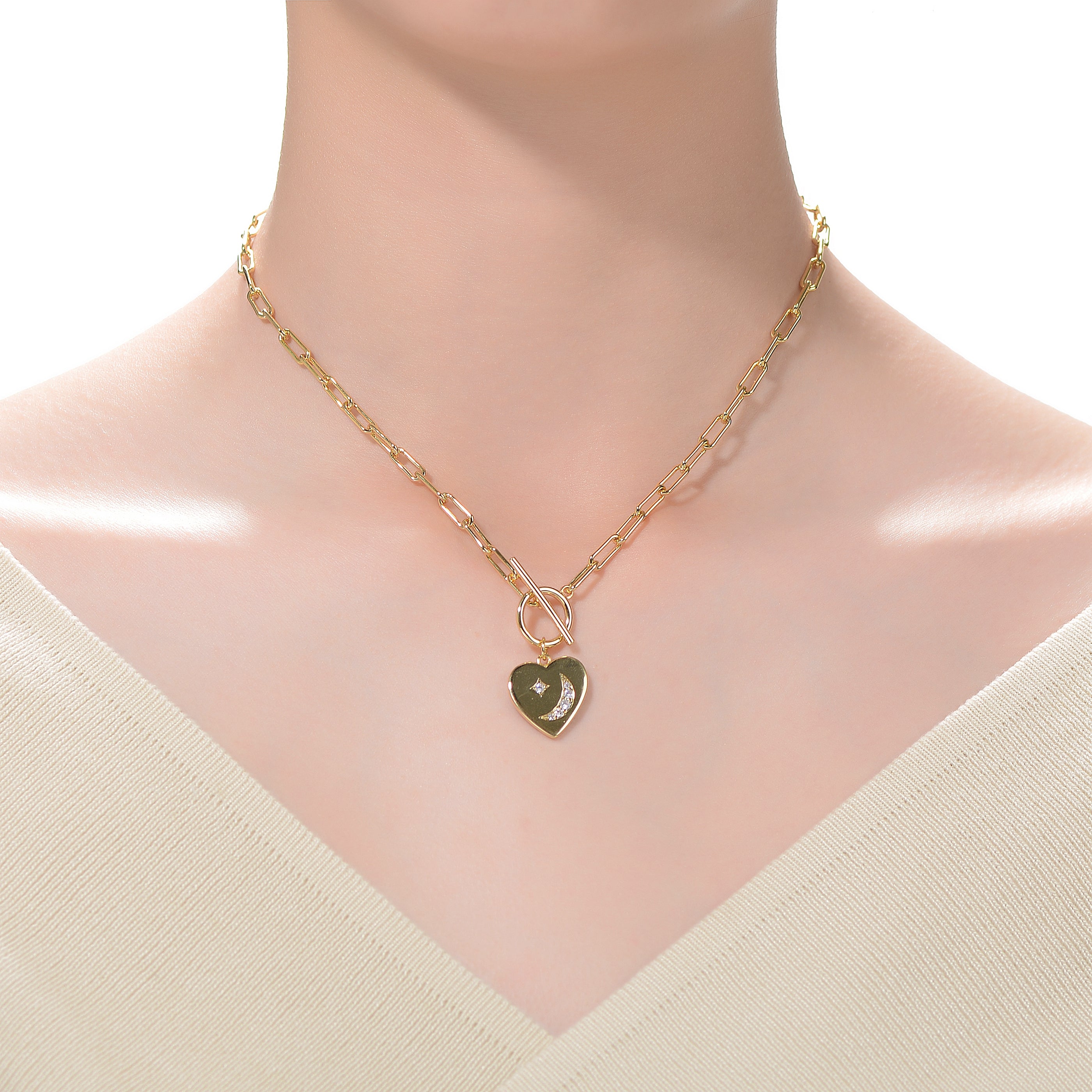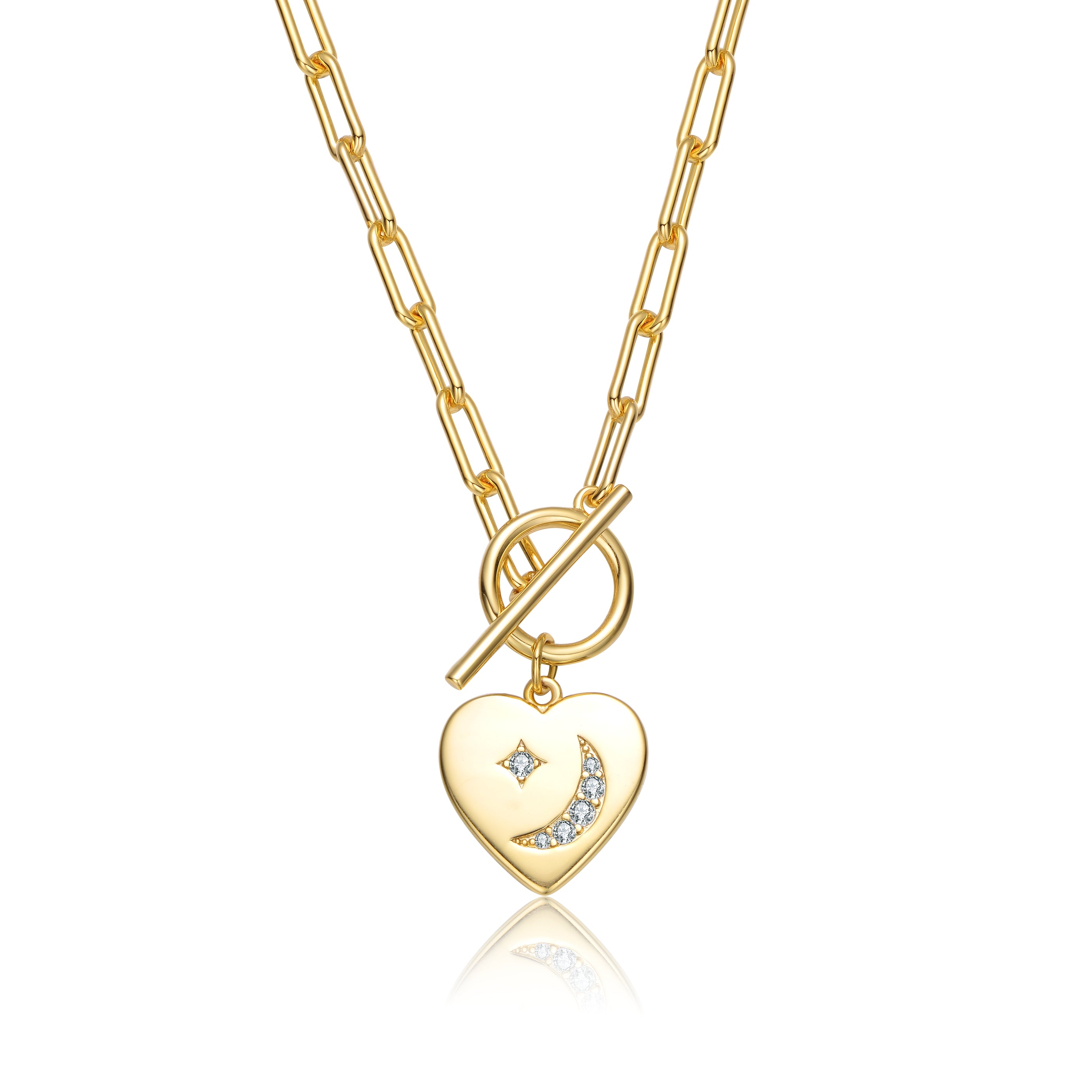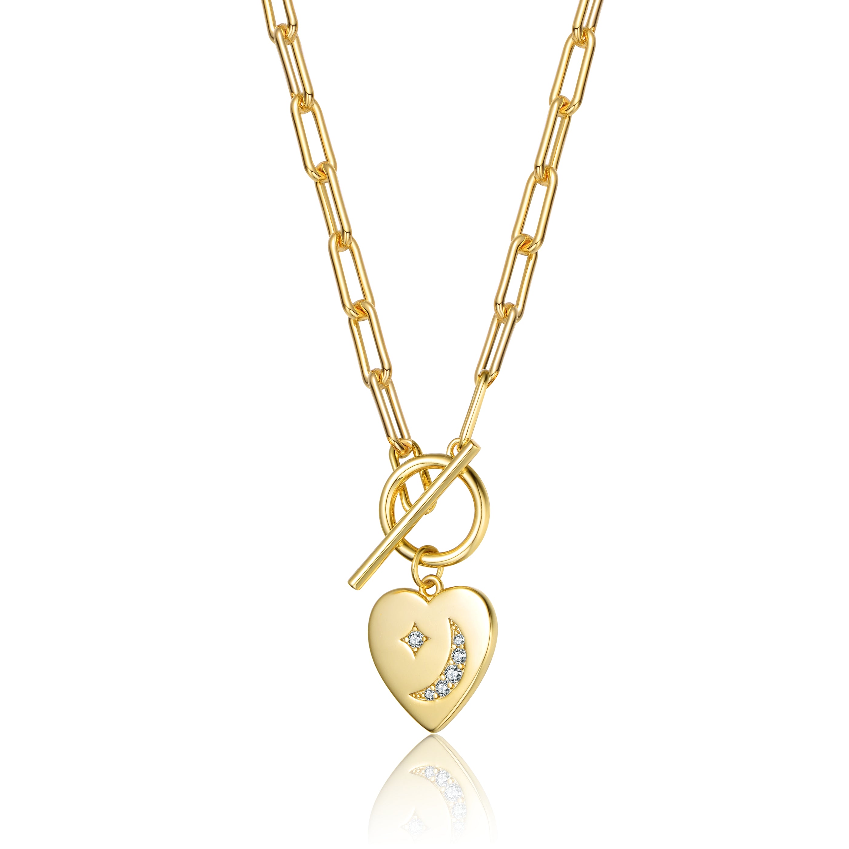 Classy 14k gold plated cubic zirconia charm necklace. This stylish item features interesting heart charm design made out of solid metal that is accented with moon and star in the center. The pendant is connected to a paper clip link chain . crafted with 14k gold plating and secure with a toggle closure. Perfect piece of jewelry for all combinations. These also make a sensational gift for a special birthday or occasion.