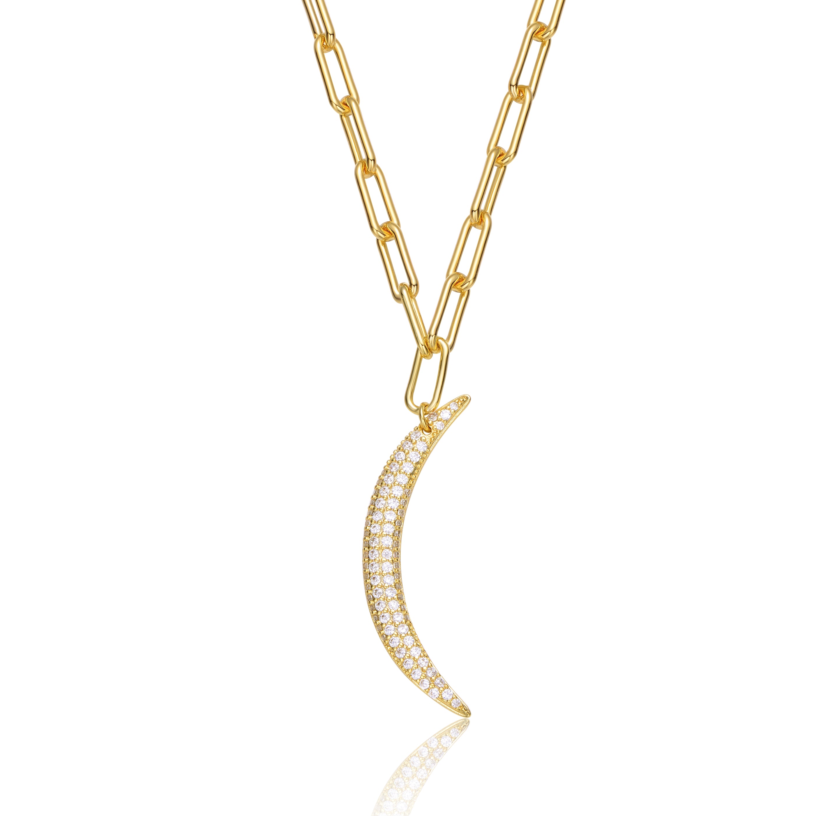 Stylish 14k gold plated cubic zirconia charm necklace. This stylish item features interesting moon charm design that is accented with small clear round cubic zirconia stones set on the entire moon shape. The charm is connected to a paper clip link chain on the top. crafted with 14k gold plating and secure with a spring ring closure. Perfect piece of jewelry for all combinations. These also make a sensational gift for a special birthday or occasion.