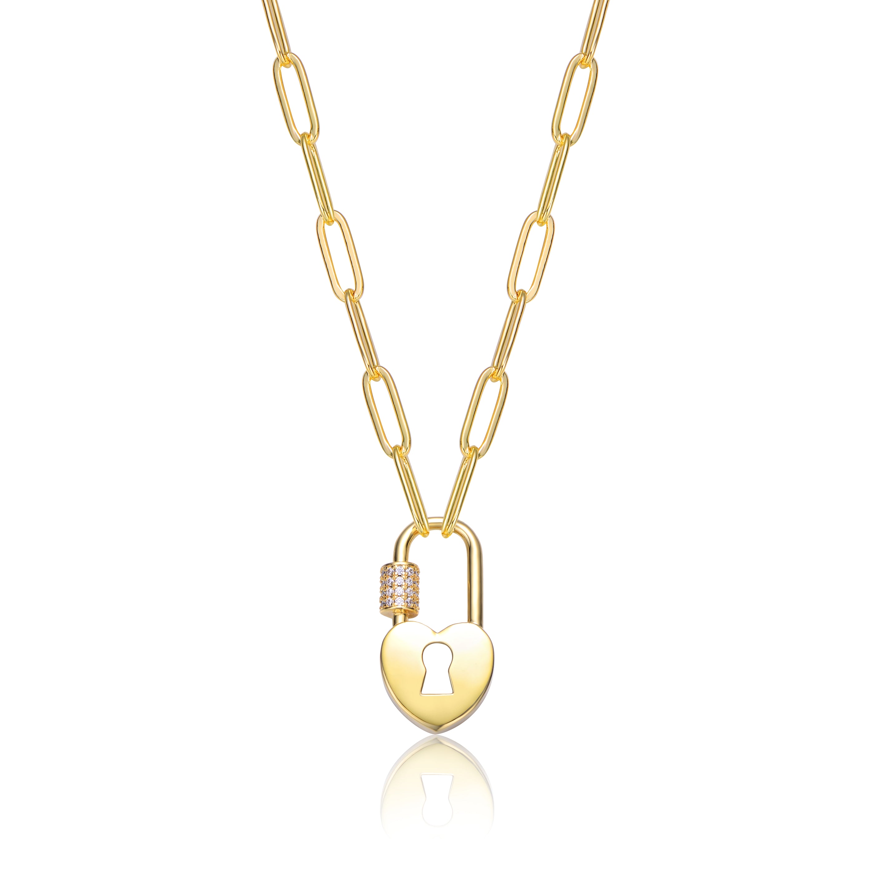 Elegant 14k gold plated cubic zirconia charm necklace. This stylish item features interesting heart locket design that is accented with small clear round cubic zirconia stones placed on one side of the locket. The charm is connected to a paper clip link chain on both sides. crafted with 14k gold plating and secure with a screw lock closure. Perfect piece of jewelry for all combinations. These also make a sensational gift for a special birthday or occasion.